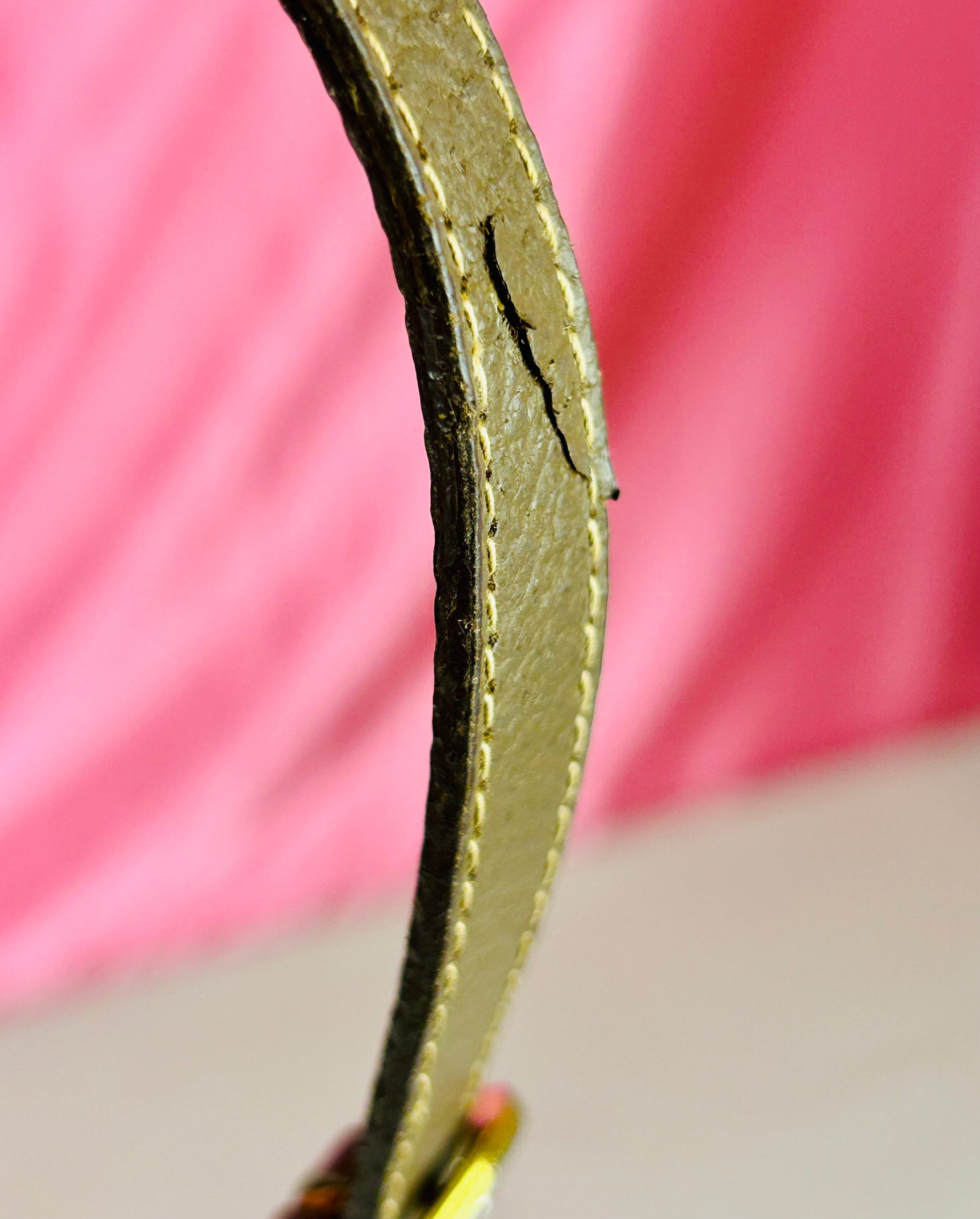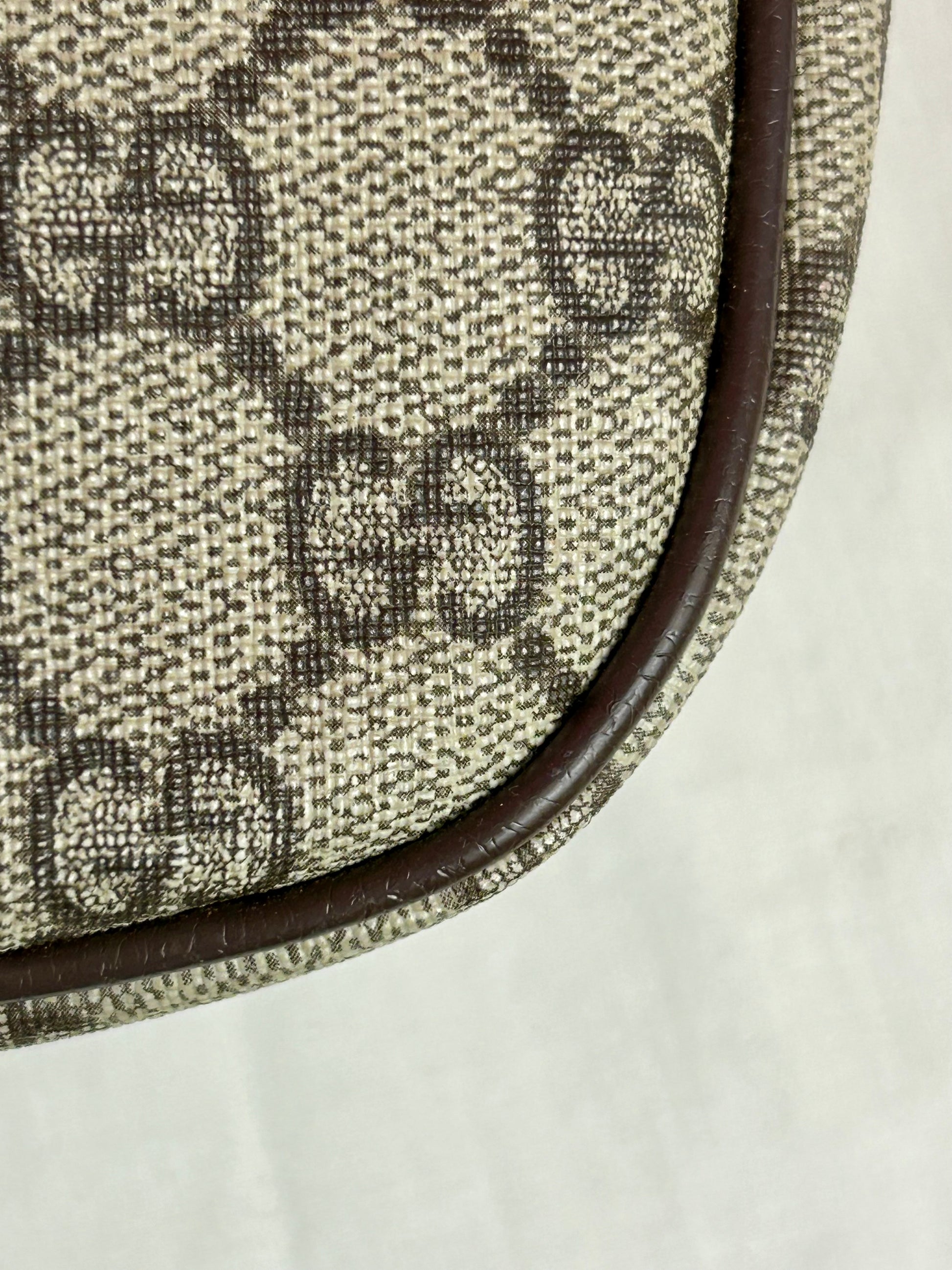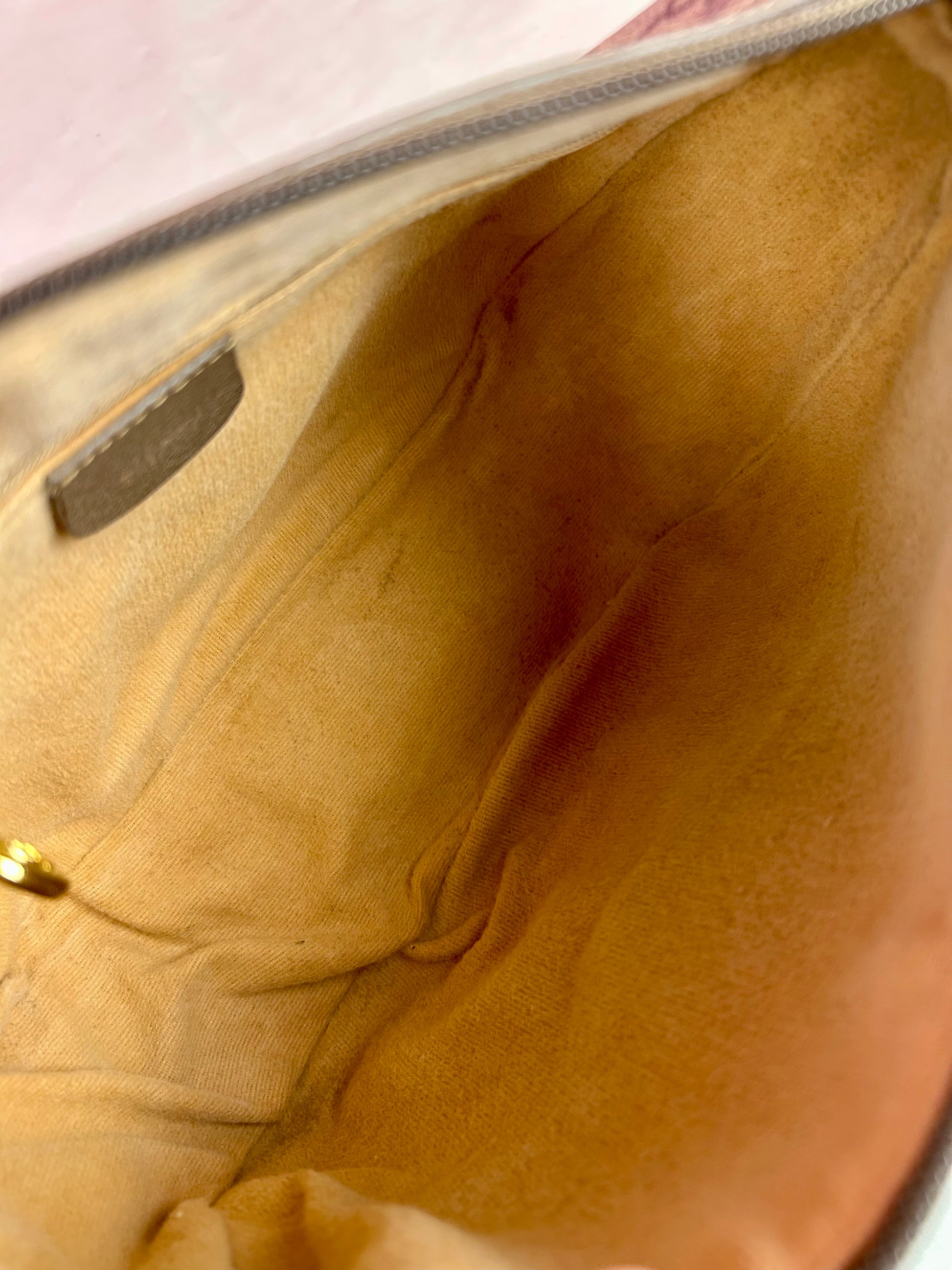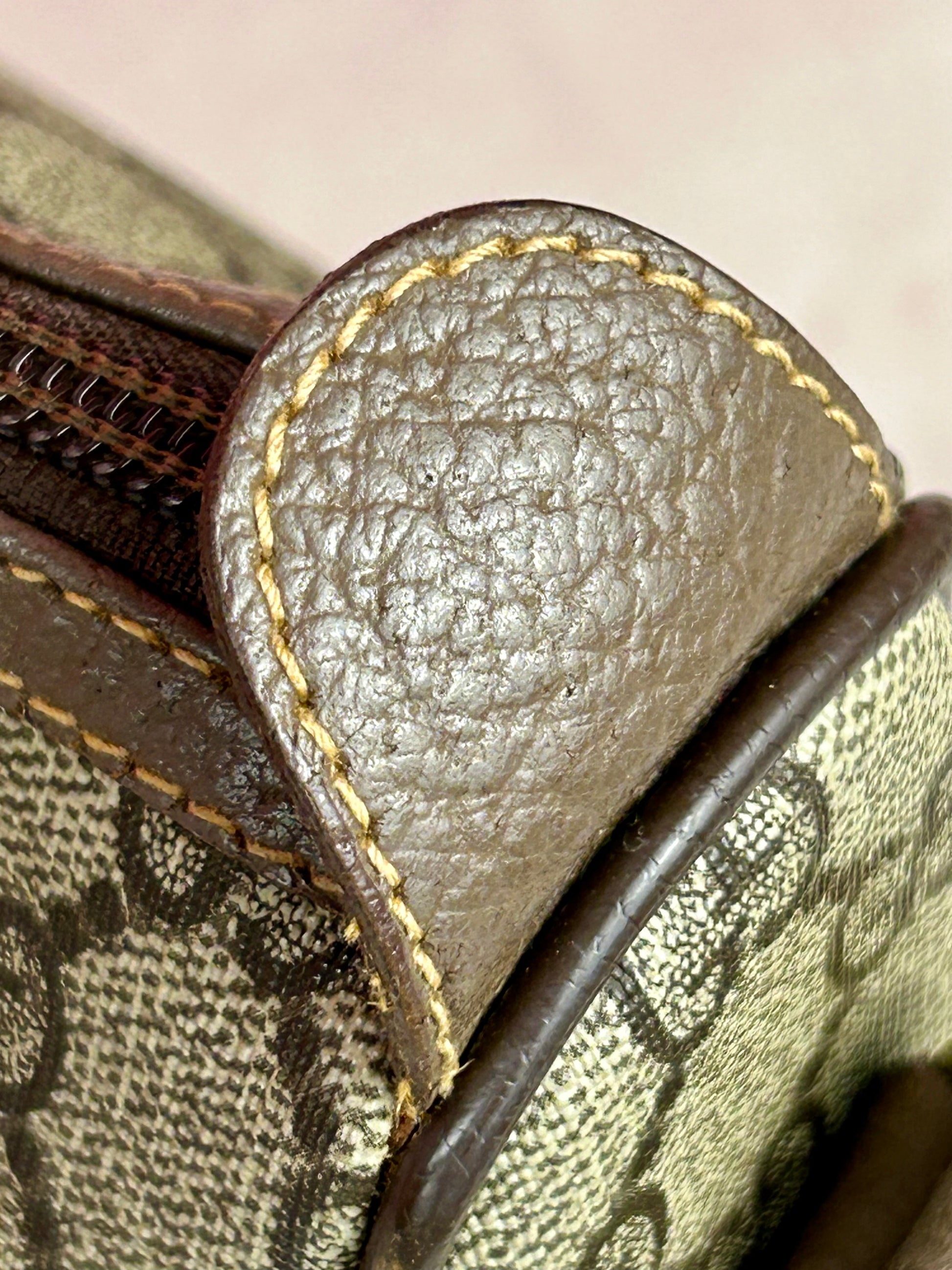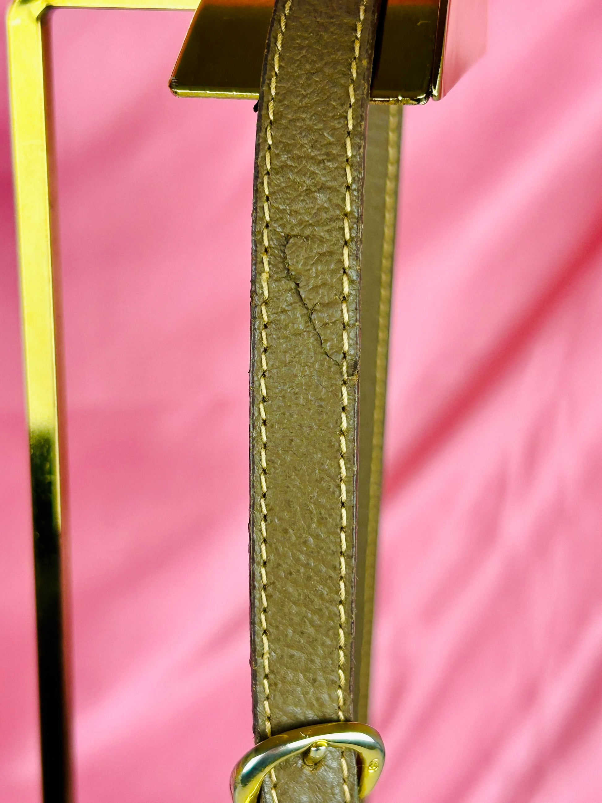 š Description: This is a medium sized crossbody that can hold all your everyday essentials. It has an outside pocket that is easily accessible for things like your phone. The canvas is vibrant and clear. Piping in excellent condition. Sherry Line is prominent and bright. Chapes in excellent condition. Strap is adjustable and has a surface crack on the top center, some wear on the glazing and some frayed threads near the chapes. Snap button has mixed gold and silver tones. Clasp and both zippers work properly. Interior lining has been cleaned, no powder or stickiness. Interior pocket is clean. Exterior pocket has been cleaned.Ā