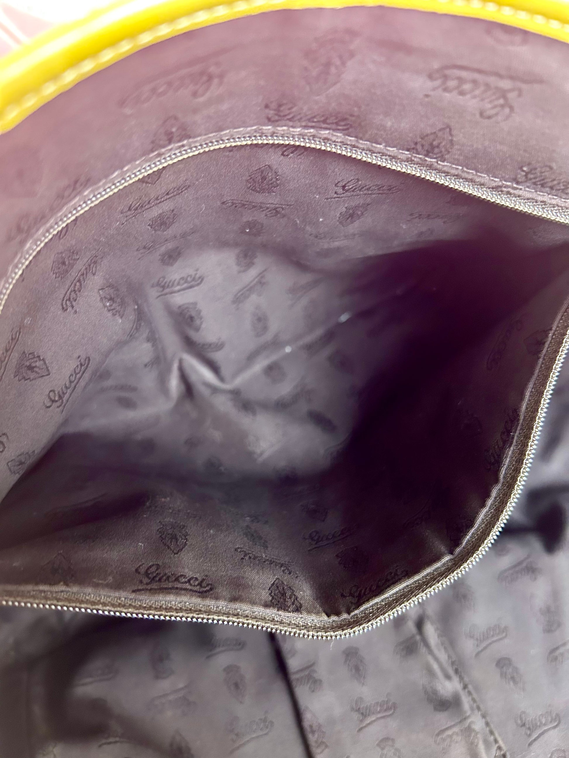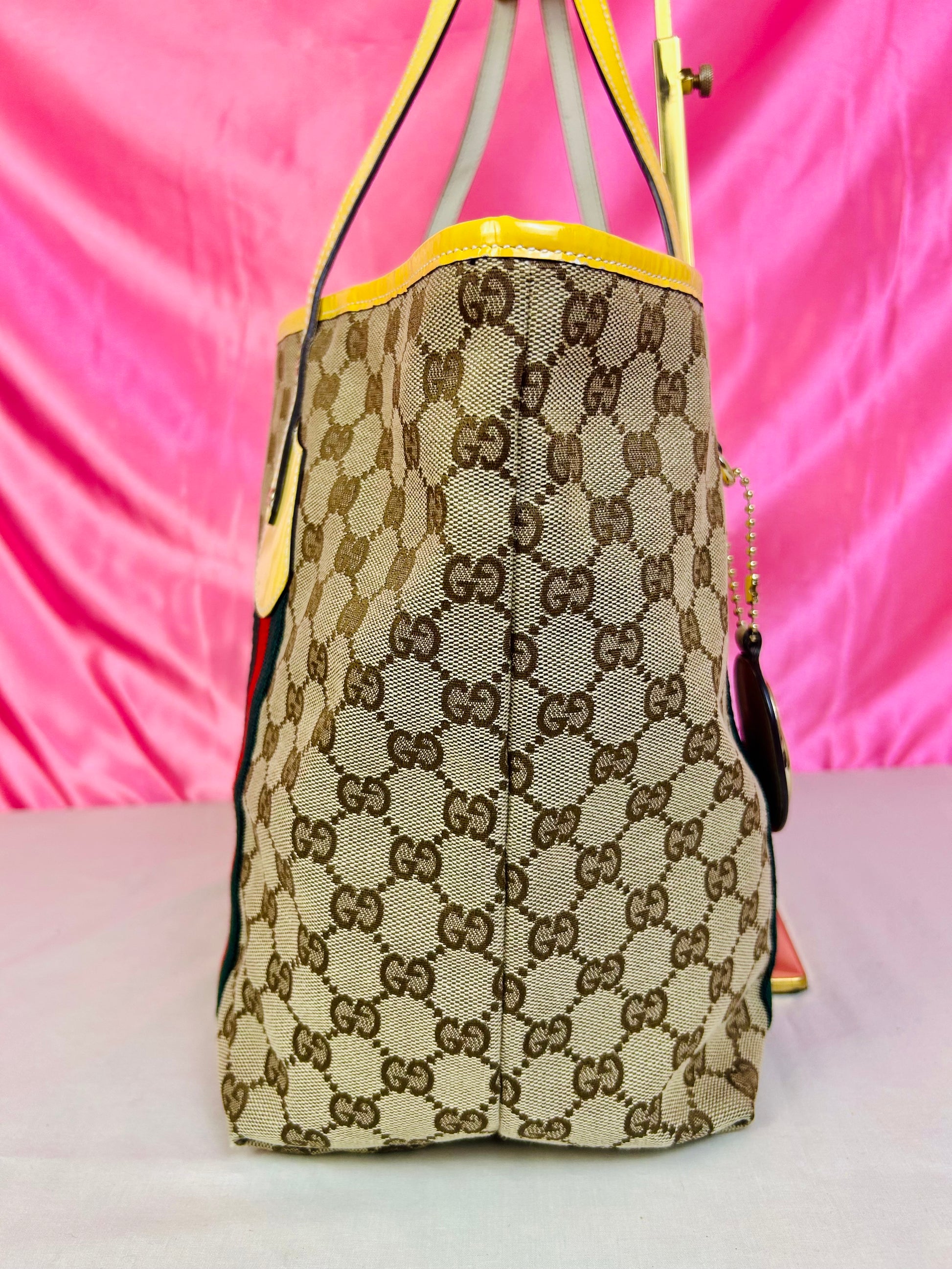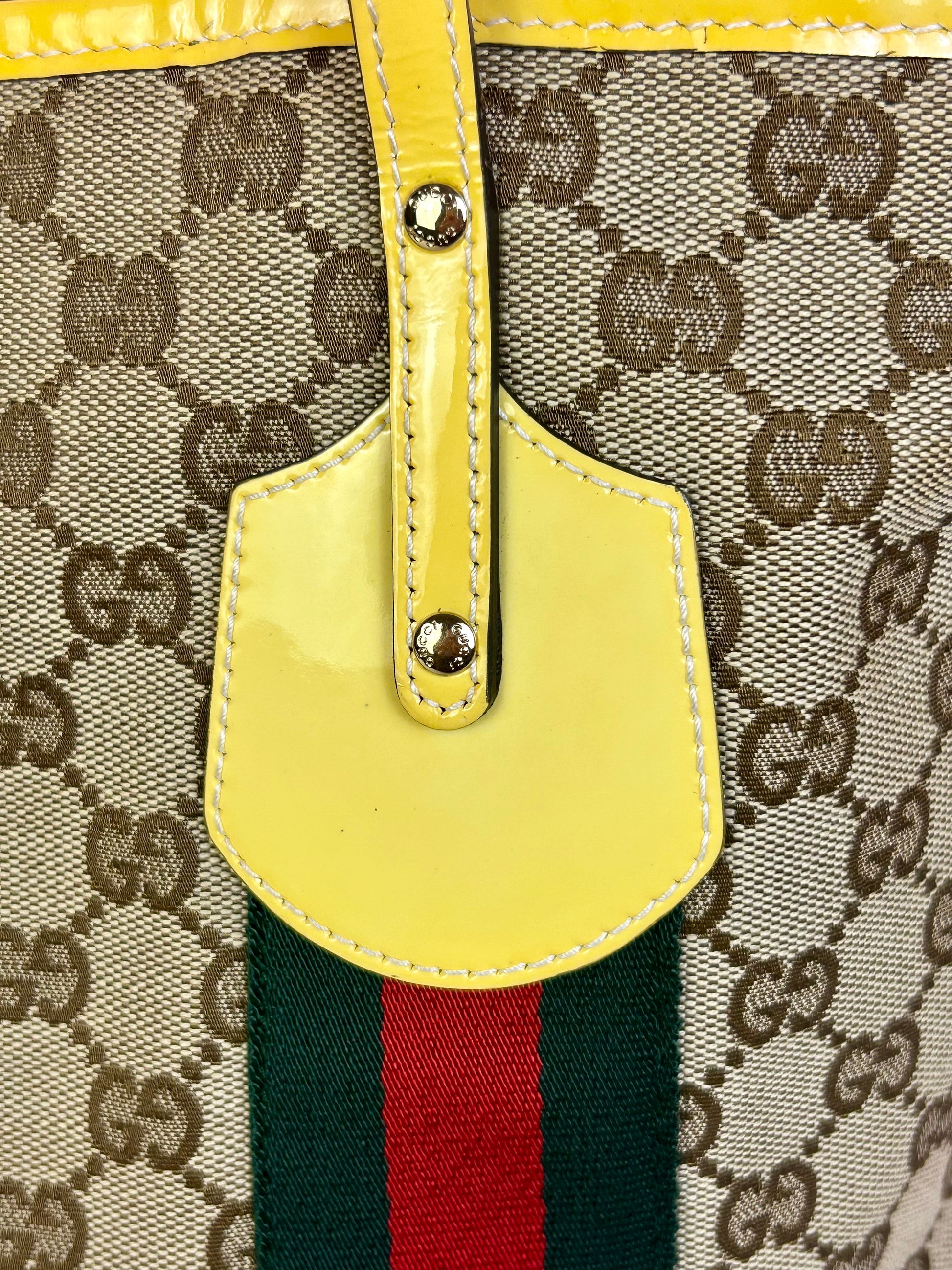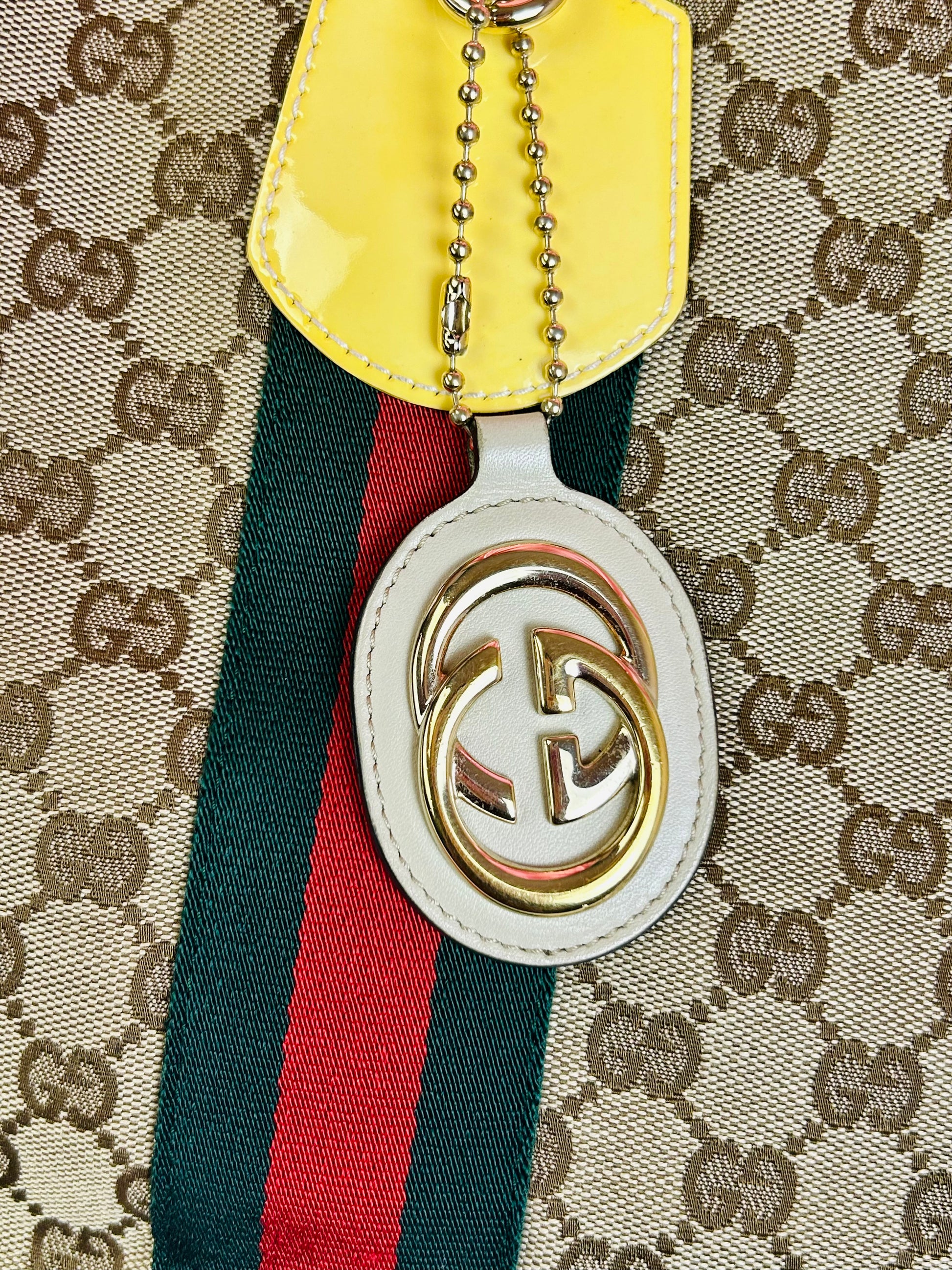 š Description: Fabric canvas is in excellent condition with little to no wear noted on the bottom corners. Yellow patent leather trim and chapes are in excellent condition. The GG tag has initials on the back. Interior and interior pocket are clean. Pocket zipper functions smoothly and hardware remains shiny.