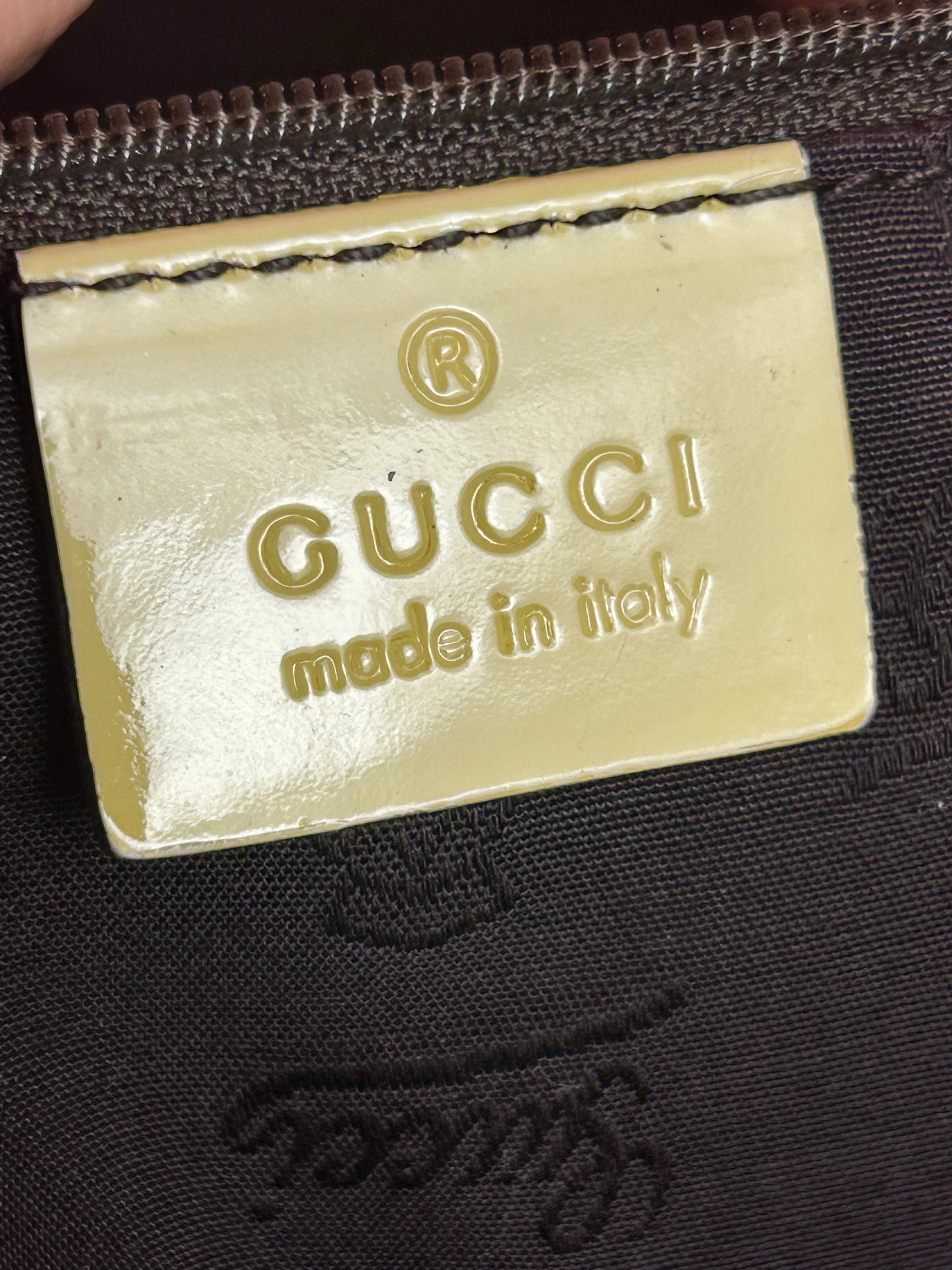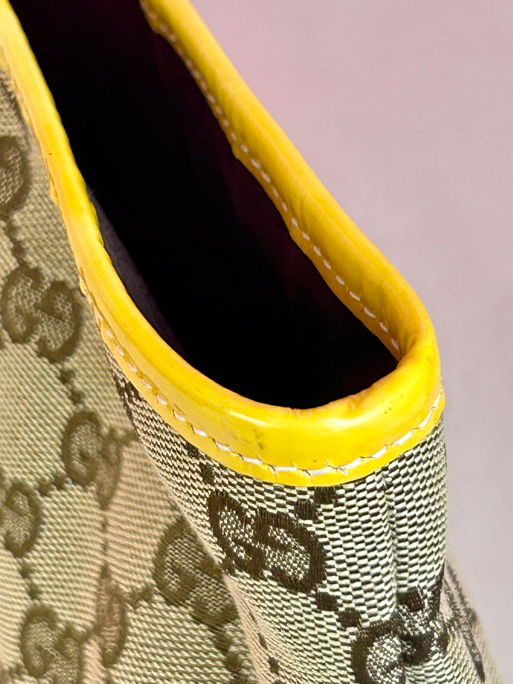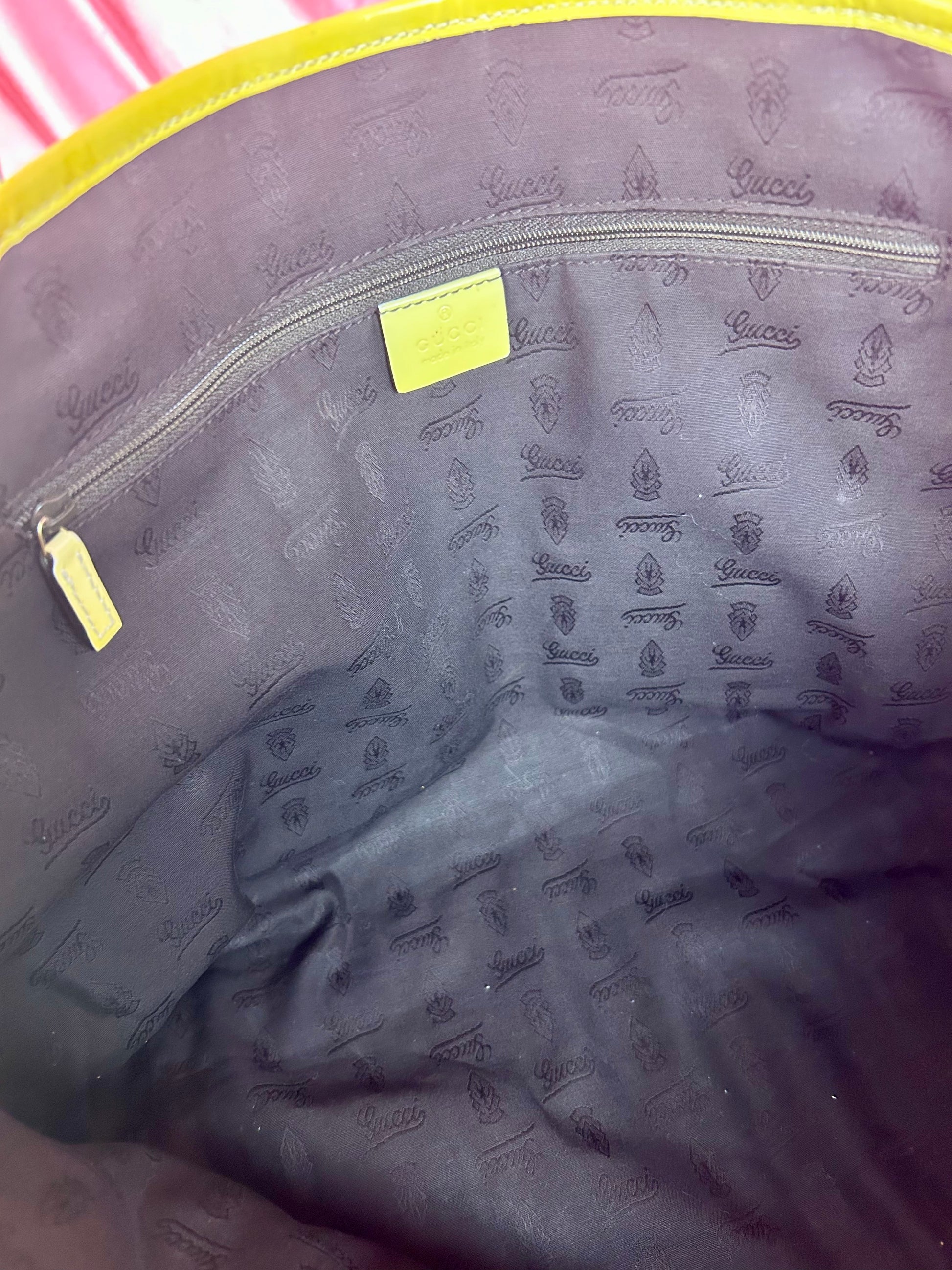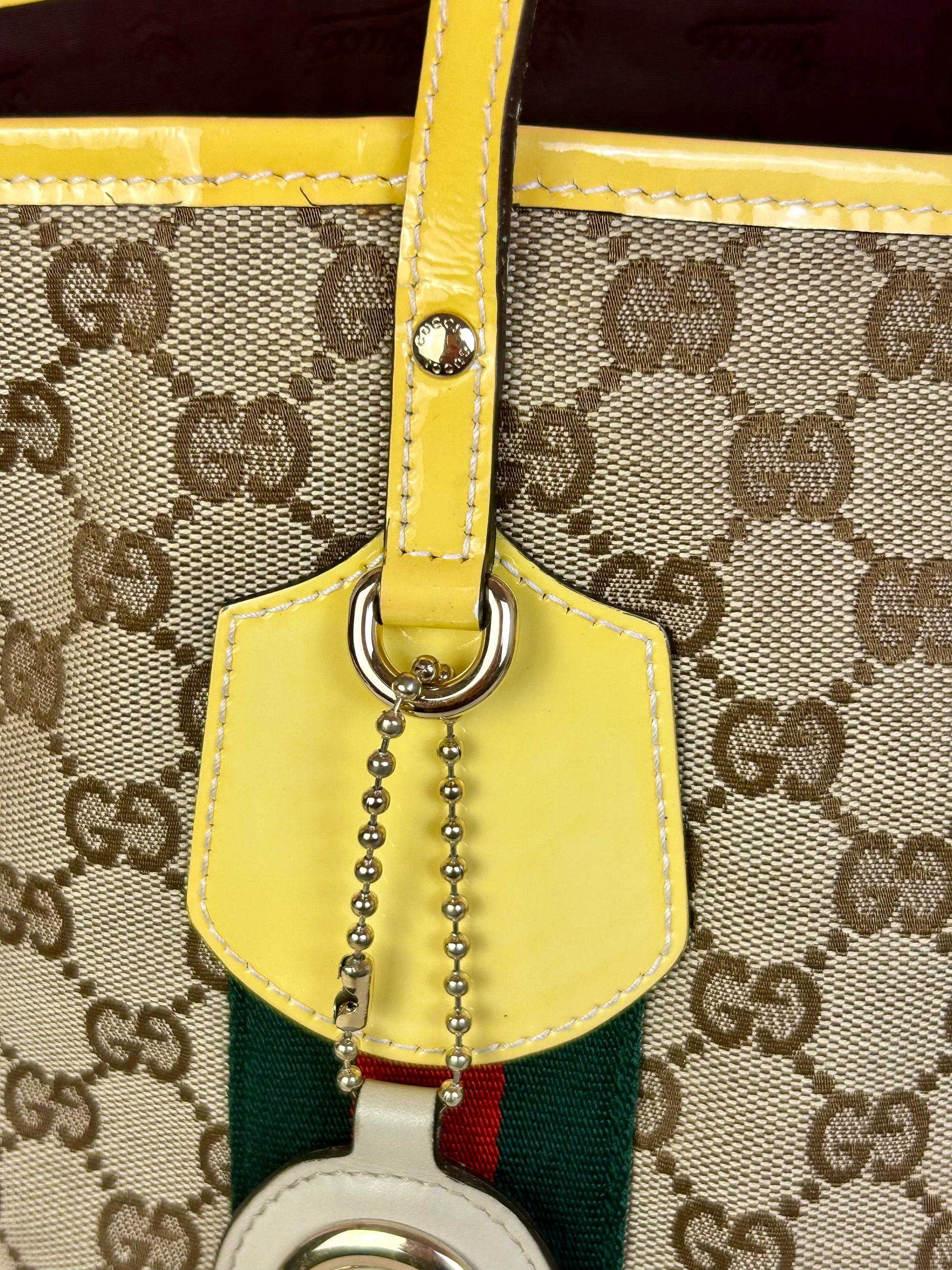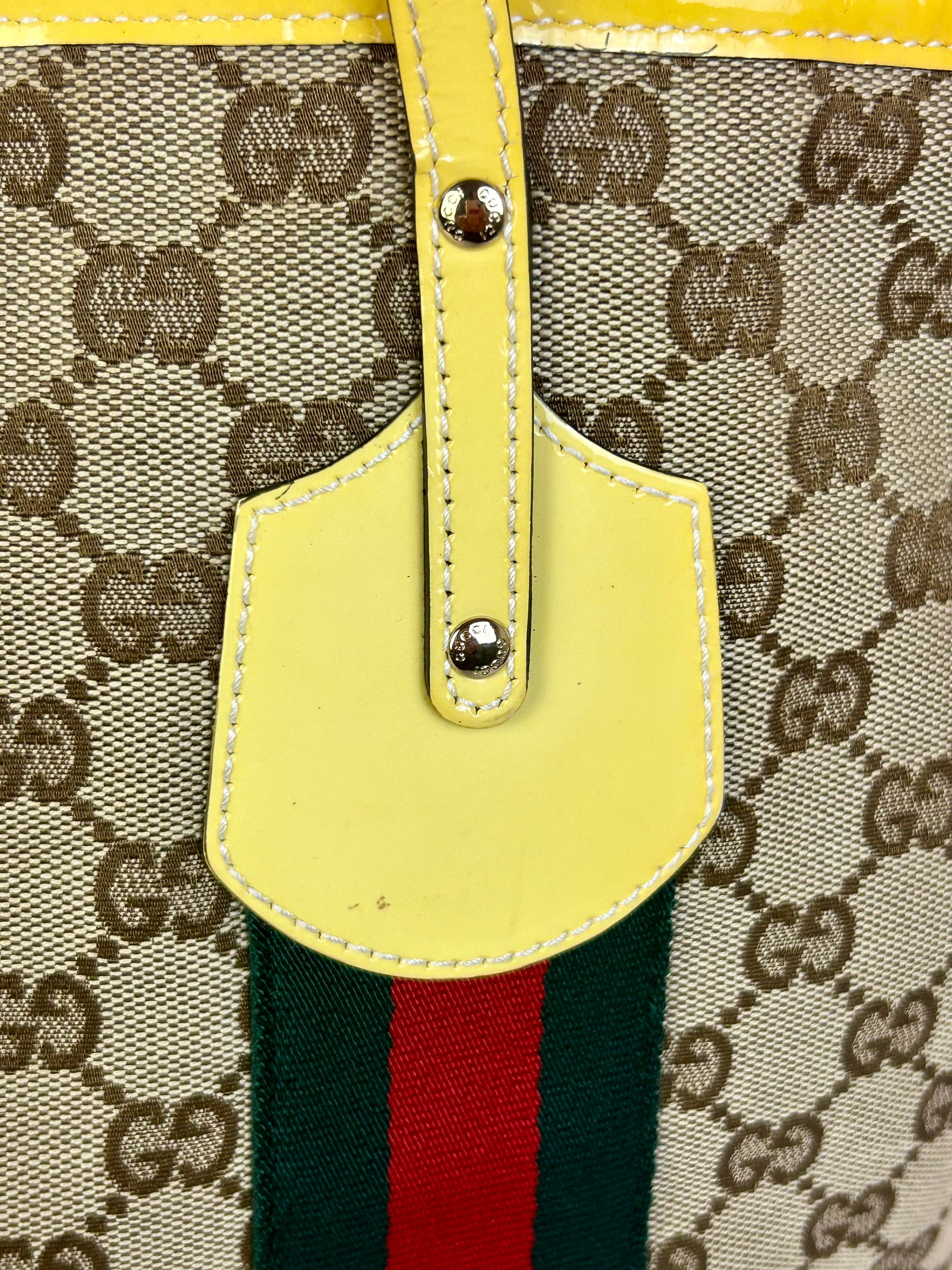 š Description: Fabric canvas is in excellent condition with little to no wear noted on the bottom corners. Yellow patent leather trim and chapes are in excellent condition. The GG tag has initials on the back. Interior and interior pocket are clean. Pocket zipper functions smoothly and hardware remains shiny.