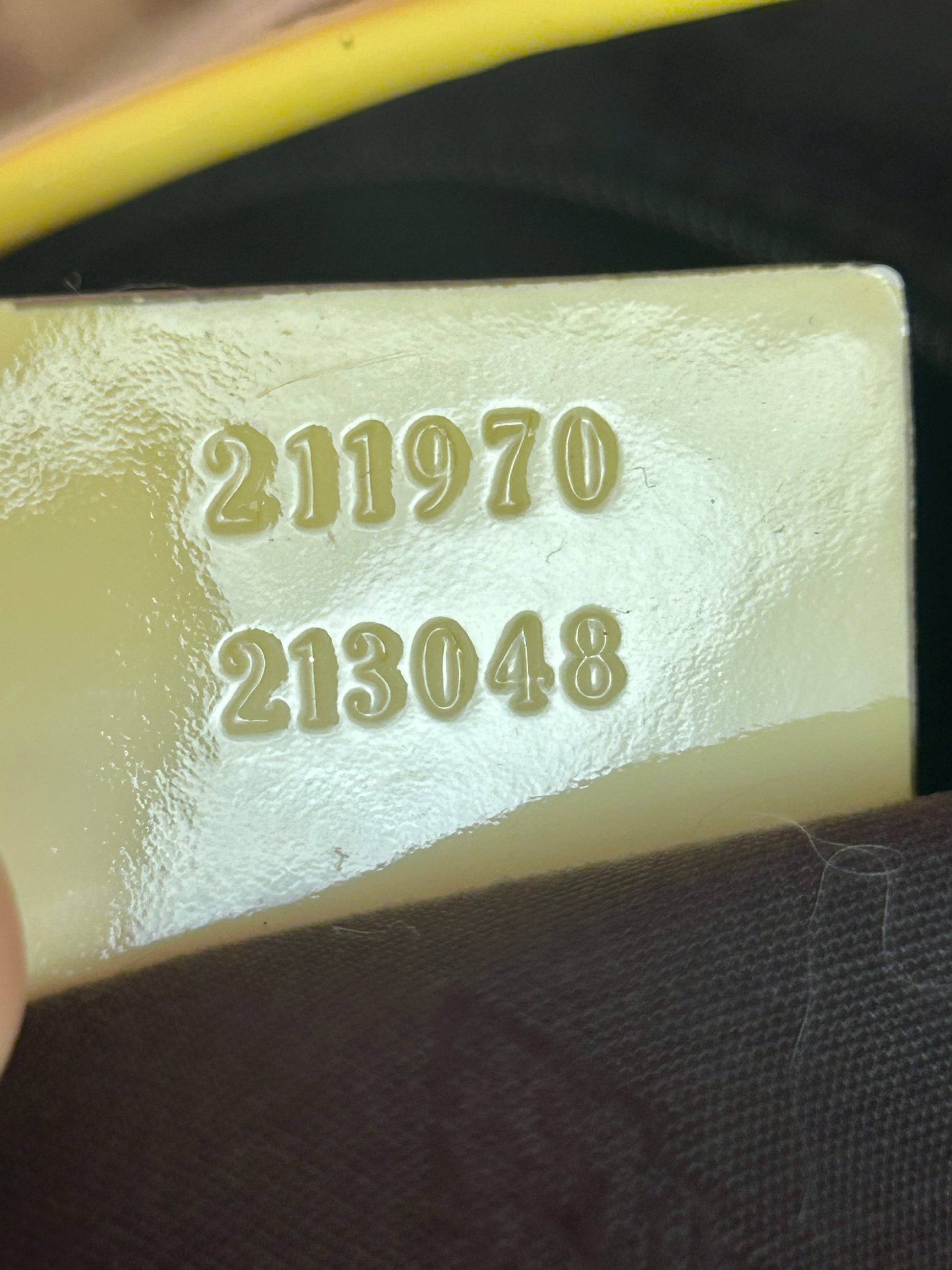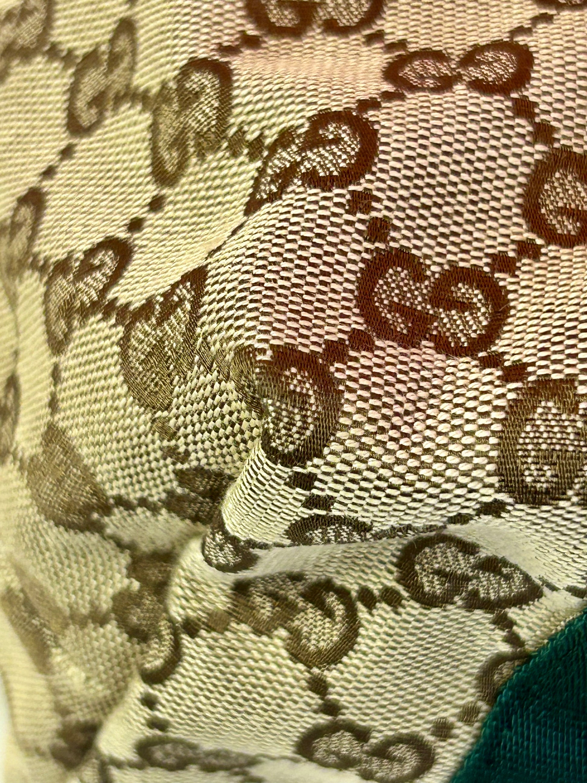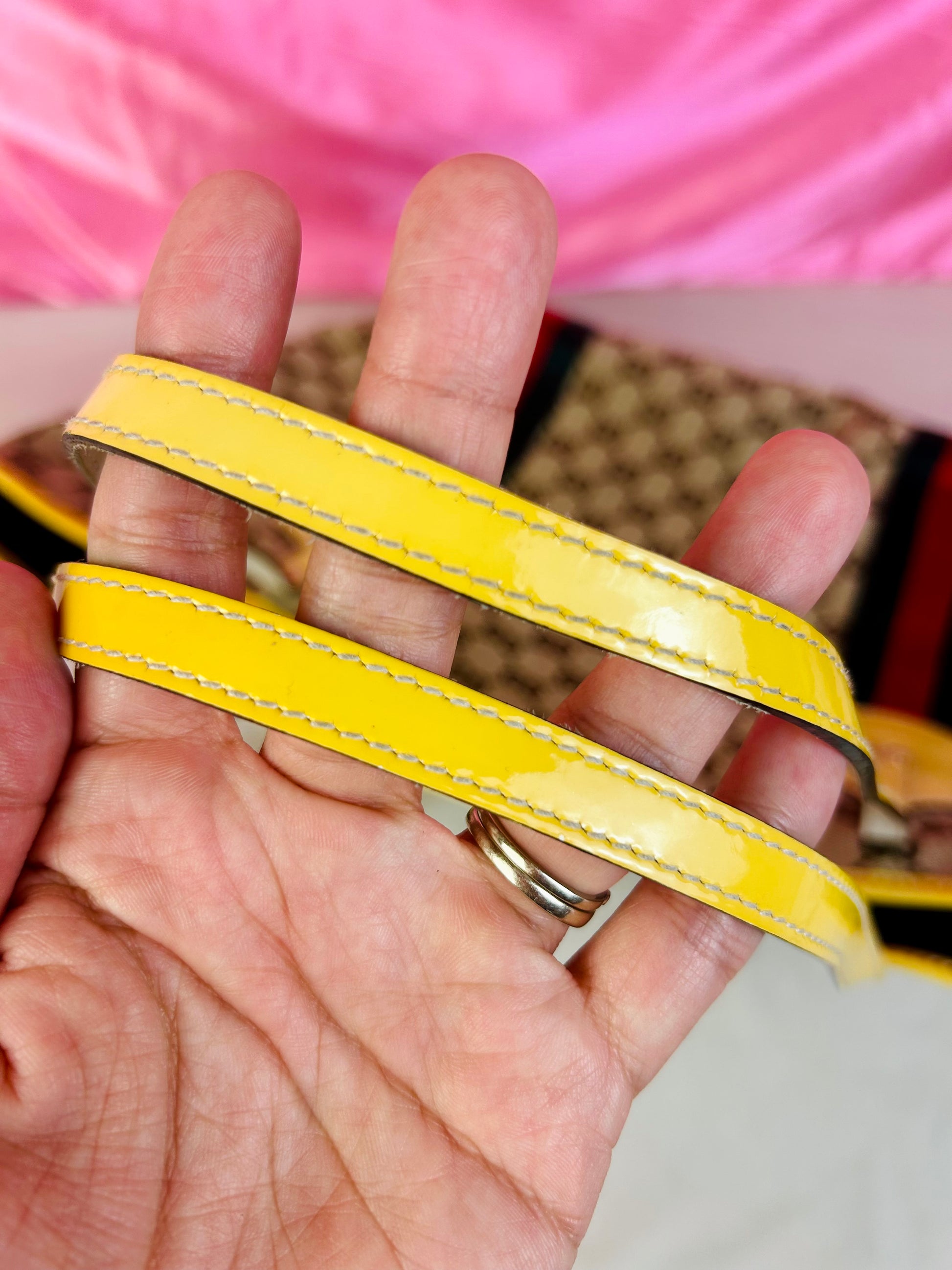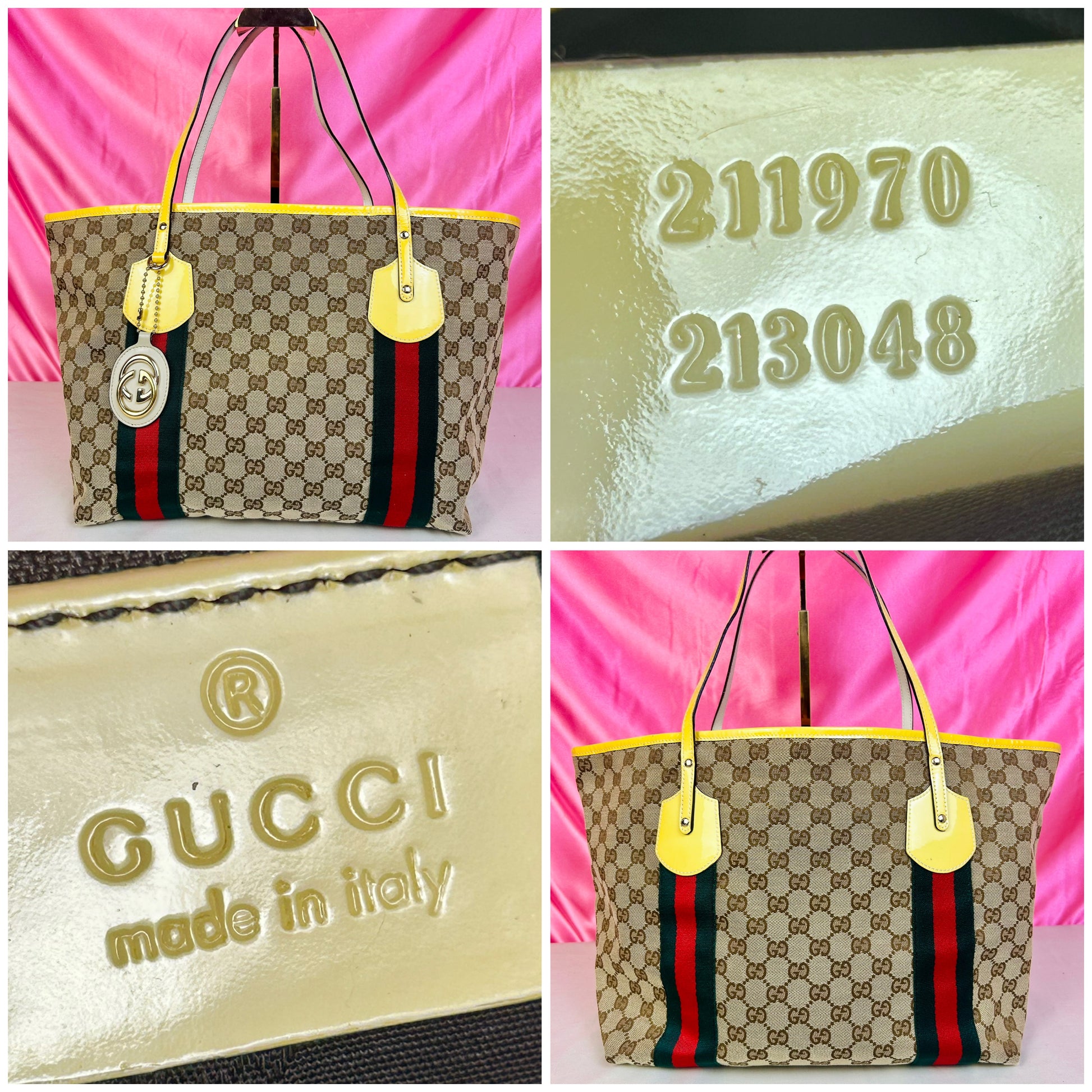 š Description: Fabric canvas is in excellent condition with little to no wear noted on the bottom corners. Yellow patent leather trim and chapes are in excellent condition. The GG tag has initials on the back. Interior and interior pocket are clean. Pocket zipper functions smoothly and hardware remains shiny.