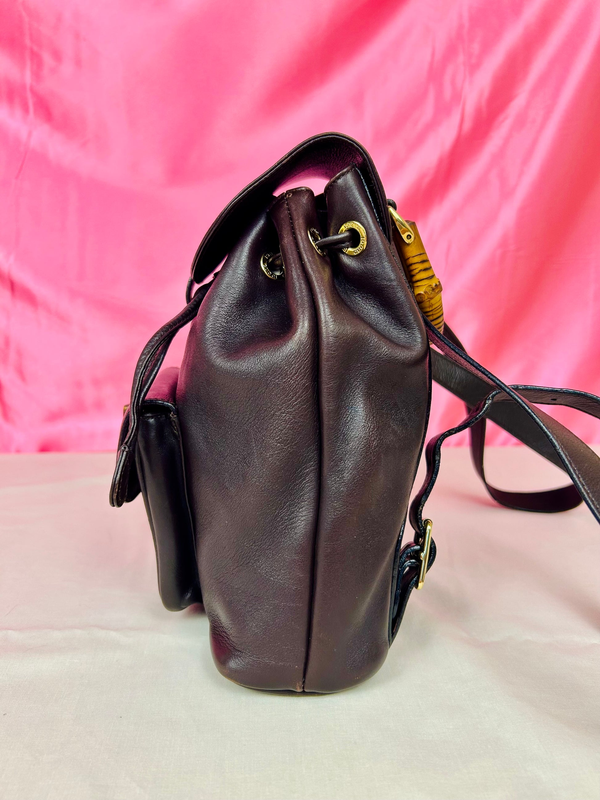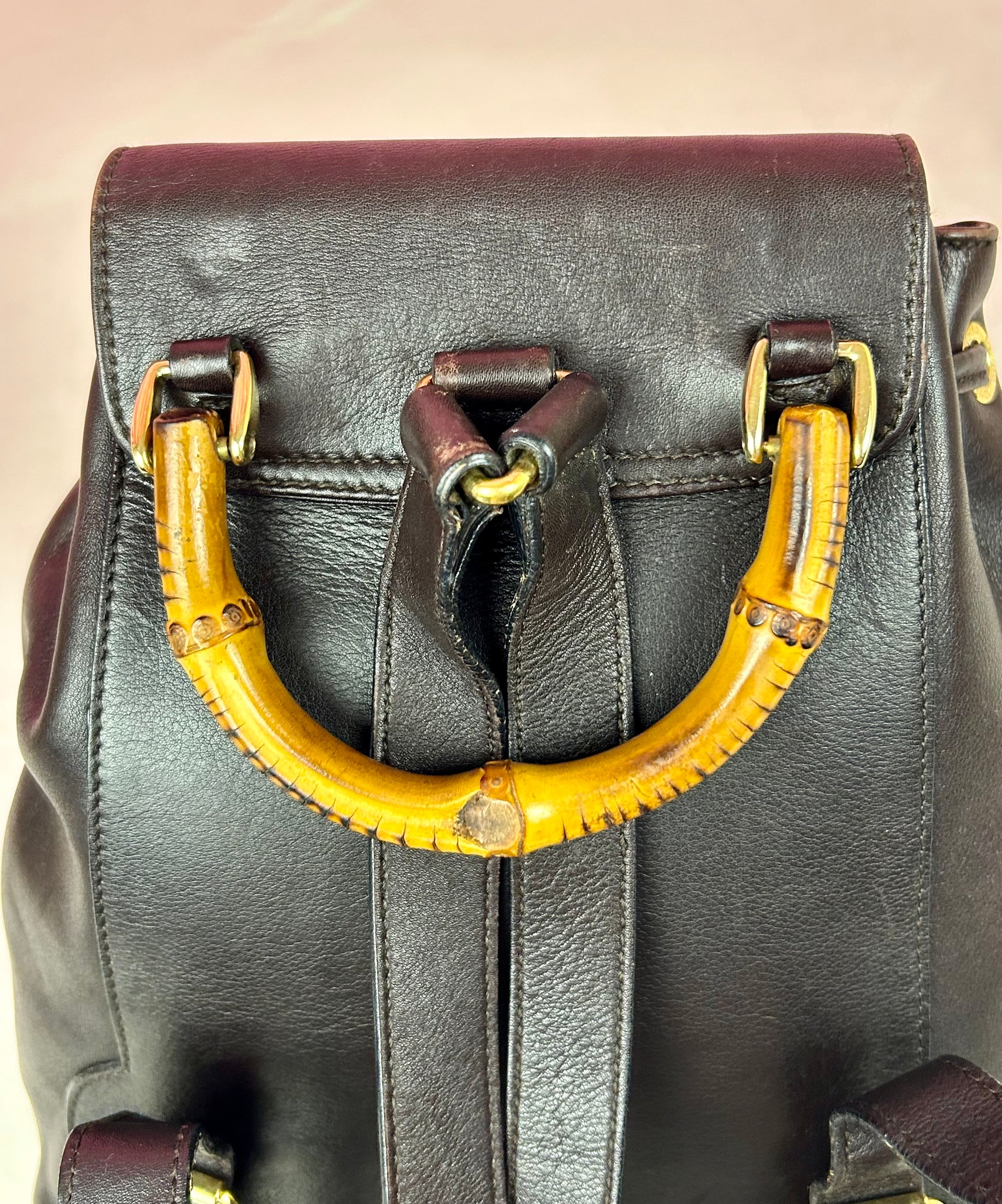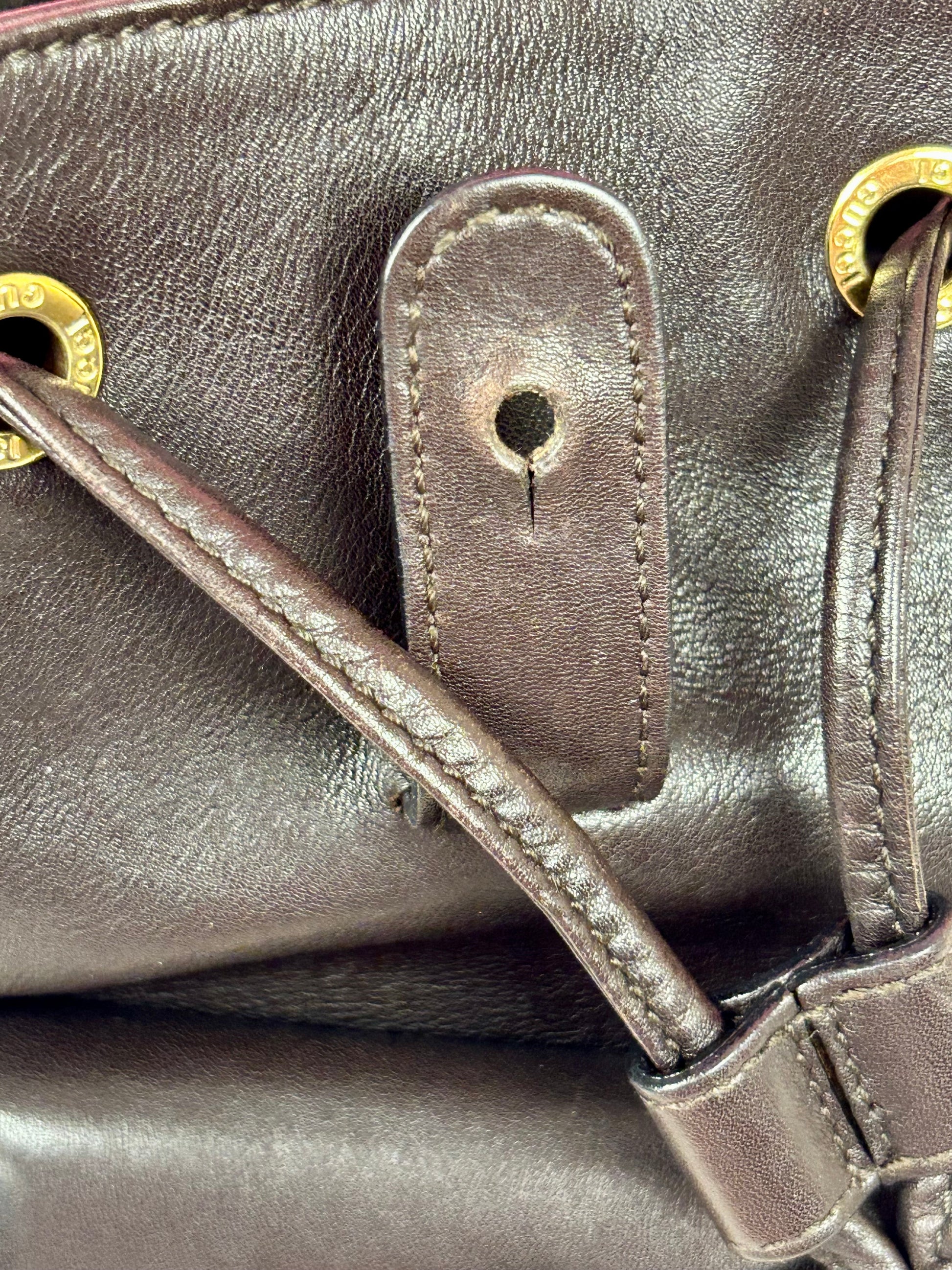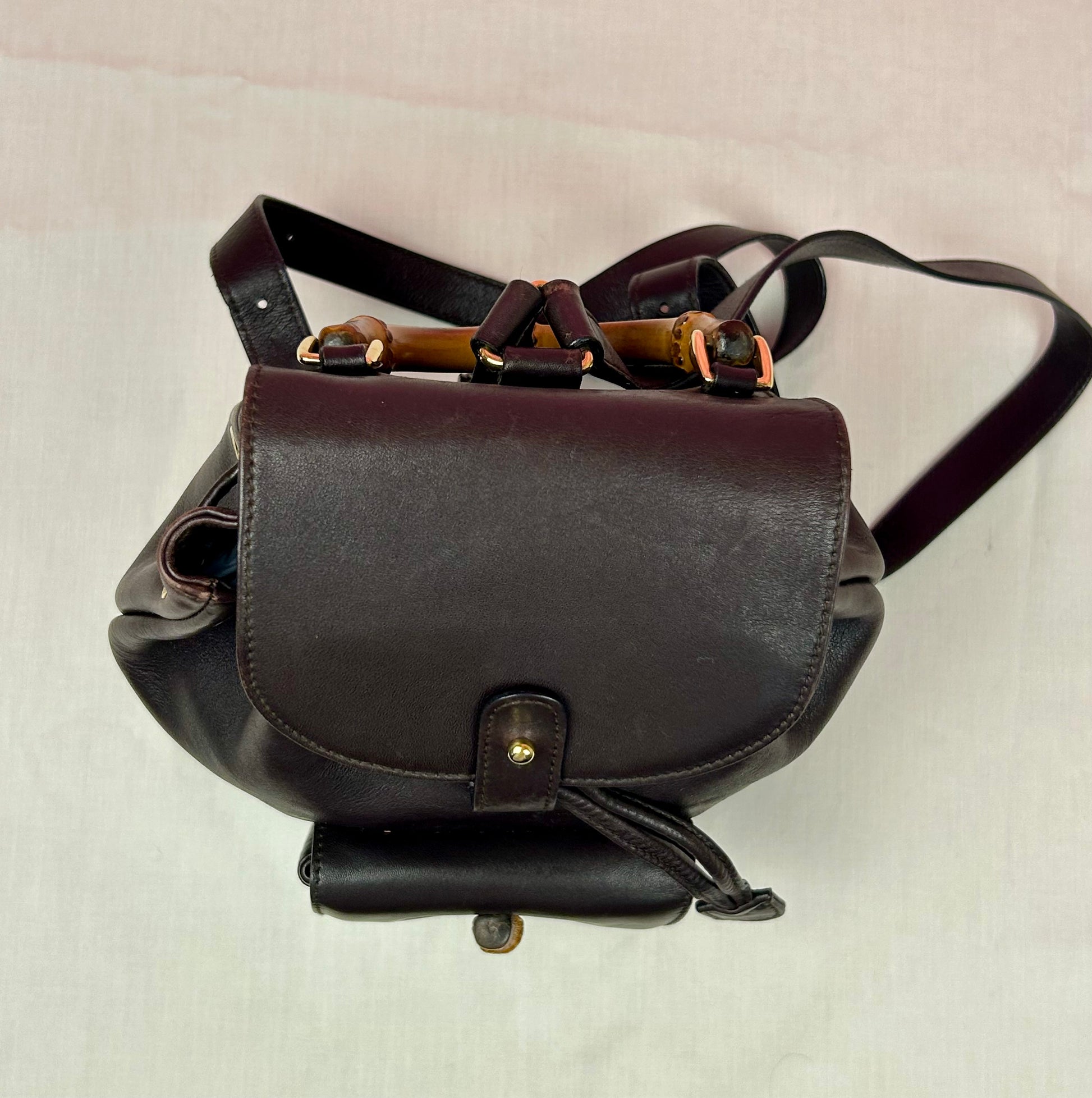 💜 Description: Leather is supple and soft with no cracks or tears. Some mild rubbing throughout and light wear on the bottom corners consistent with normal use. Interior leather flap shows some rubbing on the inside. There is slight wear on the top right and left leather areas. Leather drawstring is in excellent condition with no tears or cracks. Bamboo handle is in excellent condition. Leather straps show minimal signs of use. Front pocket is clean. Interior is very clean, and the interior pocket is clean though the zipper is missing its pull.