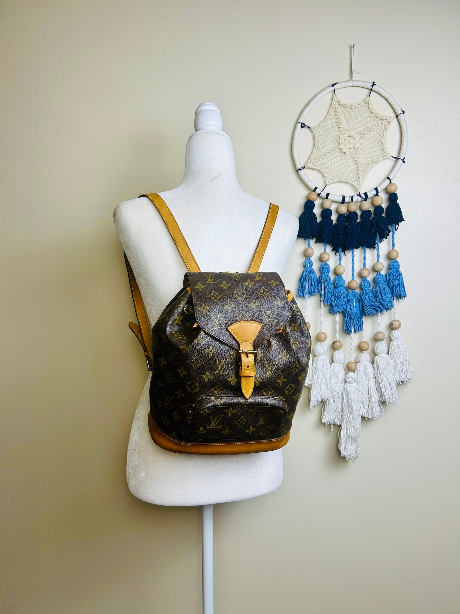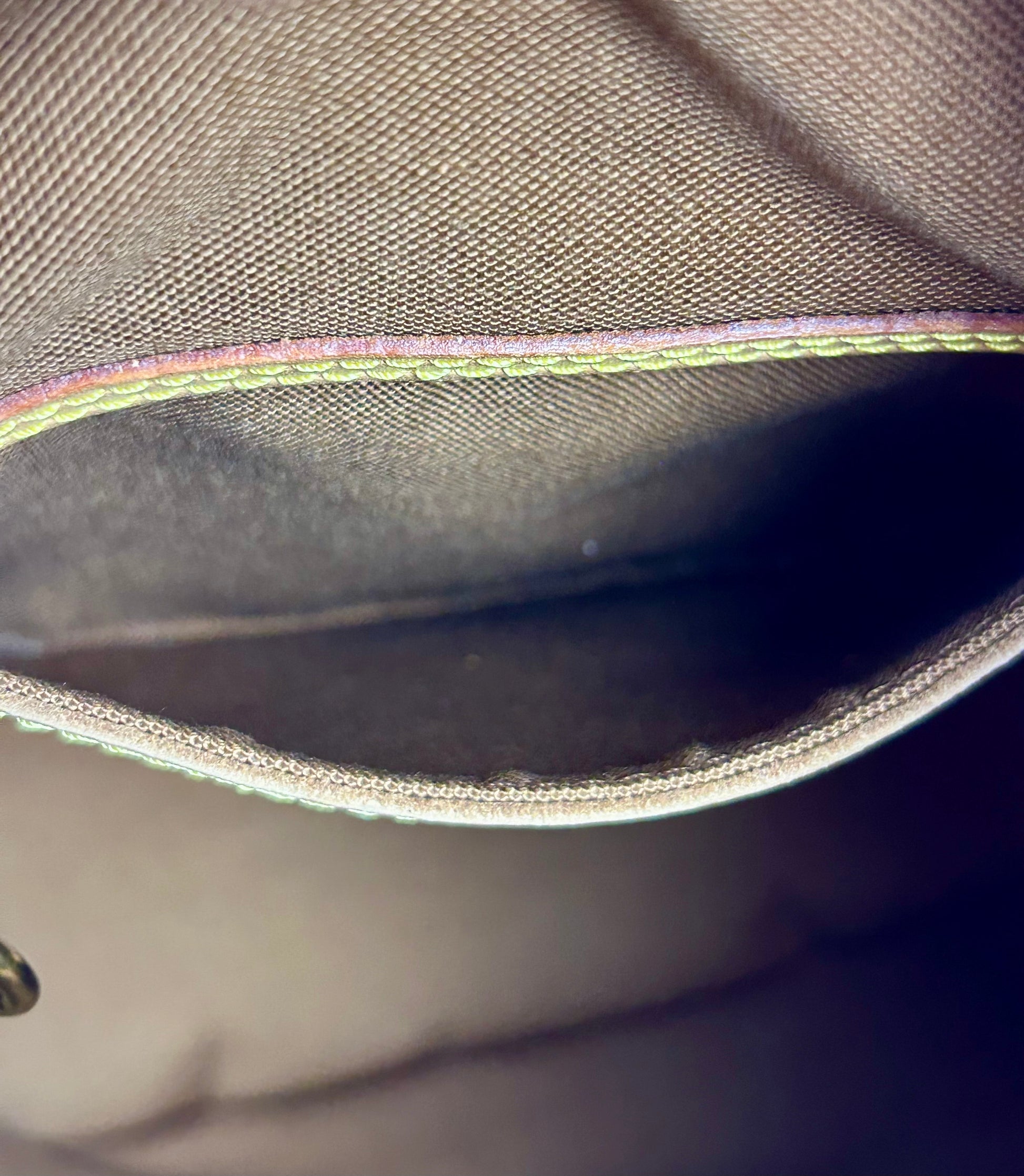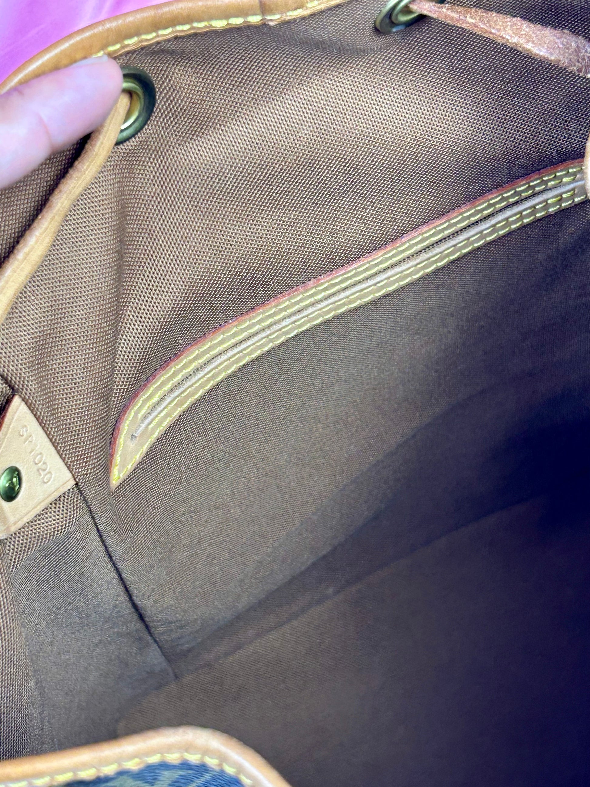 š Description: A perfect hands-free bag! Canvas is in great condition. Leather has watermarks throughout, but mostly an even patina. Straps and chapes are strong, no cracks. Buckle works properly and has no cracks. Trim has no holes or cracks. Hardware is gold and works properly. Interior, inner and exterior pocket are clean. A classic and versatile piece!