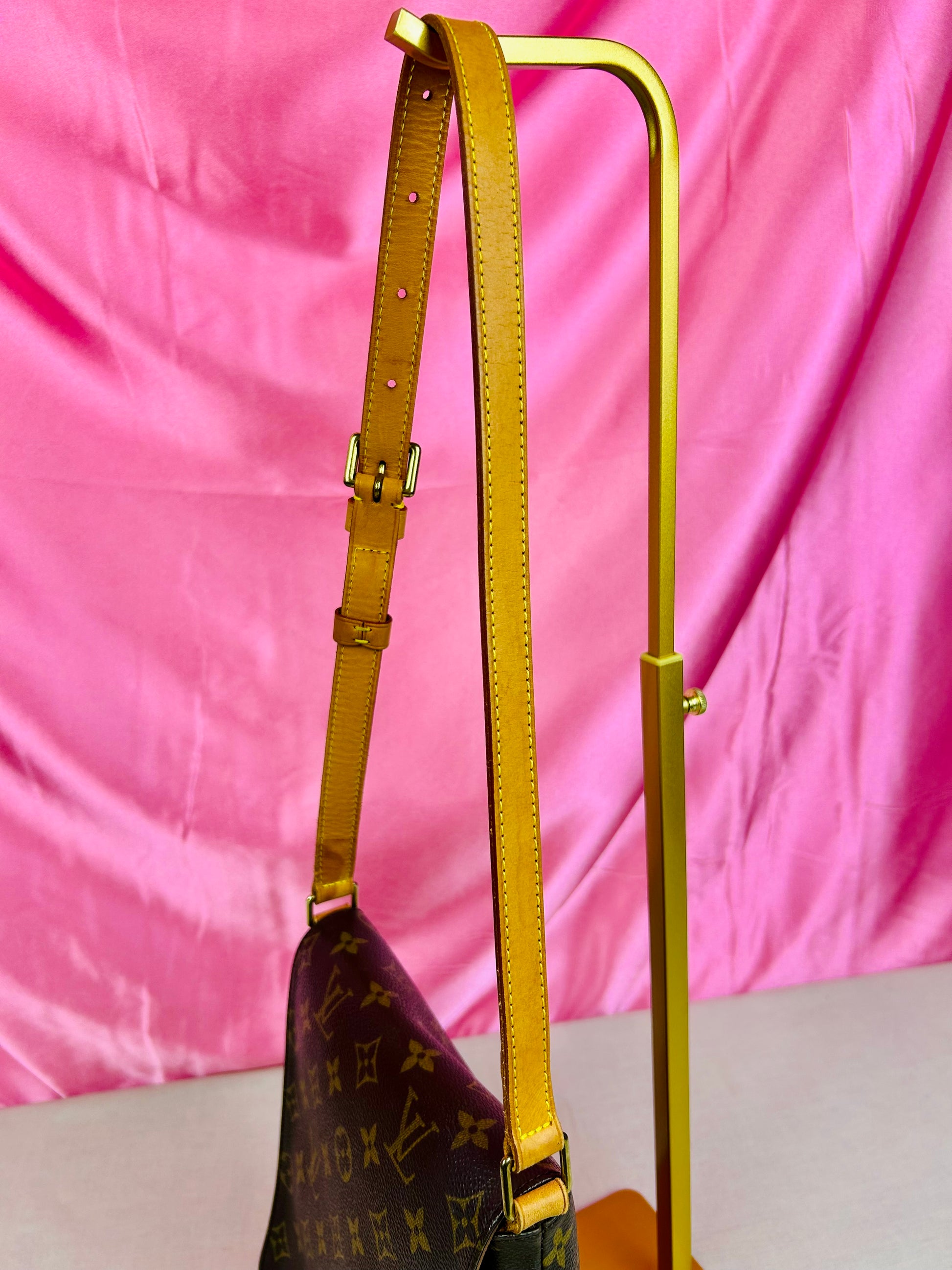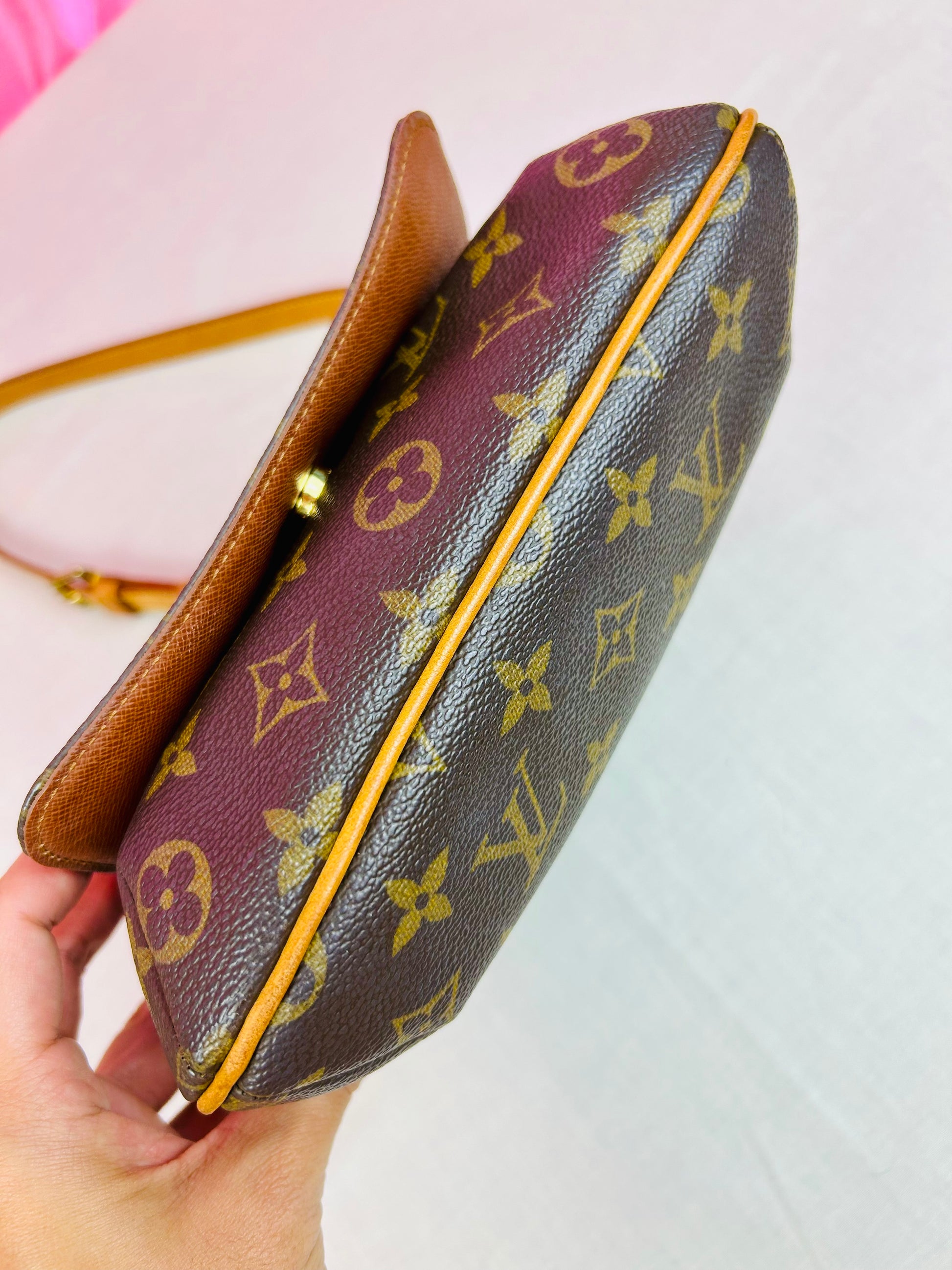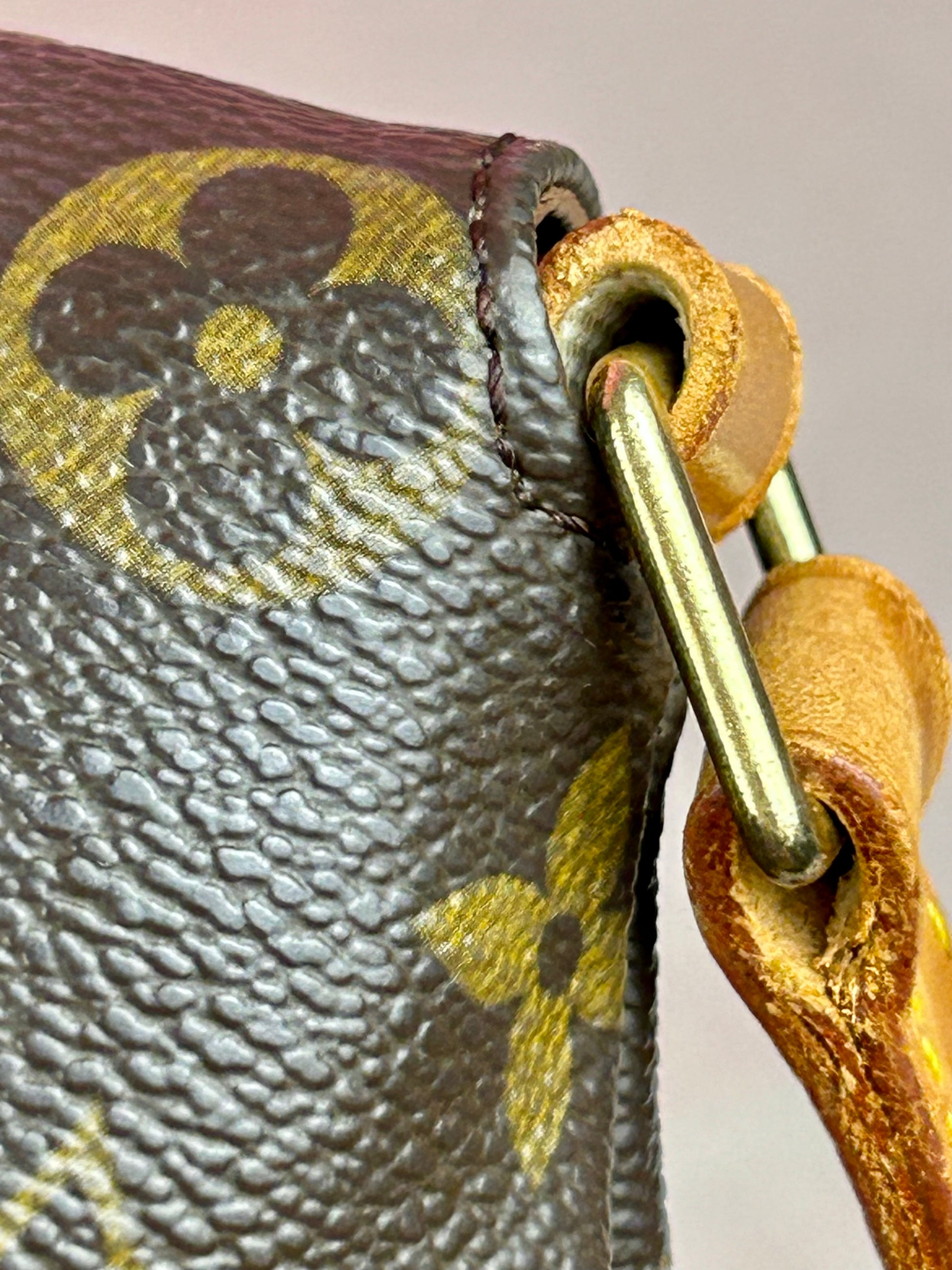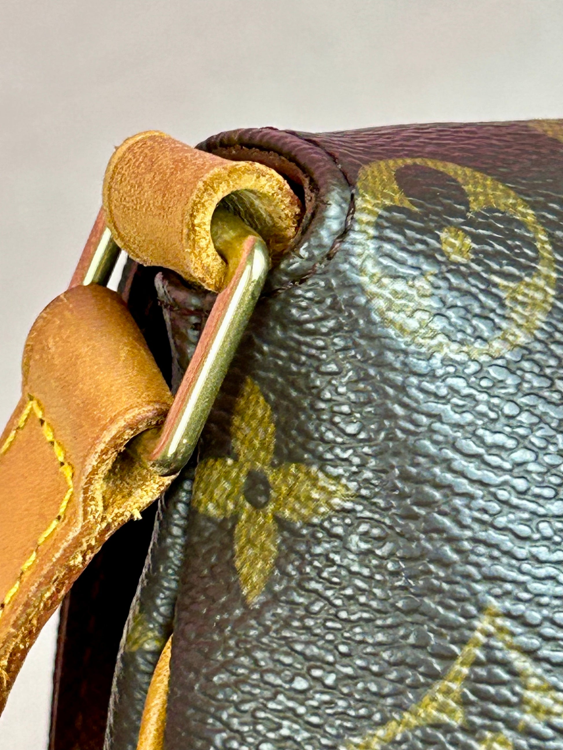 ๐ Description: A timeless and sleek shoulder bag! Canvas is bright and vibrant. Micro cracks are found on the back right side corner flap, very common for this model. Interior and inner pocket are both clean. Leather piping has no cracks or tears. The leather strap has some watermarks and normal wear but remains in great conditionโno major cracks or tears. Chapes are strong. A classic and versatile piece!