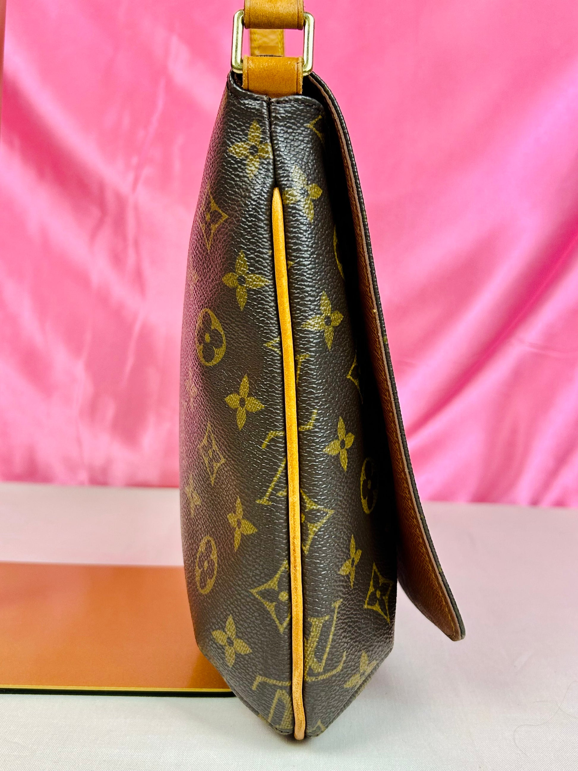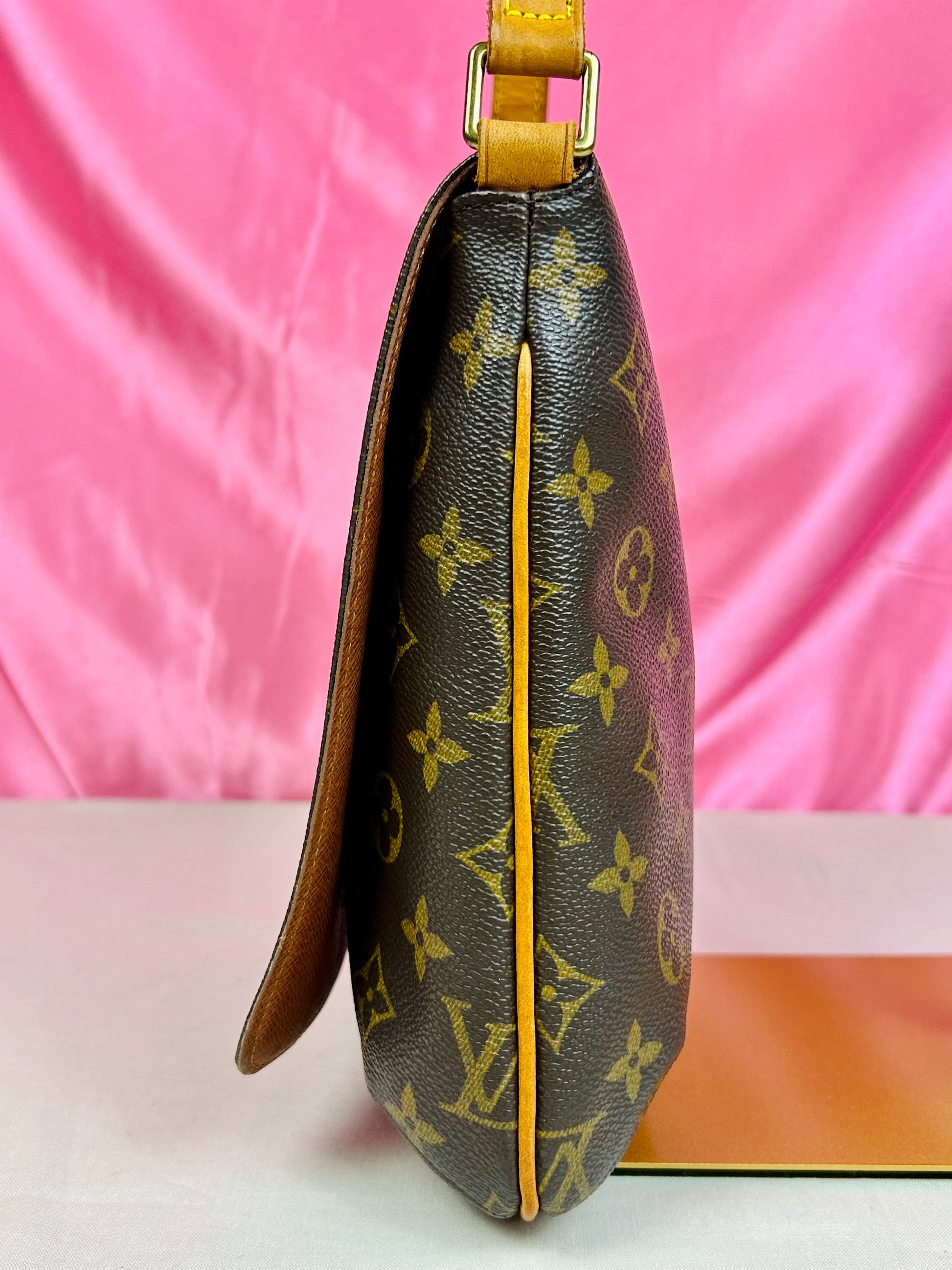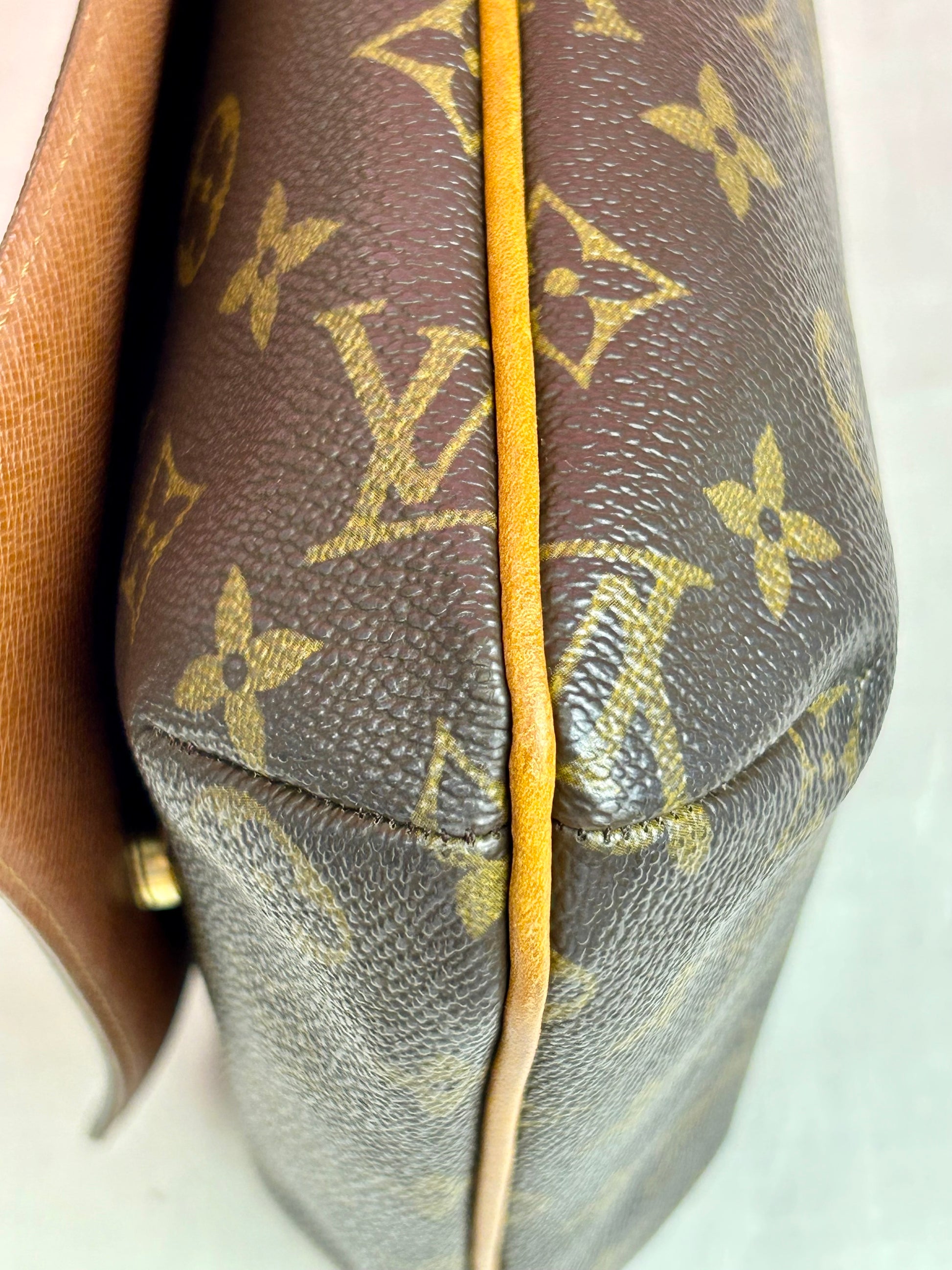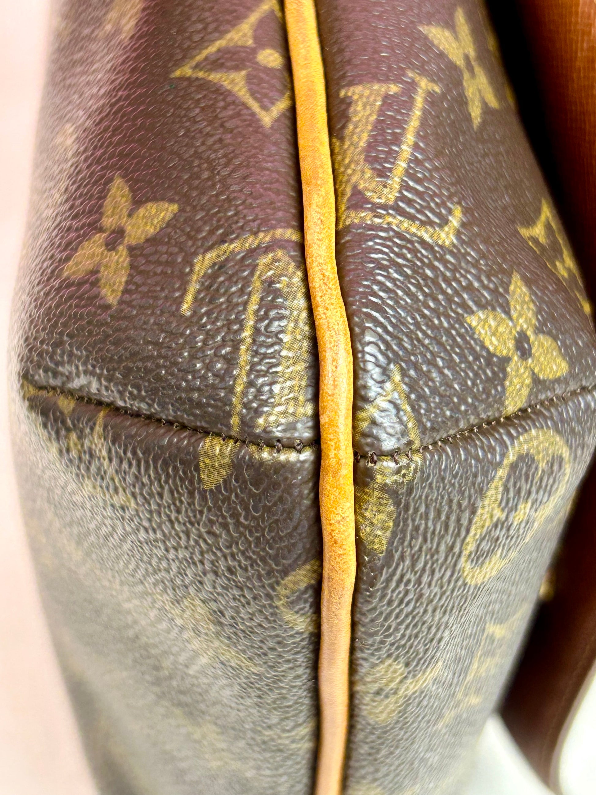 ๐ Description: A timeless and sleek shoulder bag! Canvas is bright and vibrant. Micro cracks are found on the back right side corner flap, very common for this model. Interior and inner pocket are both clean. Leather piping has no cracks or tears. The leather strap has some watermarks and normal wear but remains in great conditionโno major cracks or tears. Chapes are strong. A classic and versatile piece!