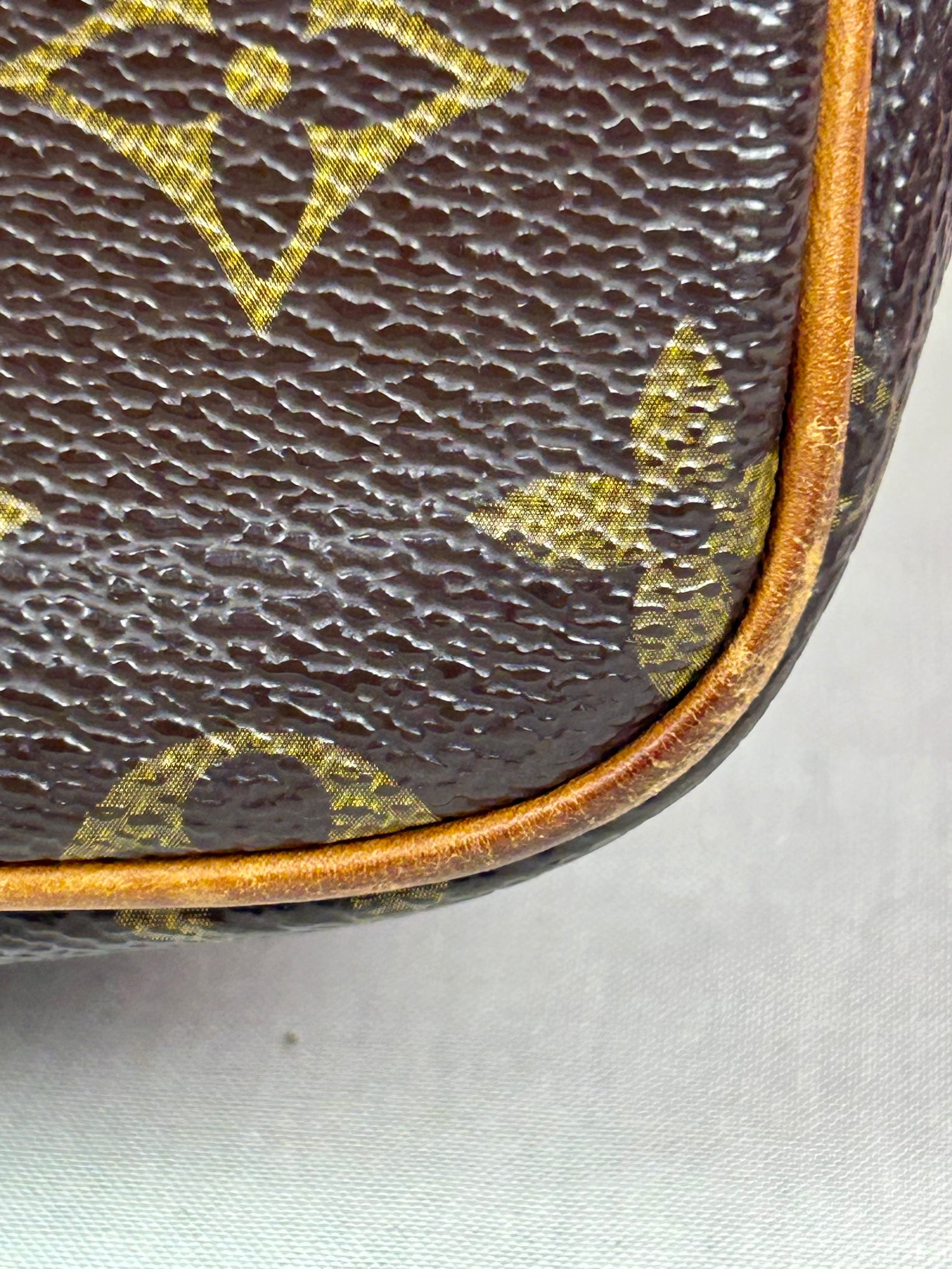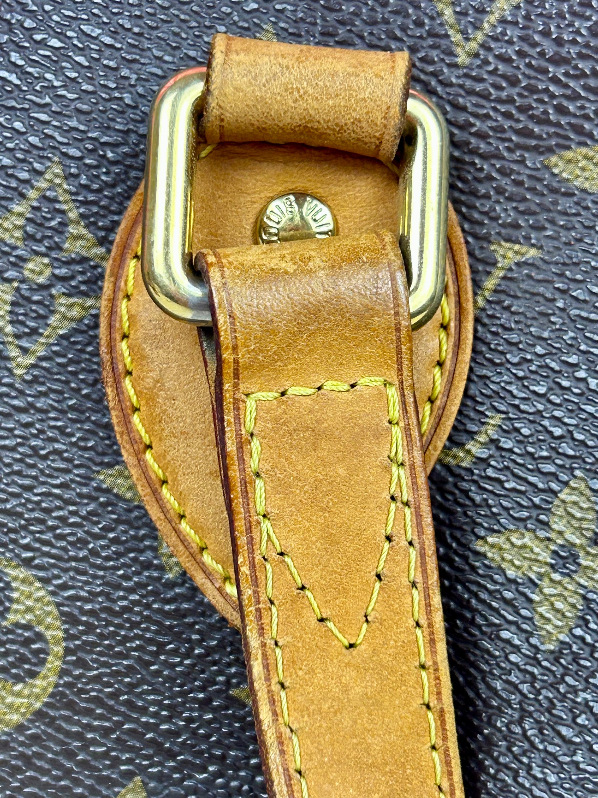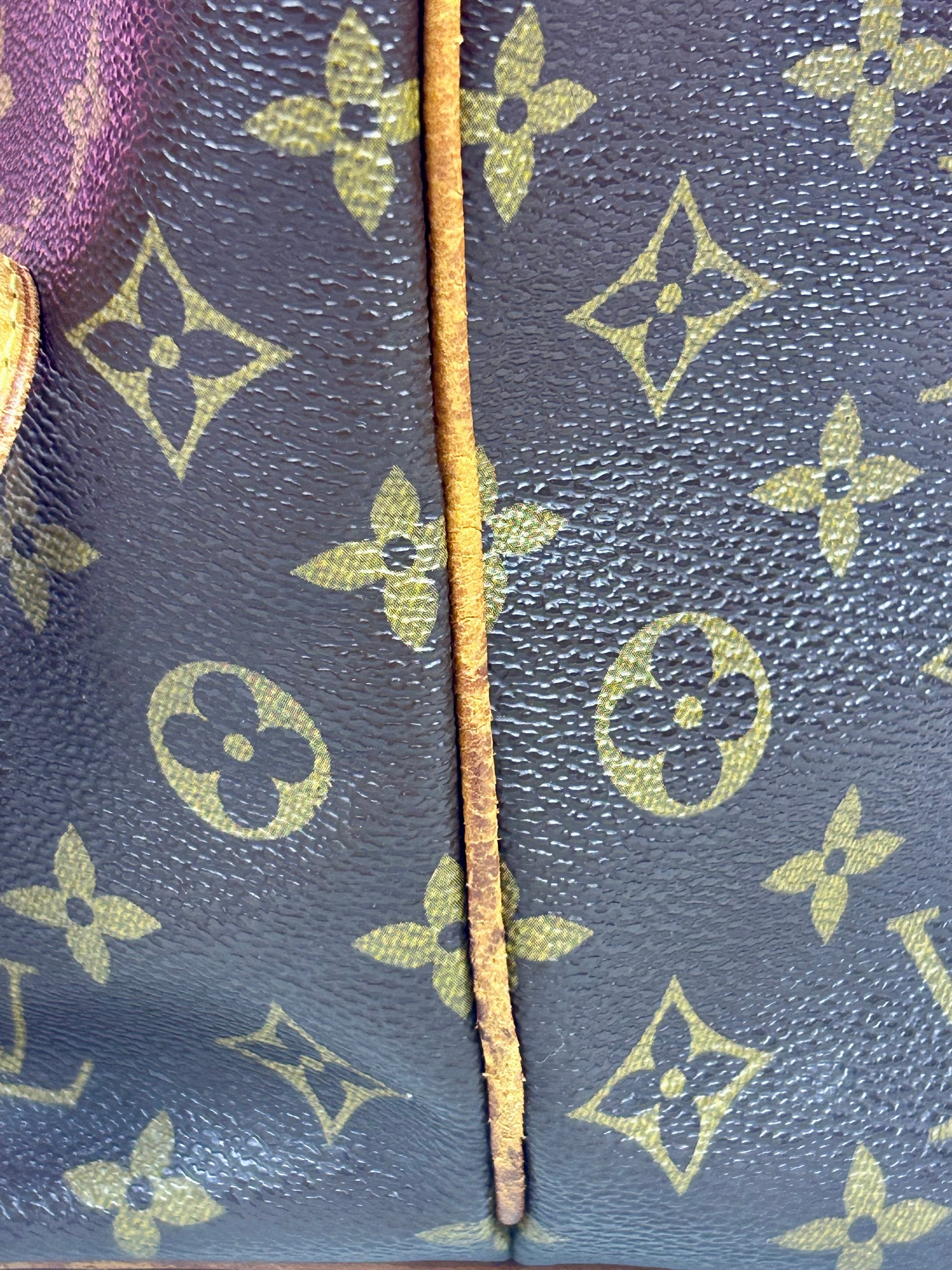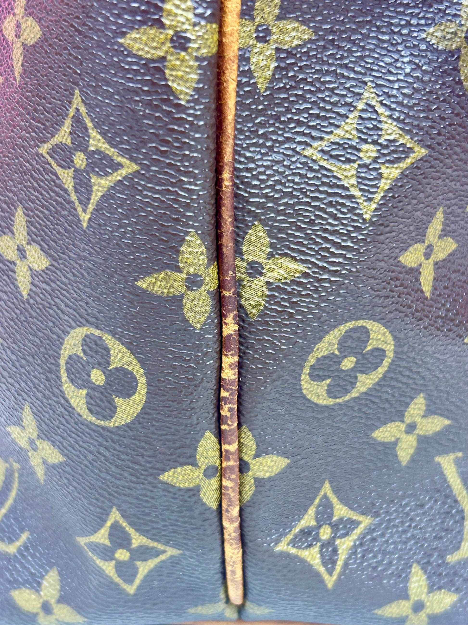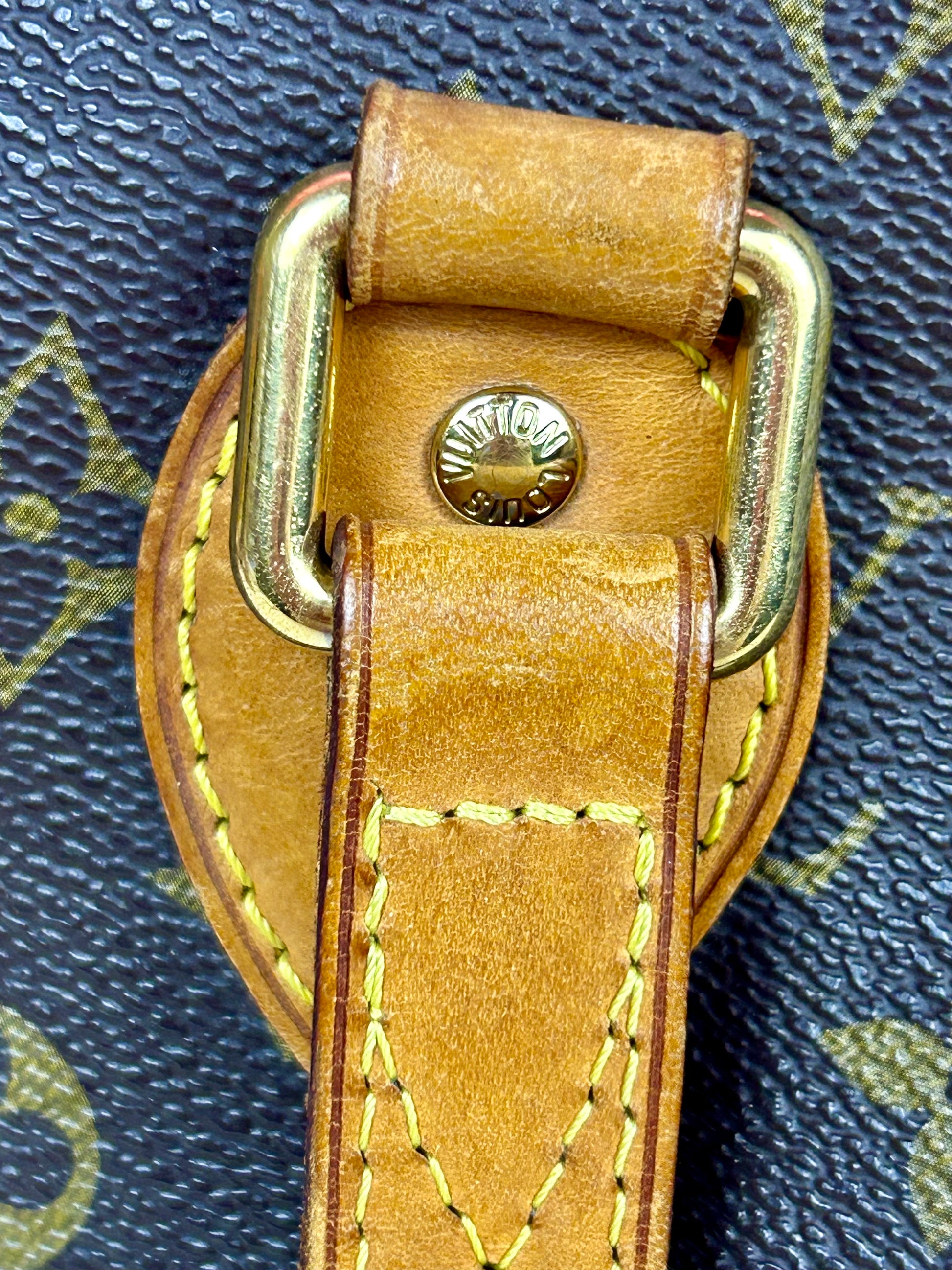 š Description: Canvas is in beautiful condition with no tears or cracks. Piping shows exposures on three of the four bottom corners with discoloration and wearing throughout. Leather trim has some darkening but no cracks or tears. Leather handles are in great condition. Leather strap is also in great condition, with some signs of wear and darkening but no cracks. Interior has staining in the pockets but is otherwise clean. Zipper pulls smoothly. Hardware remains shiny.