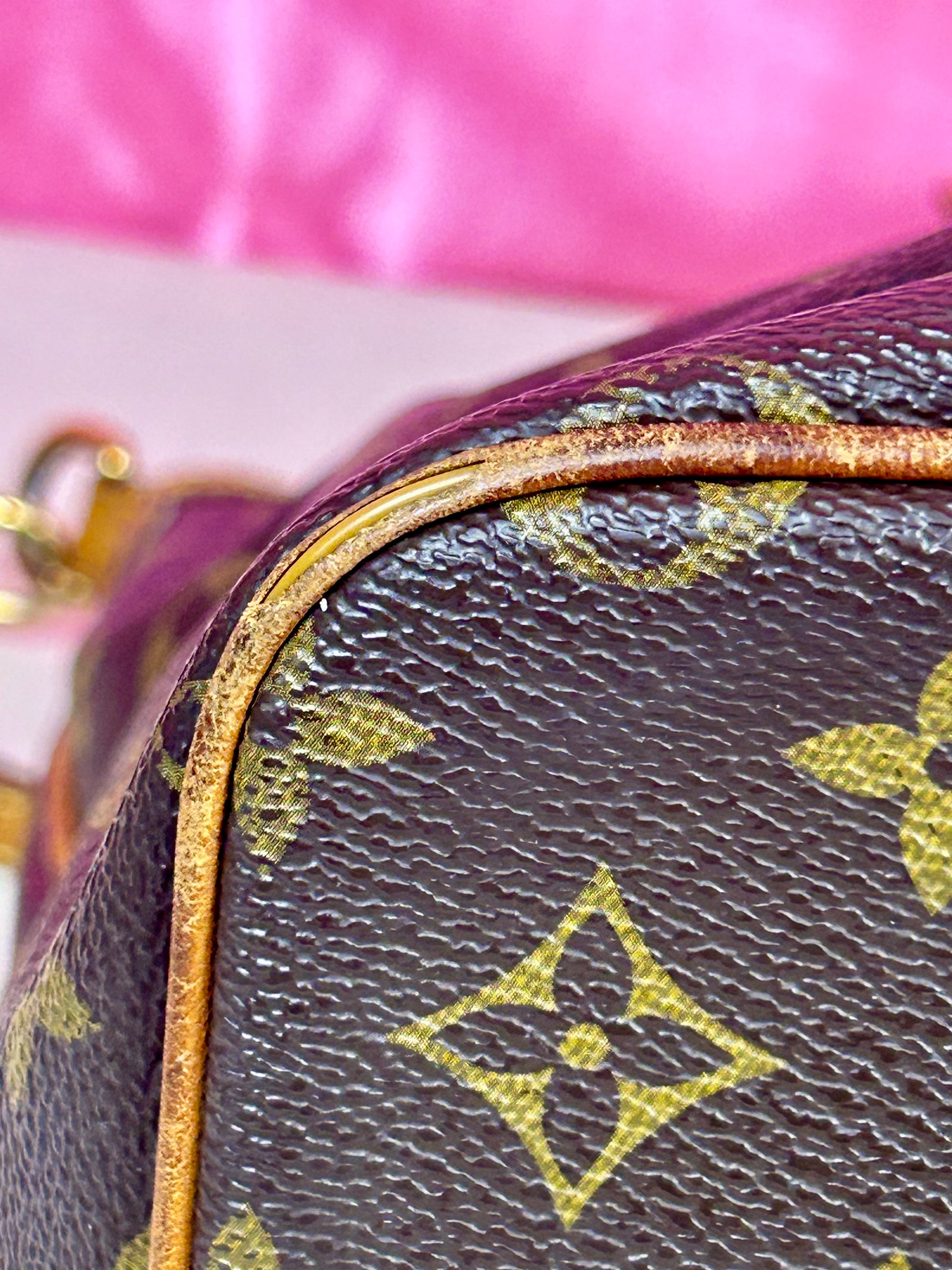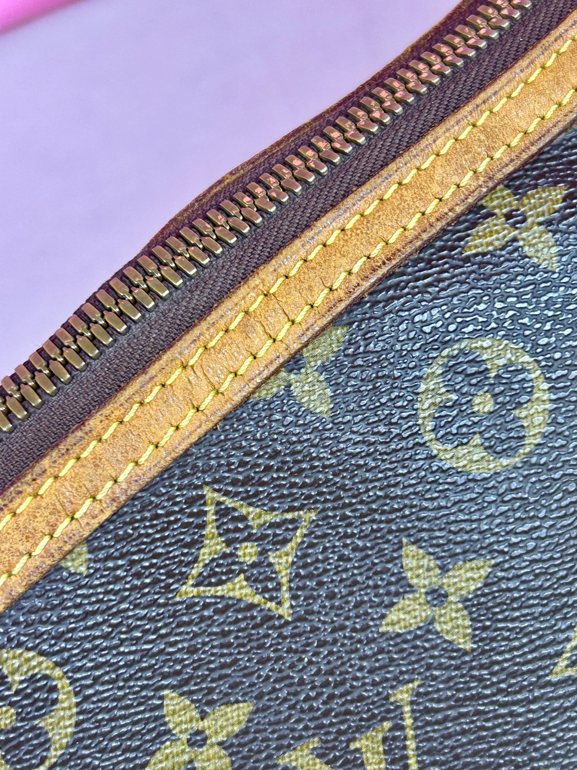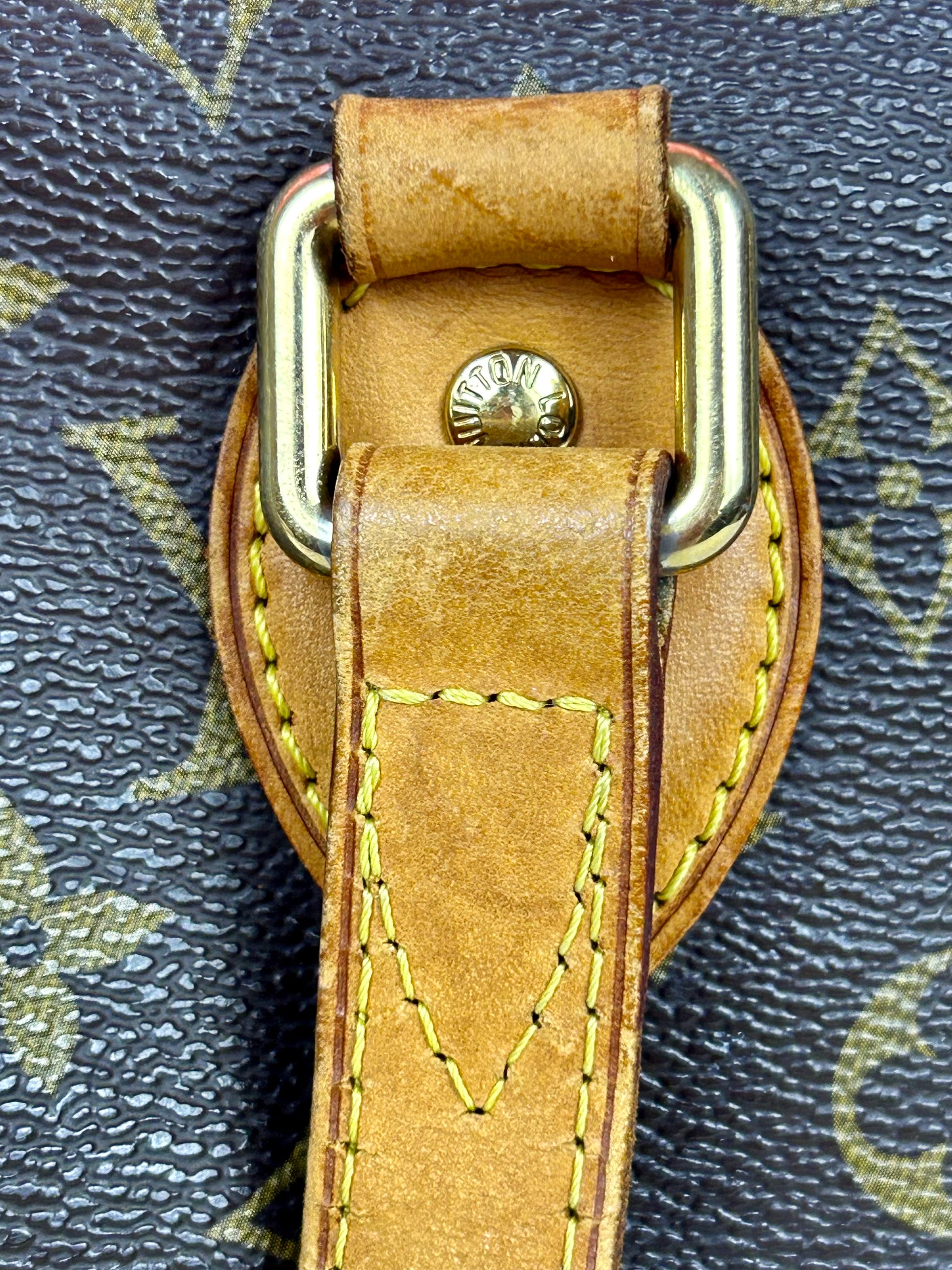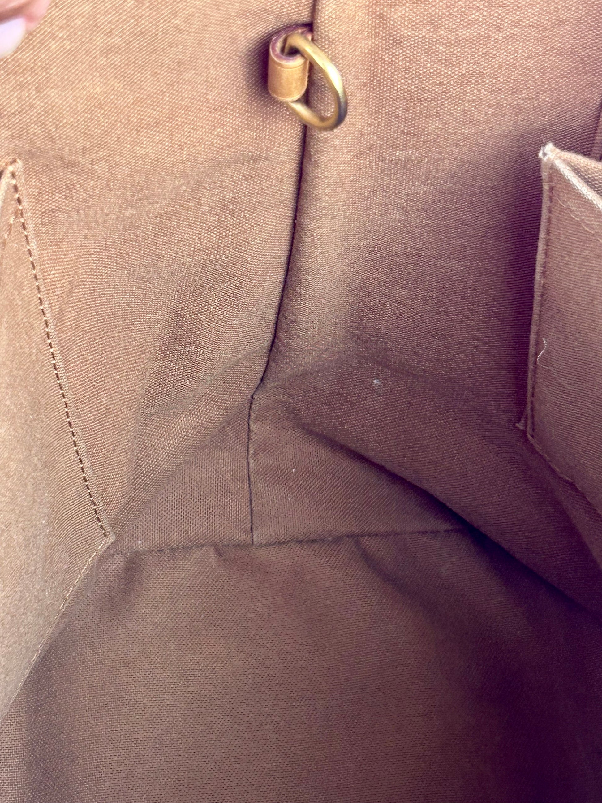 š Description: Canvas is in beautiful condition with no tears or cracks. Piping shows exposures on three of the four bottom corners with discoloration and wearing throughout. Leather trim has some darkening but no cracks or tears. Leather handles are in great condition. Leather strap is also in great condition, with some signs of wear and darkening but no cracks. Interior has staining in the pockets but is otherwise clean. Zipper pulls smoothly. Hardware remains shiny.