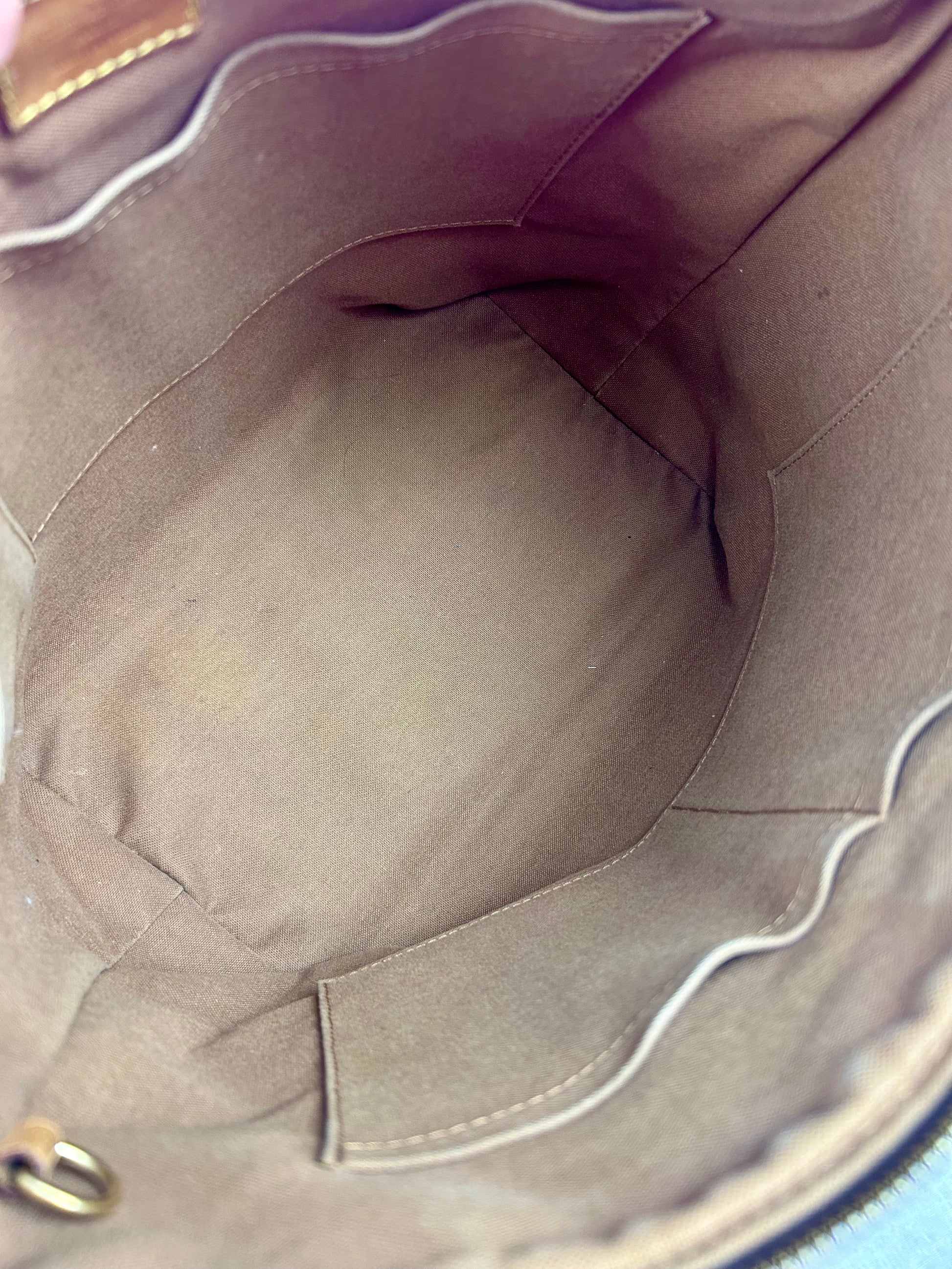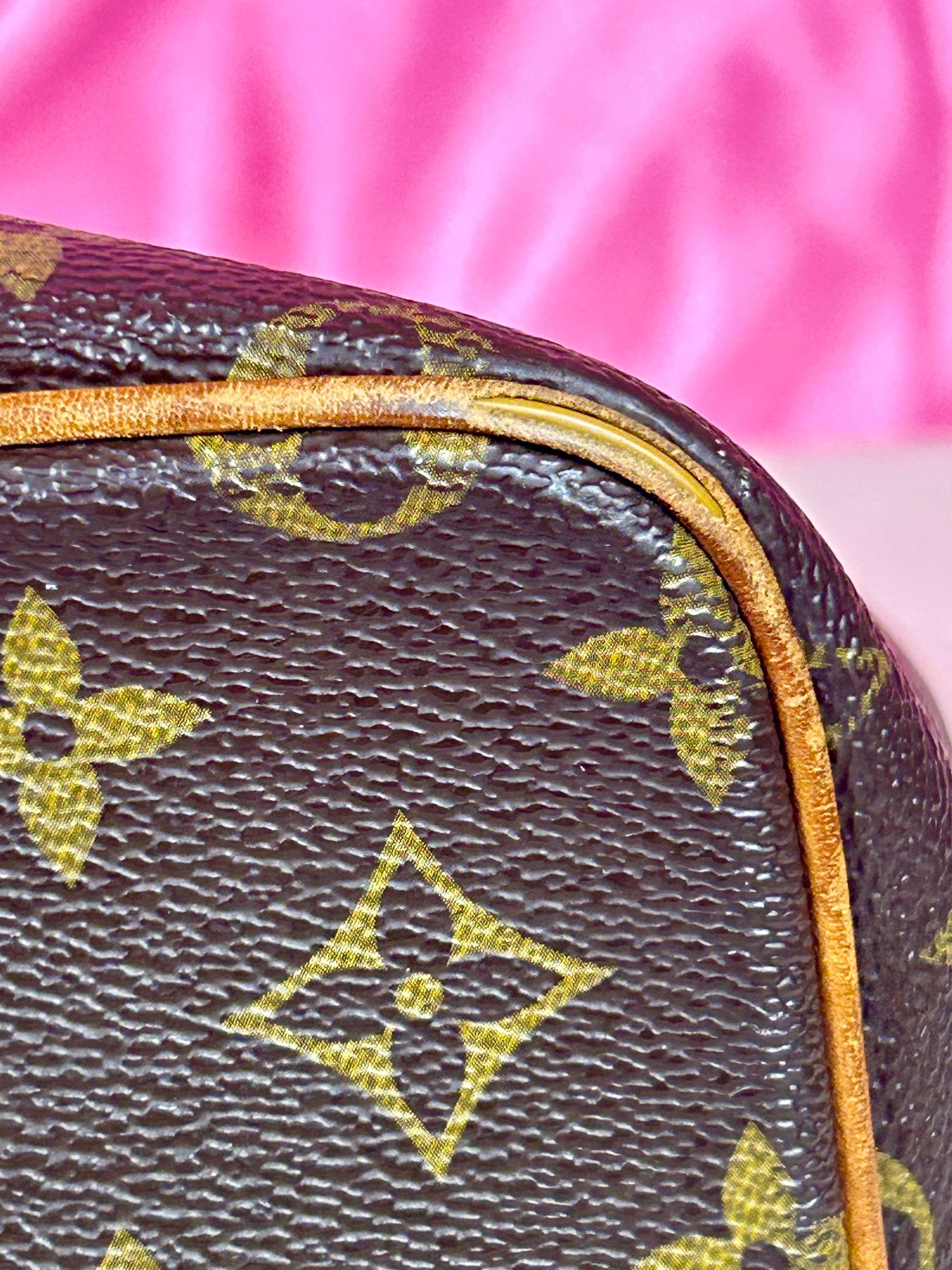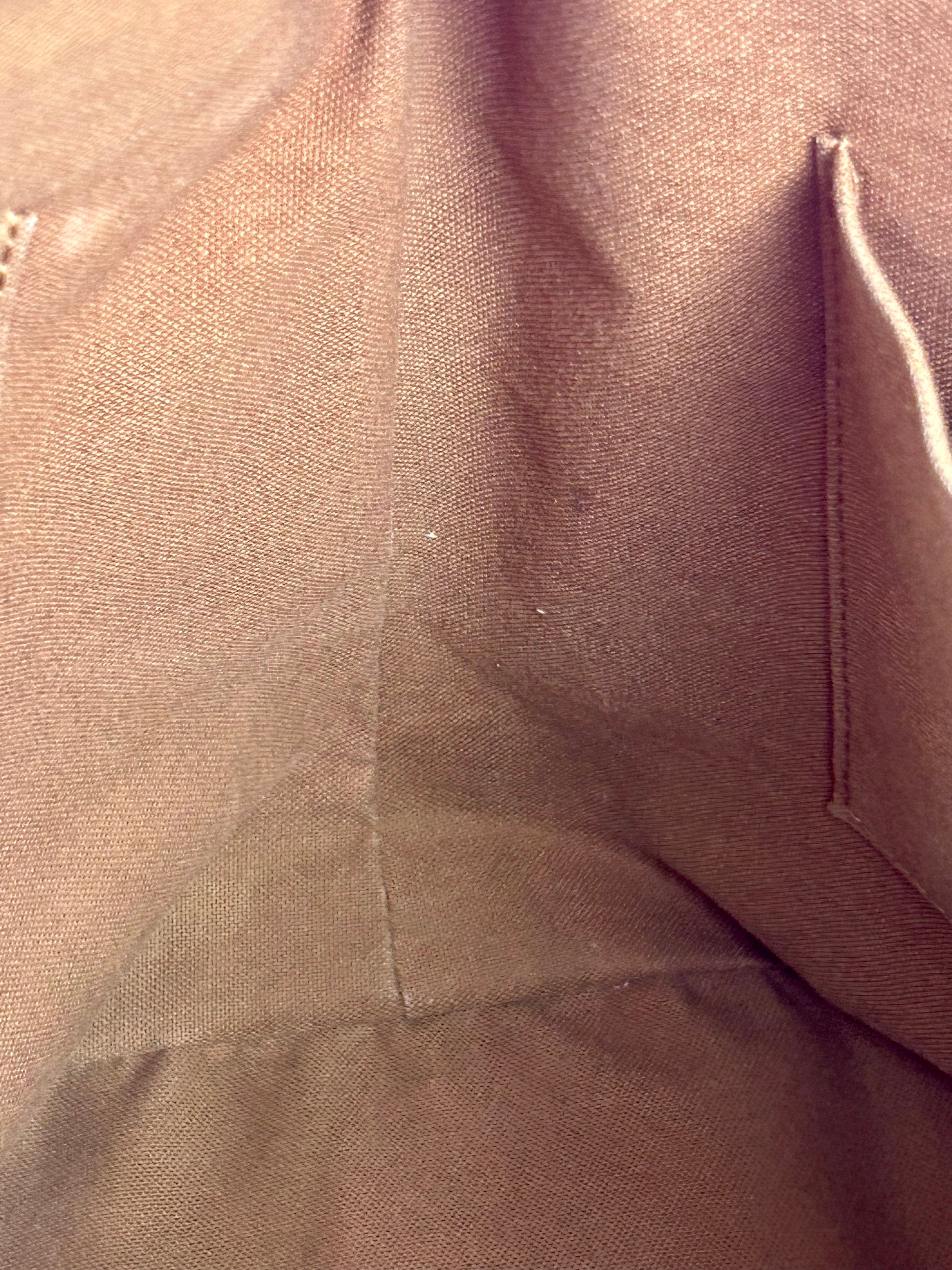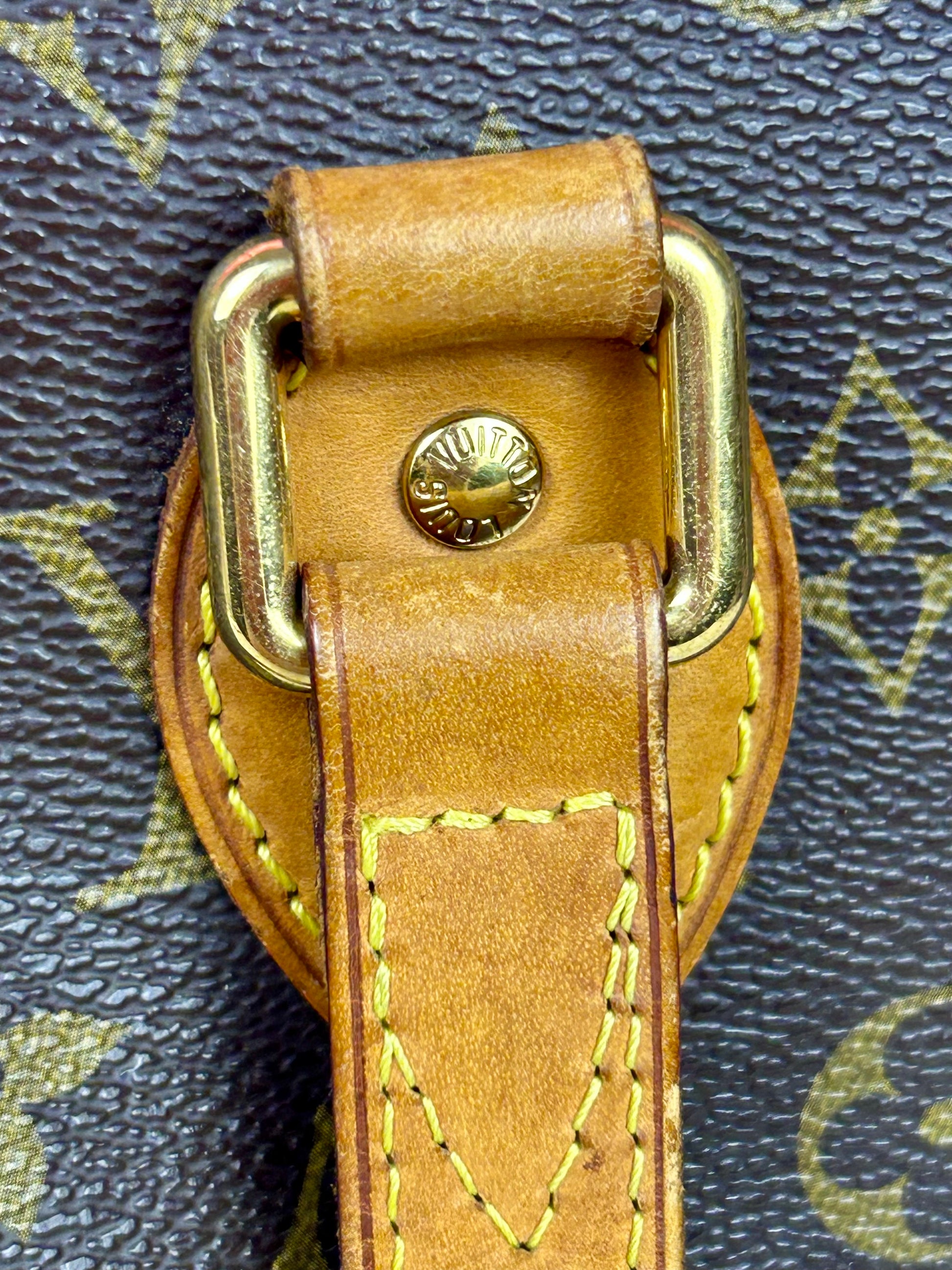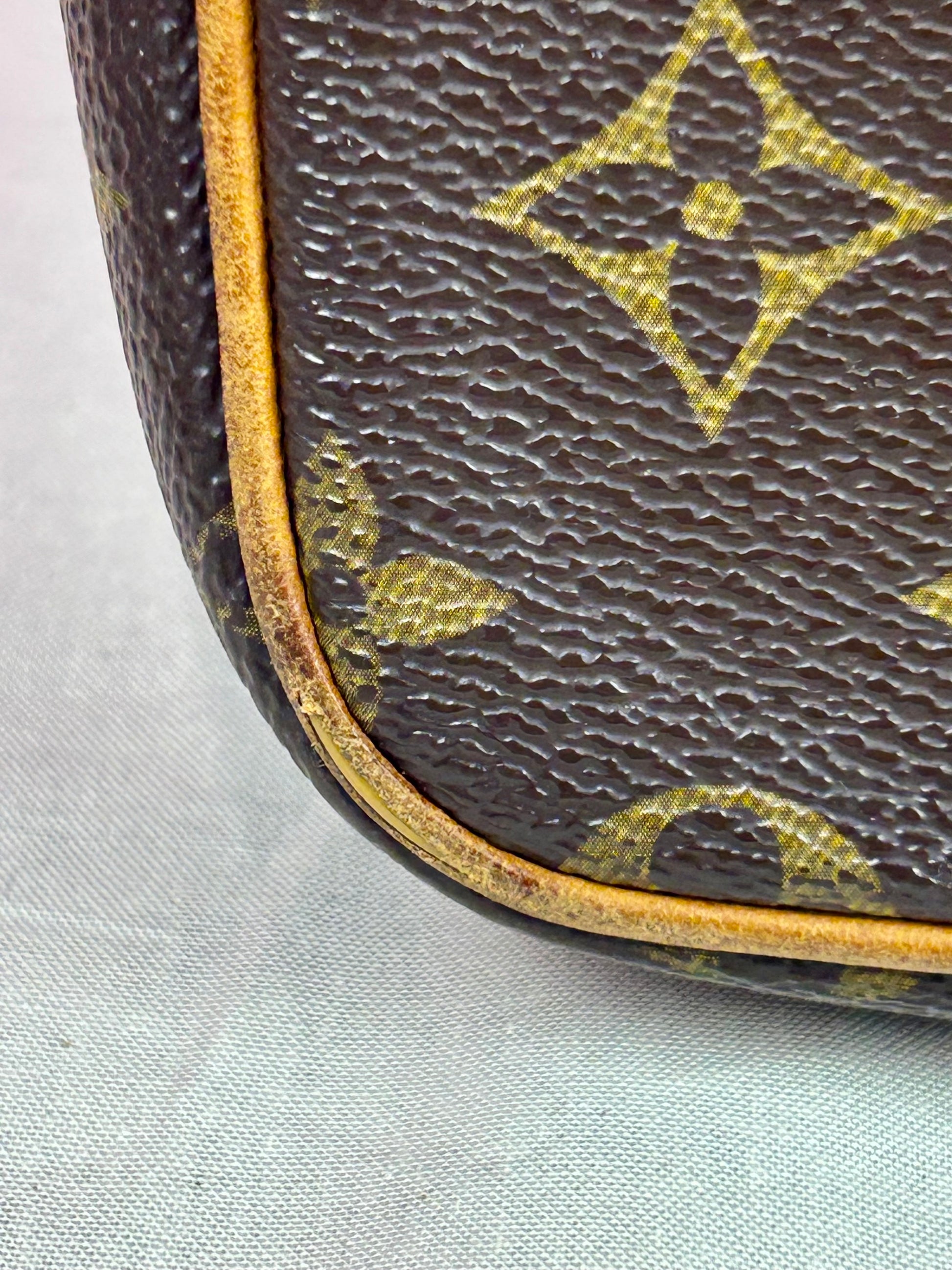 š Description: Canvas is in beautiful condition with no tears or cracks. Piping shows exposures on three of the four bottom corners with discoloration and wearing throughout. Leather trim has some darkening but no cracks or tears. Leather handles are in great condition. Leather strap is also in great condition, with some signs of wear and darkening but no cracks. Interior has staining in the pockets but is otherwise clean. Zipper pulls smoothly. Hardware remains shiny.