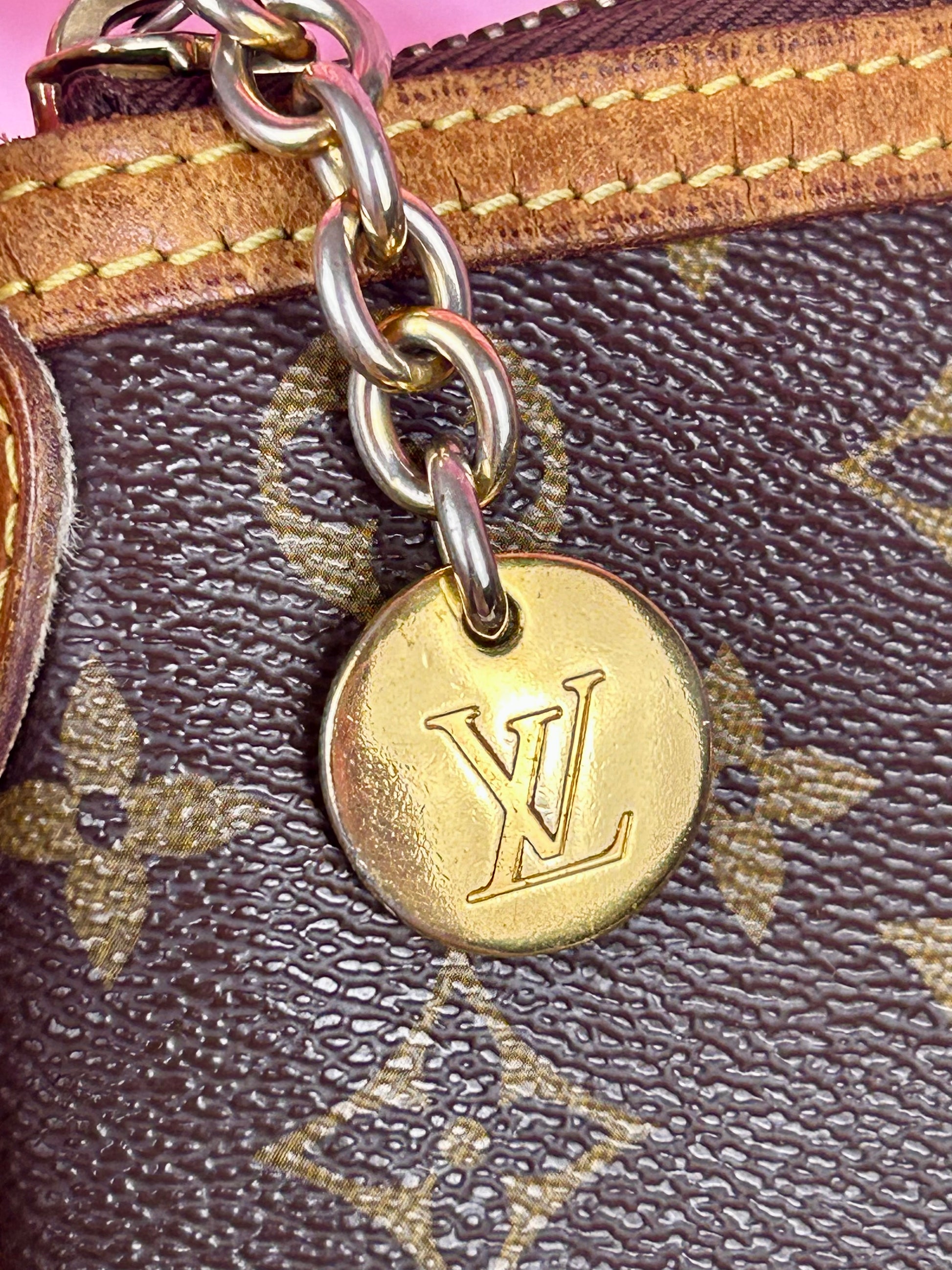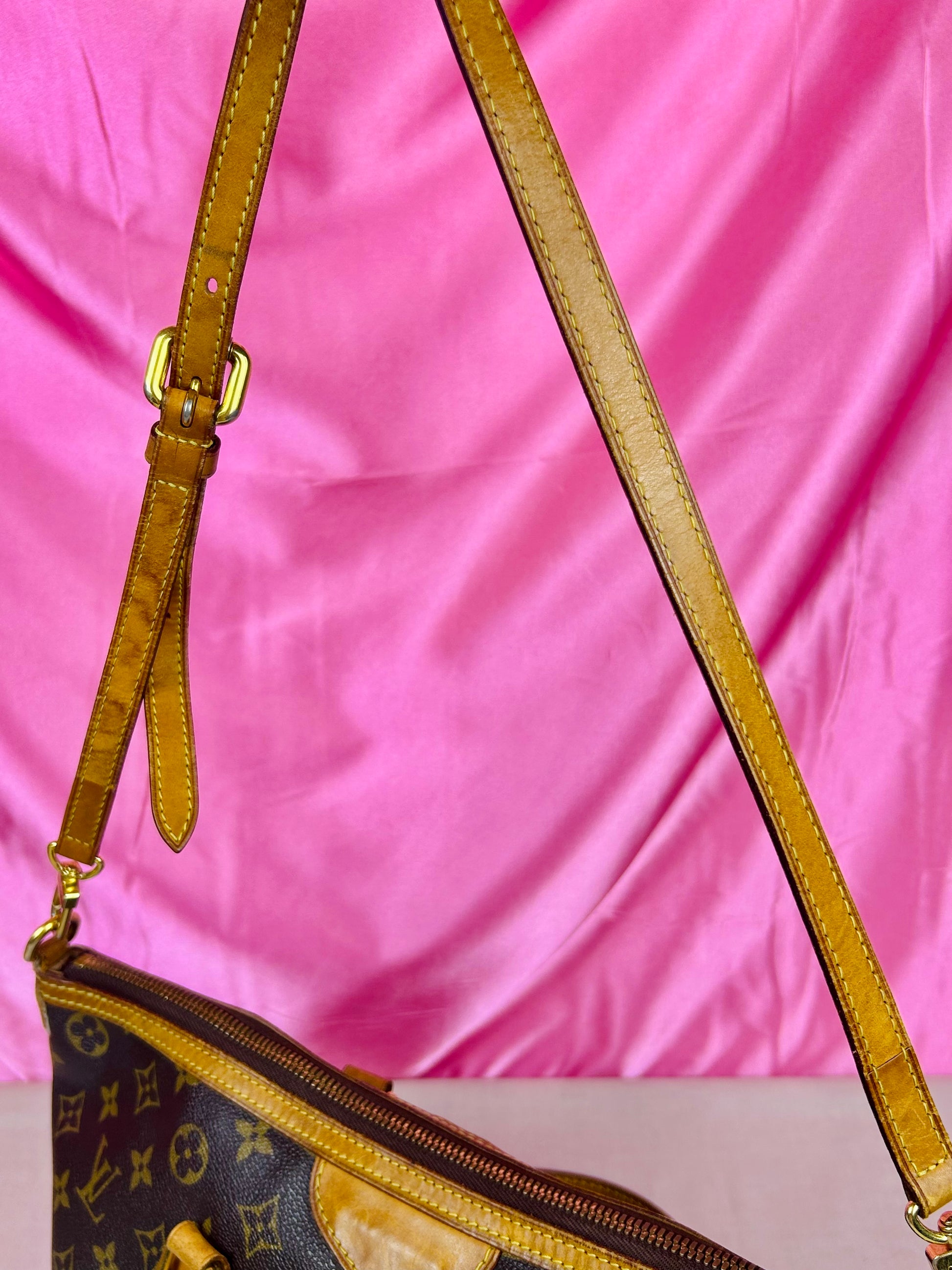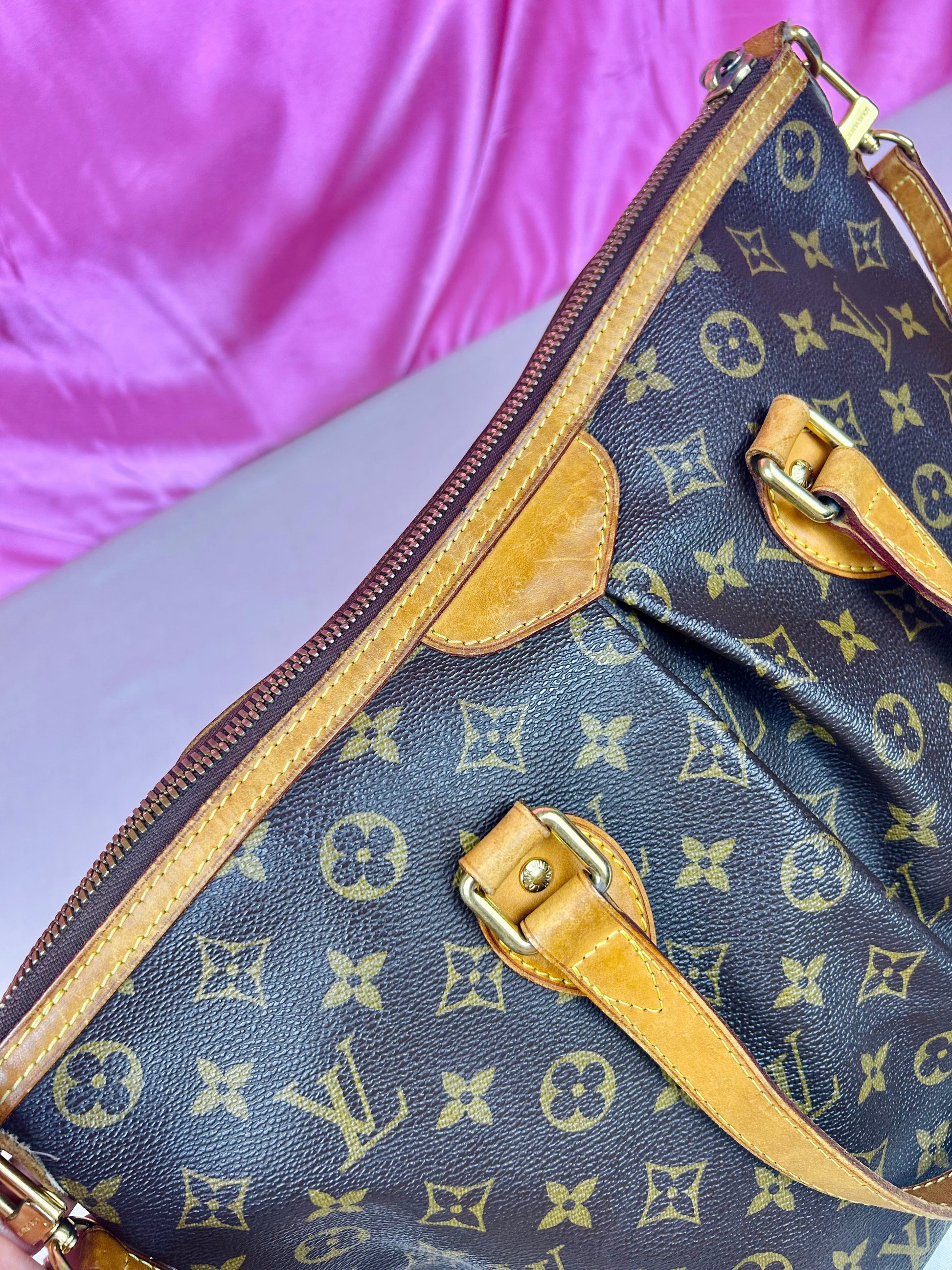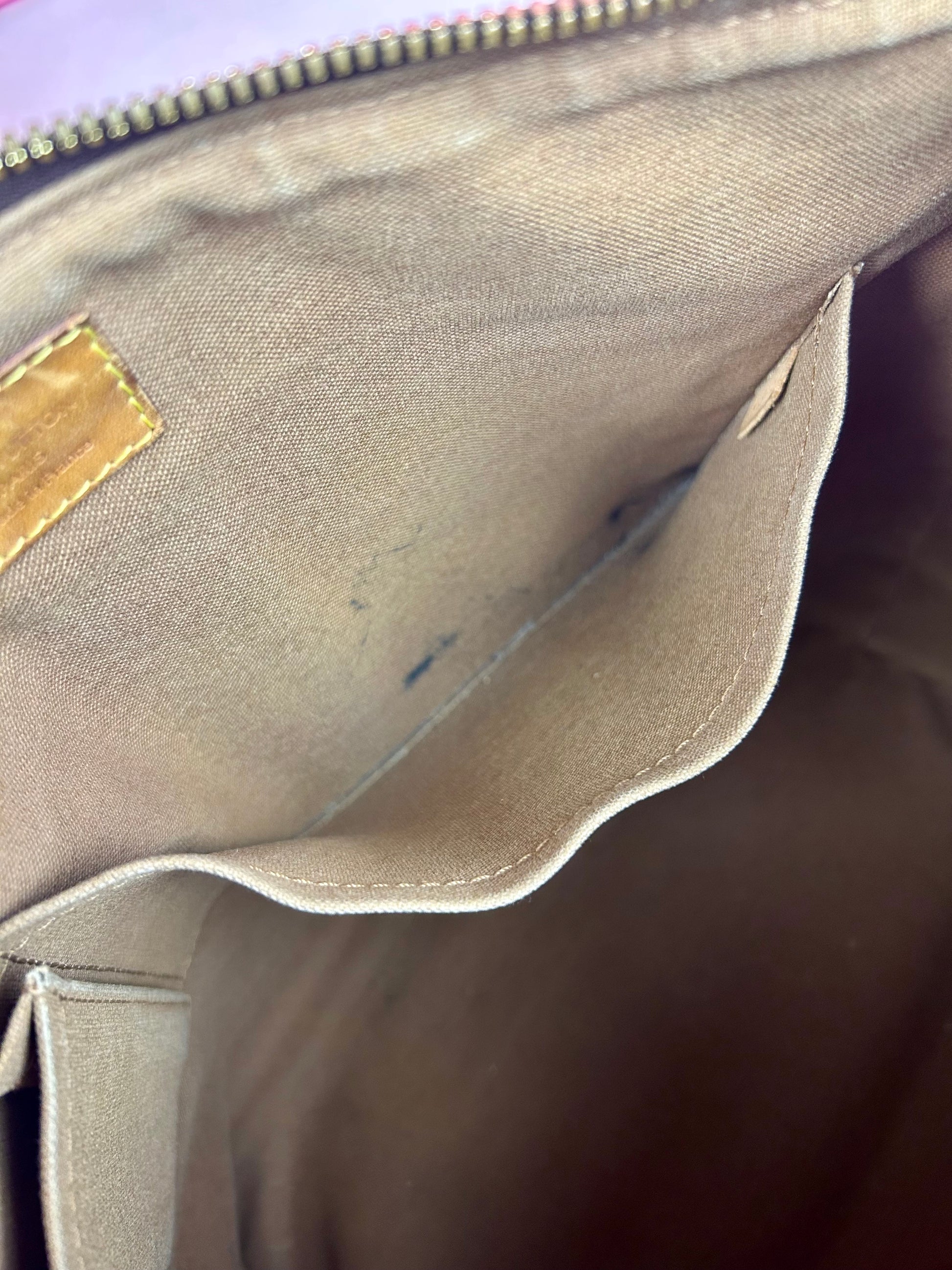 š Description: Canvas is in beautiful condition with no tears or cracks. Piping shows exposures on three of the four bottom corners with discoloration and wearing throughout. Leather trim has some darkening but no cracks or tears. Leather handles are in great condition. Leather strap is also in great condition, with some signs of wear and darkening but no cracks. Interior has staining in the pockets but is otherwise clean. Zipper pulls smoothly. Hardware remains shiny.
