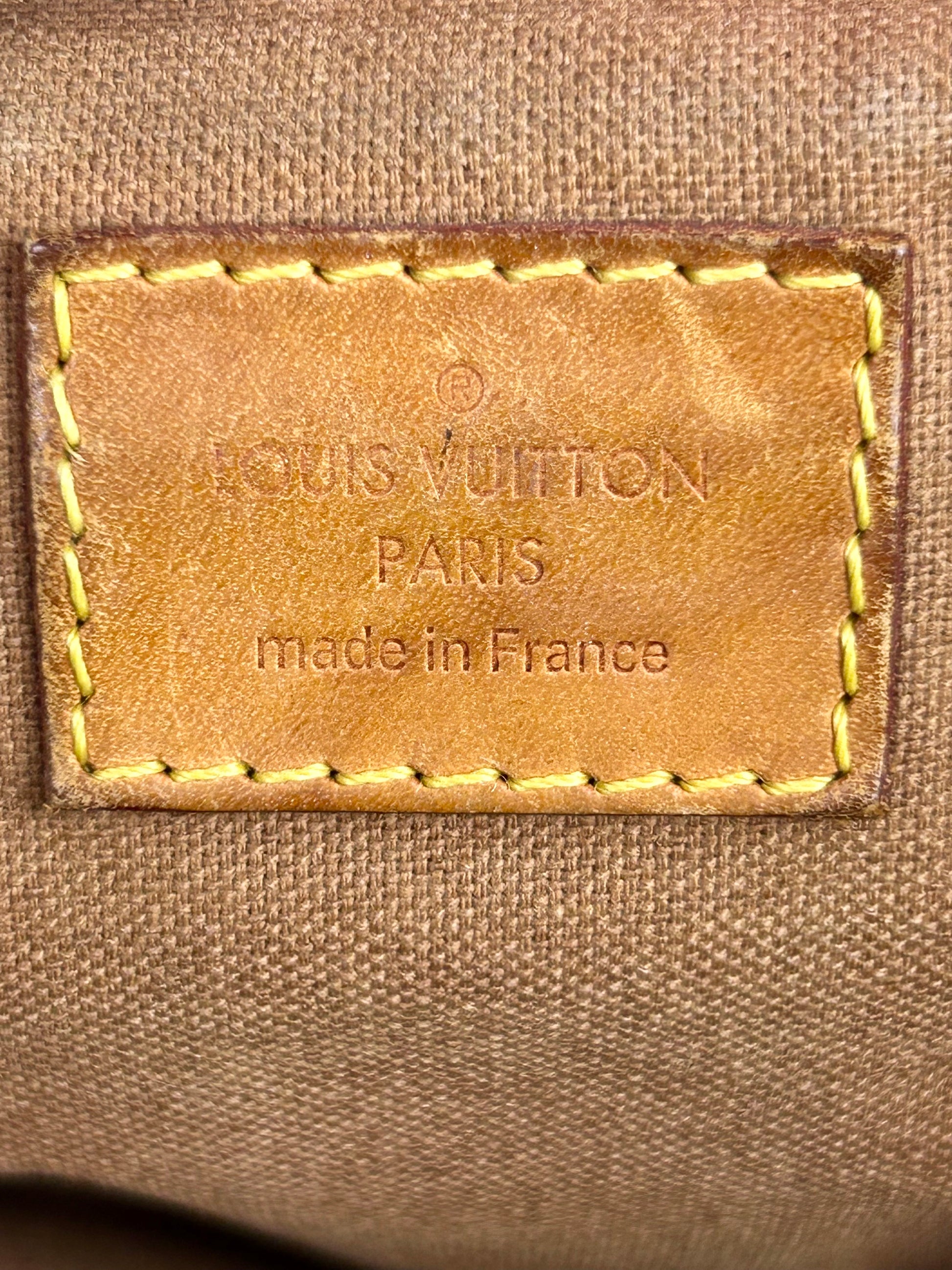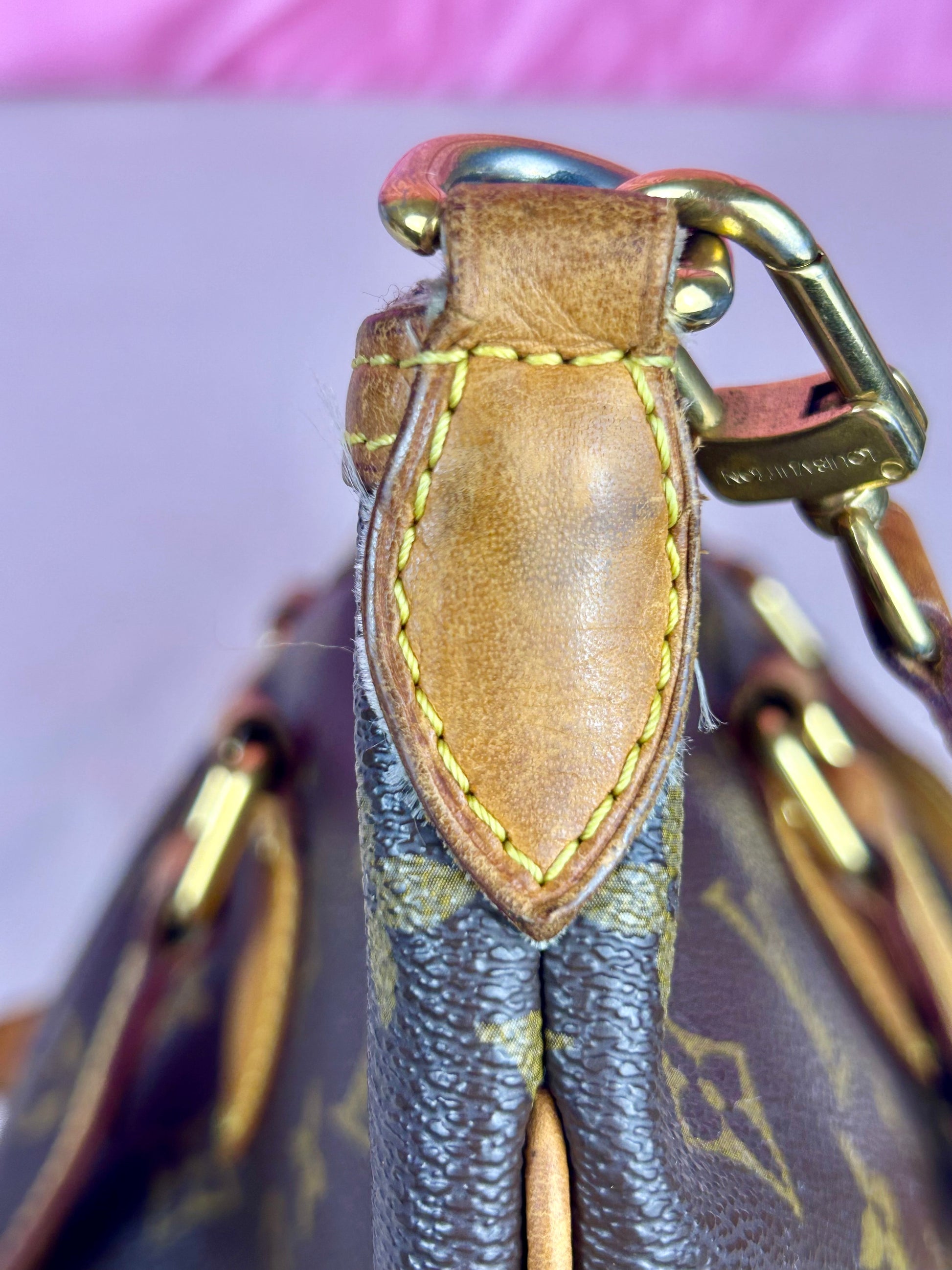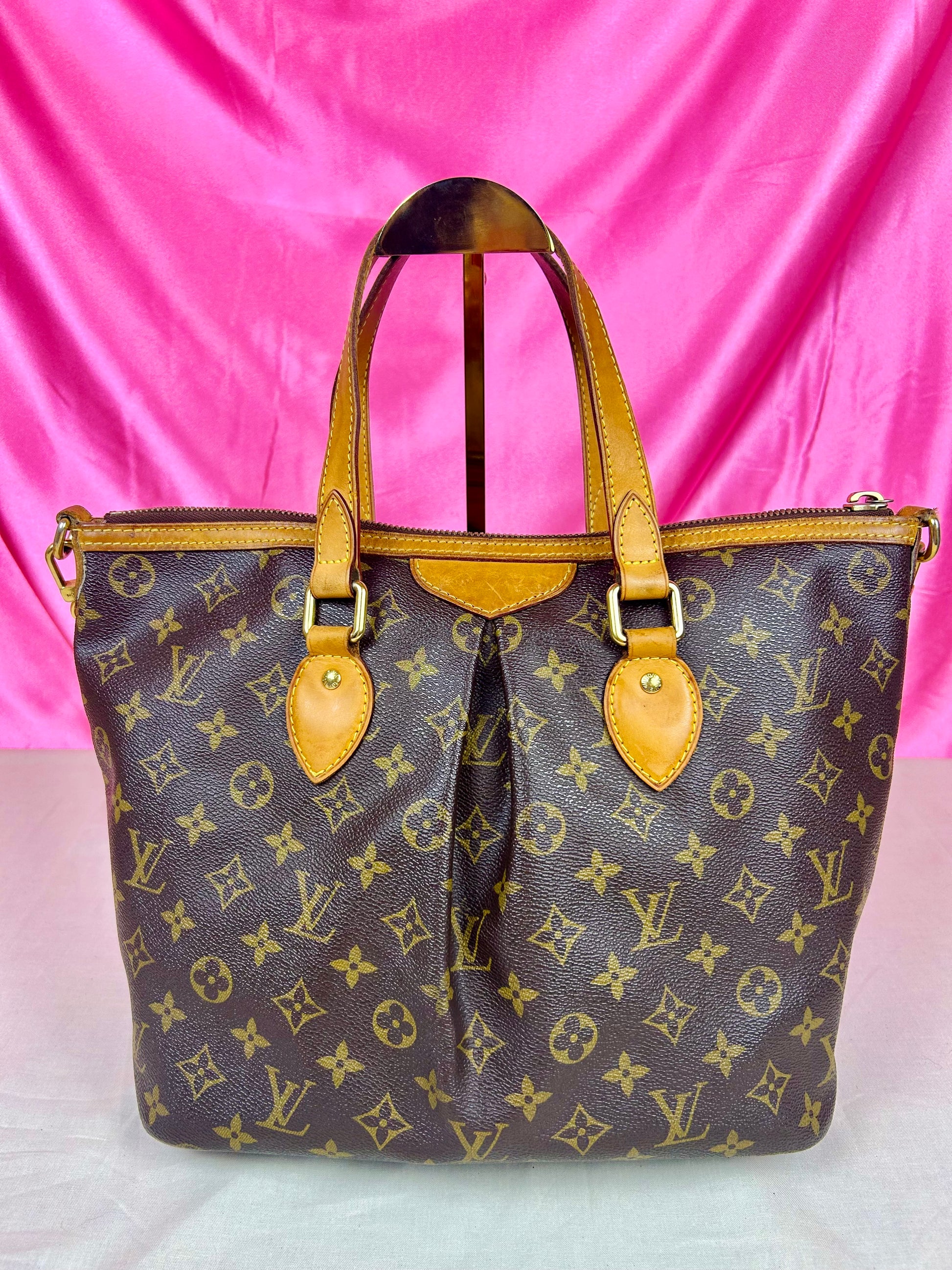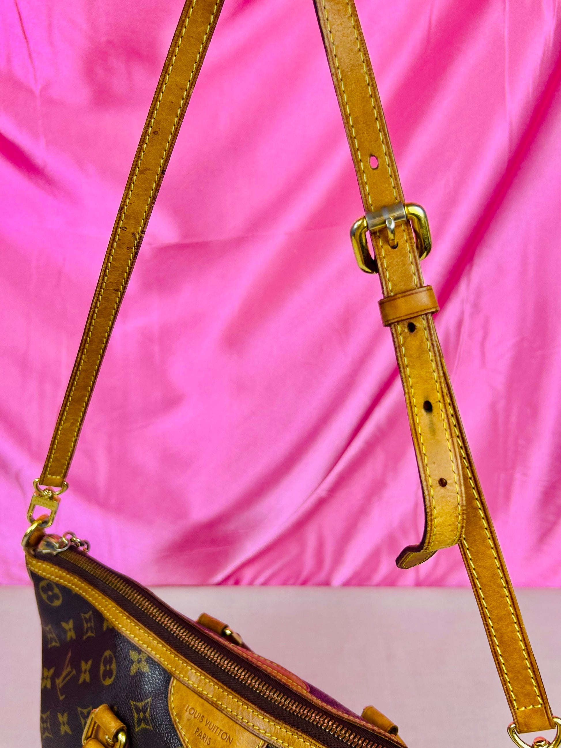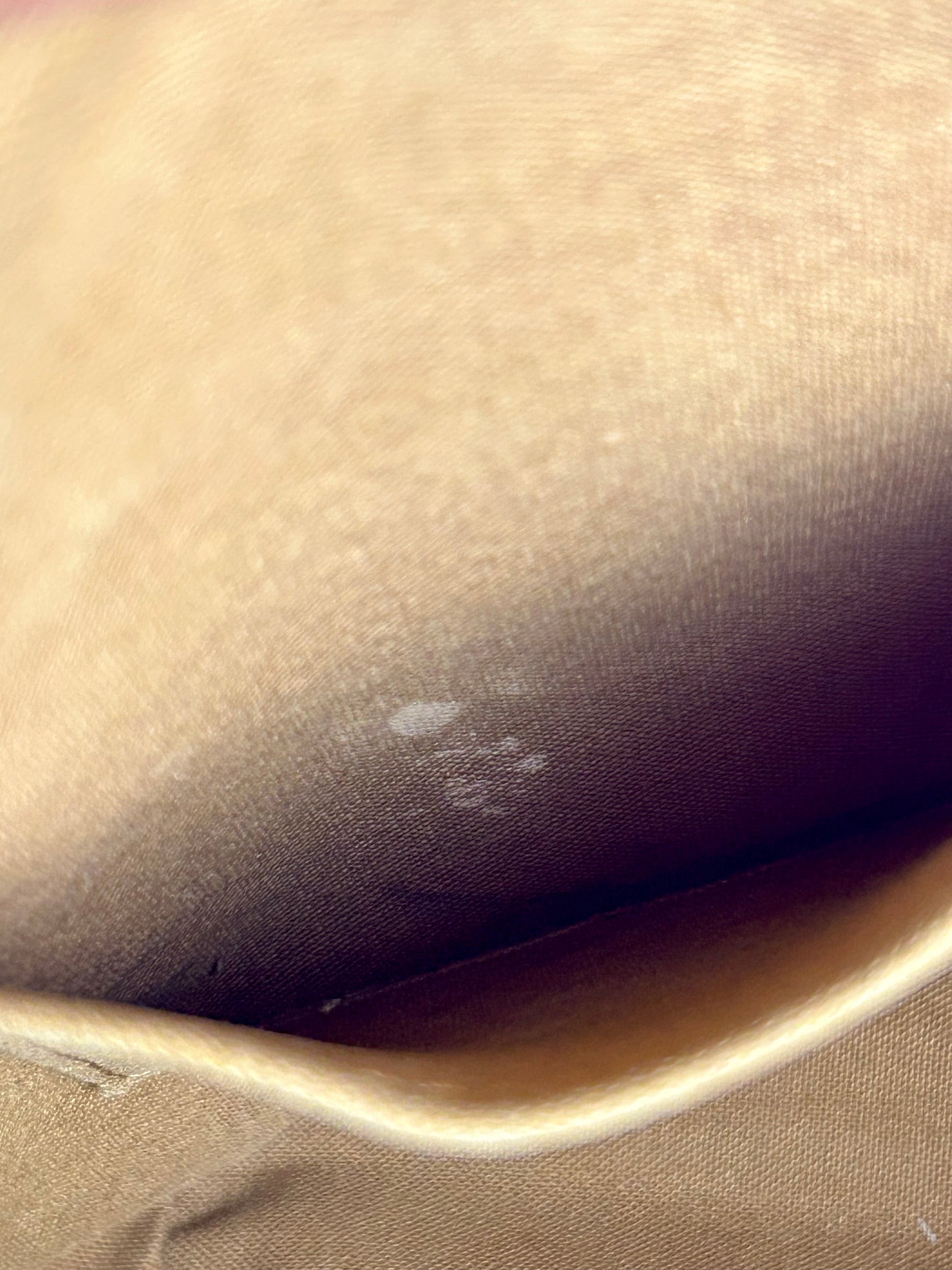 š Description: Canvas is in beautiful condition with no tears or cracks. Piping shows exposures on three of the four bottom corners with discoloration and wearing throughout. Leather trim has some darkening but no cracks or tears. Leather handles are in great condition. Leather strap is also in great condition, with some signs of wear and darkening but no cracks. Interior has staining in the pockets but is otherwise clean. Zipper pulls smoothly. Hardware remains shiny.
