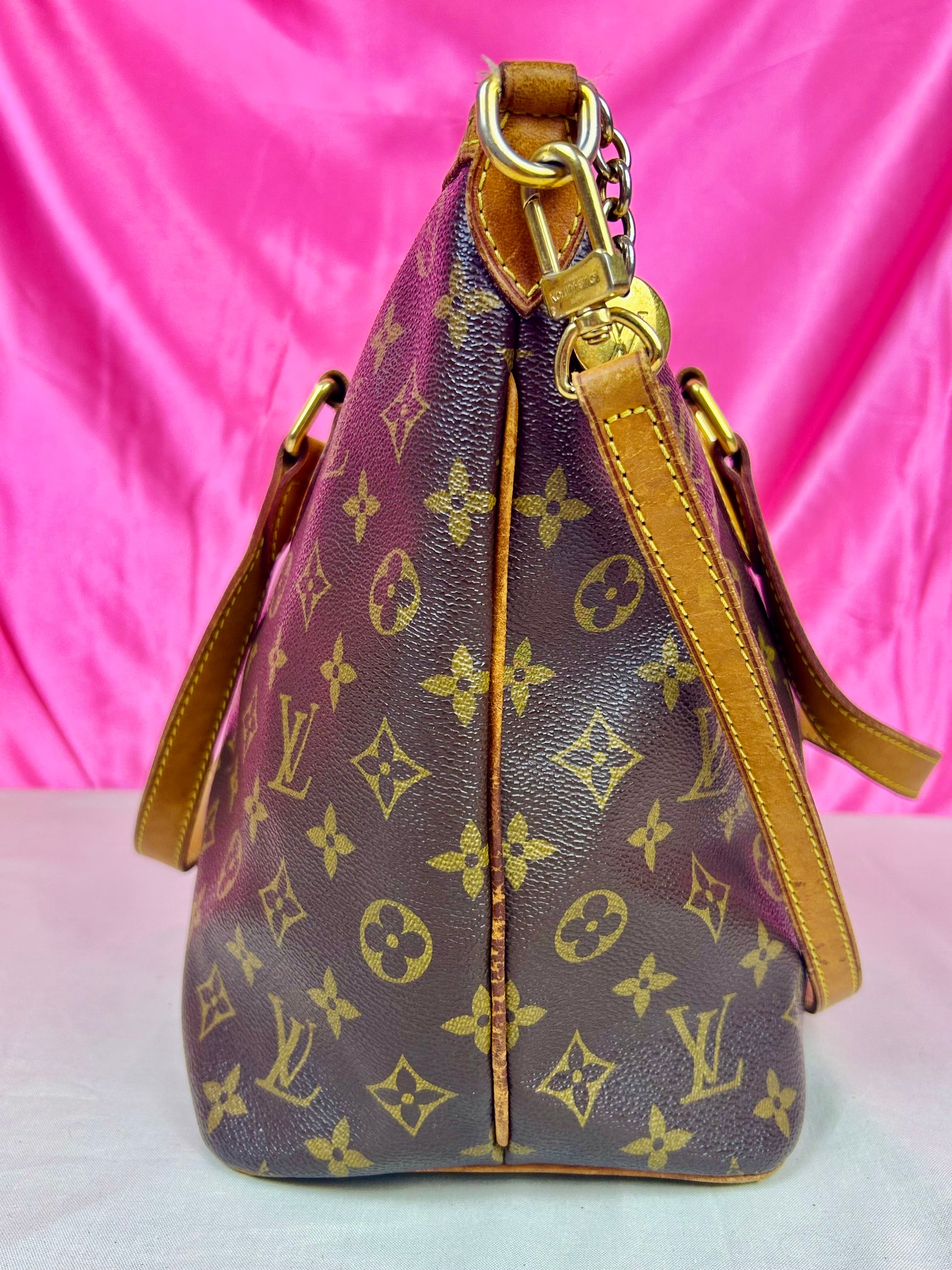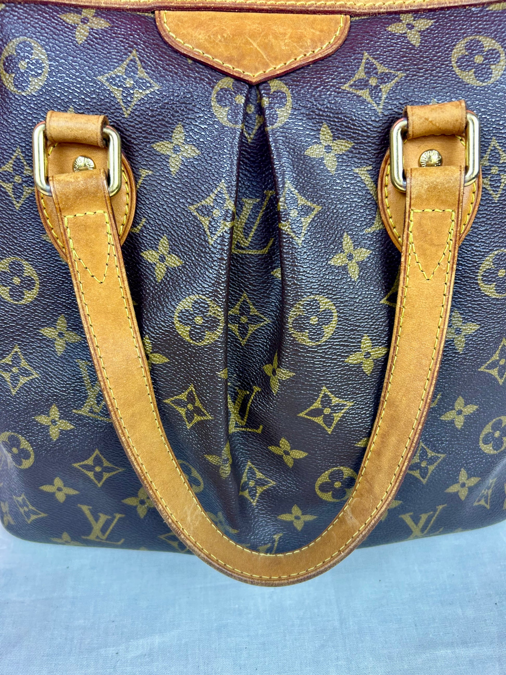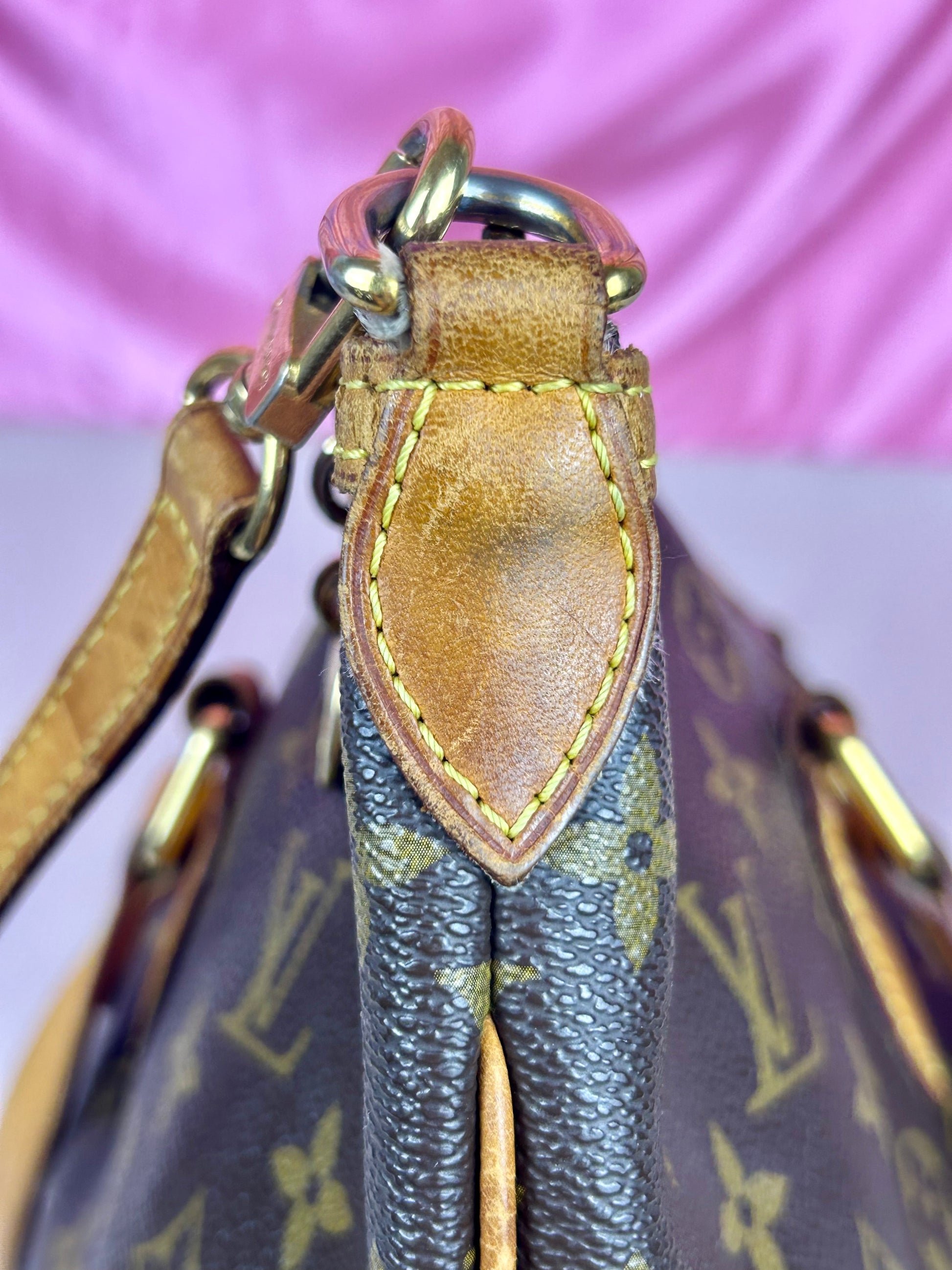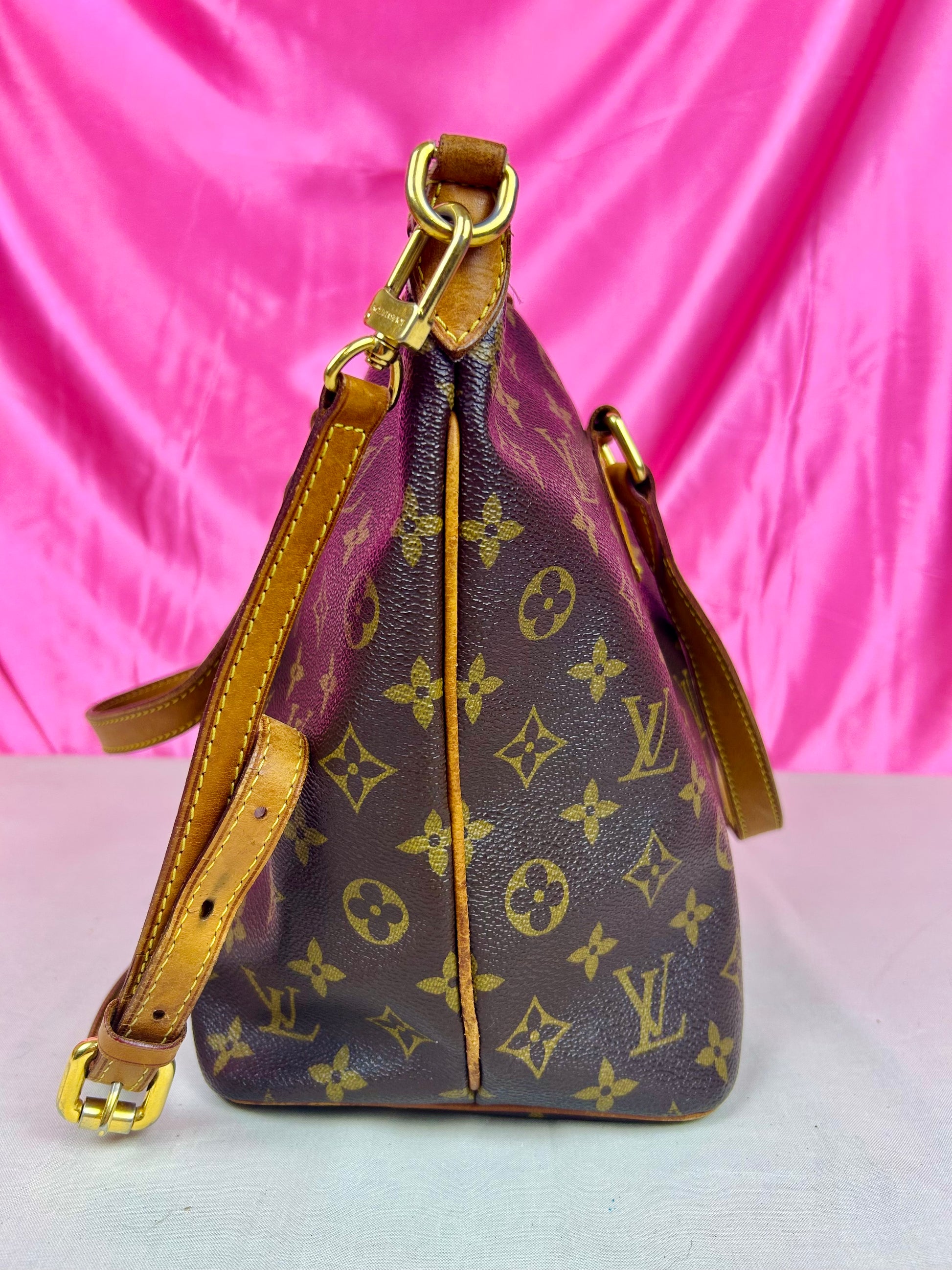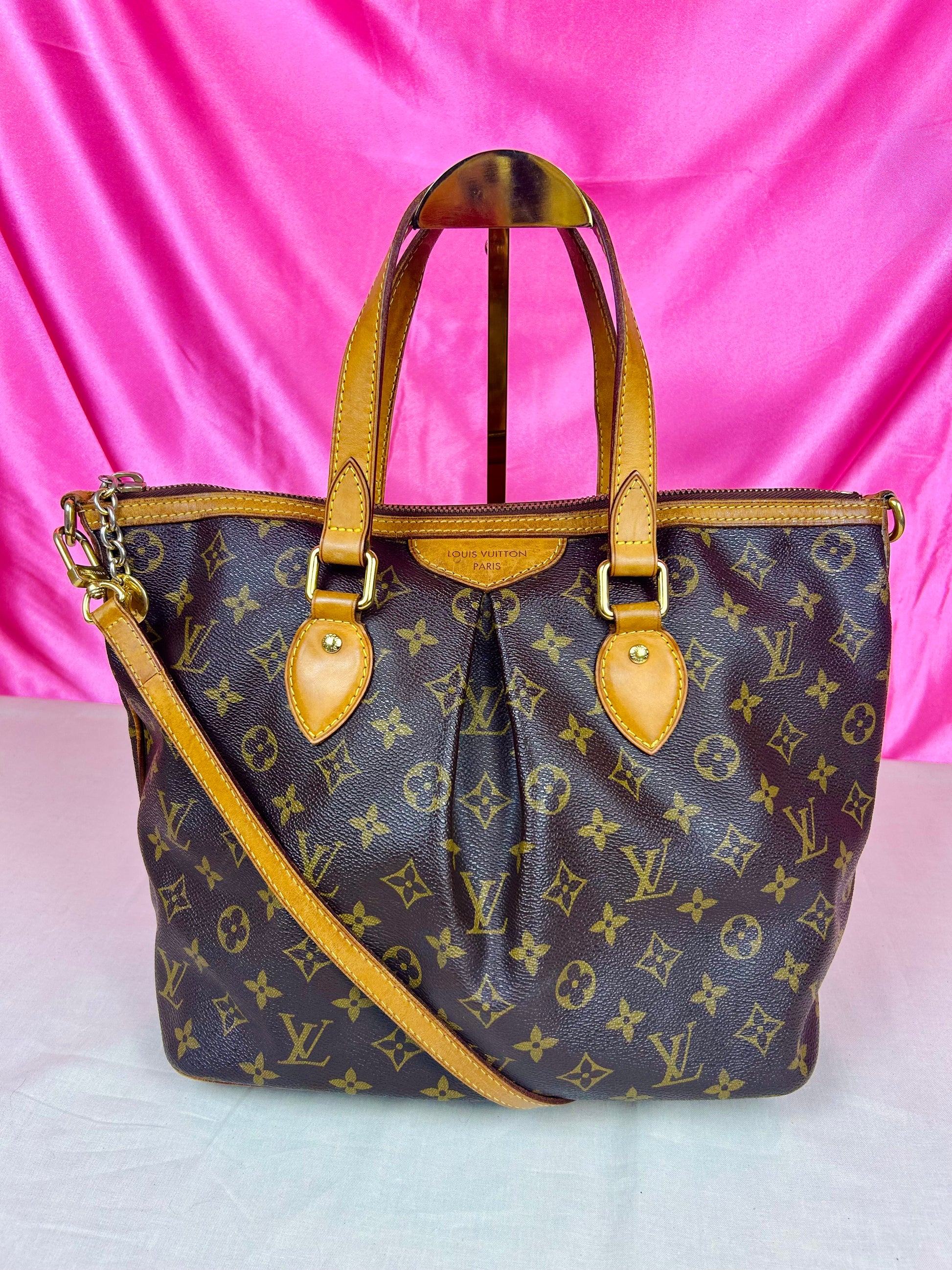 š Description: Canvas is in beautiful condition with no tears or cracks. Piping shows exposures on three of the four bottom corners with discoloration and wearing throughout. Leather trim has some darkening but no cracks or tears. Leather handles are in great condition. Leather strap is also in great condition, with some signs of wear and darkening but no cracks. Interior has staining in the pockets but is otherwise clean. Zipper pulls smoothly. Hardware remains shiny.