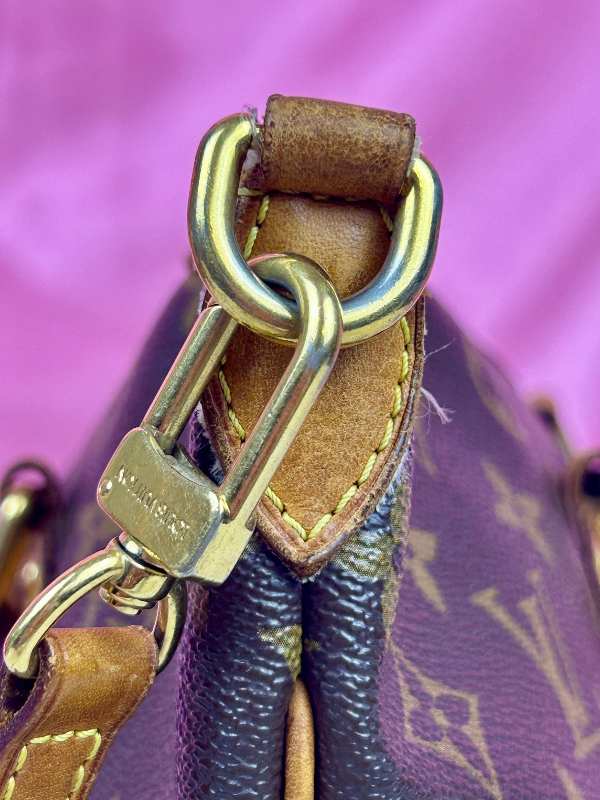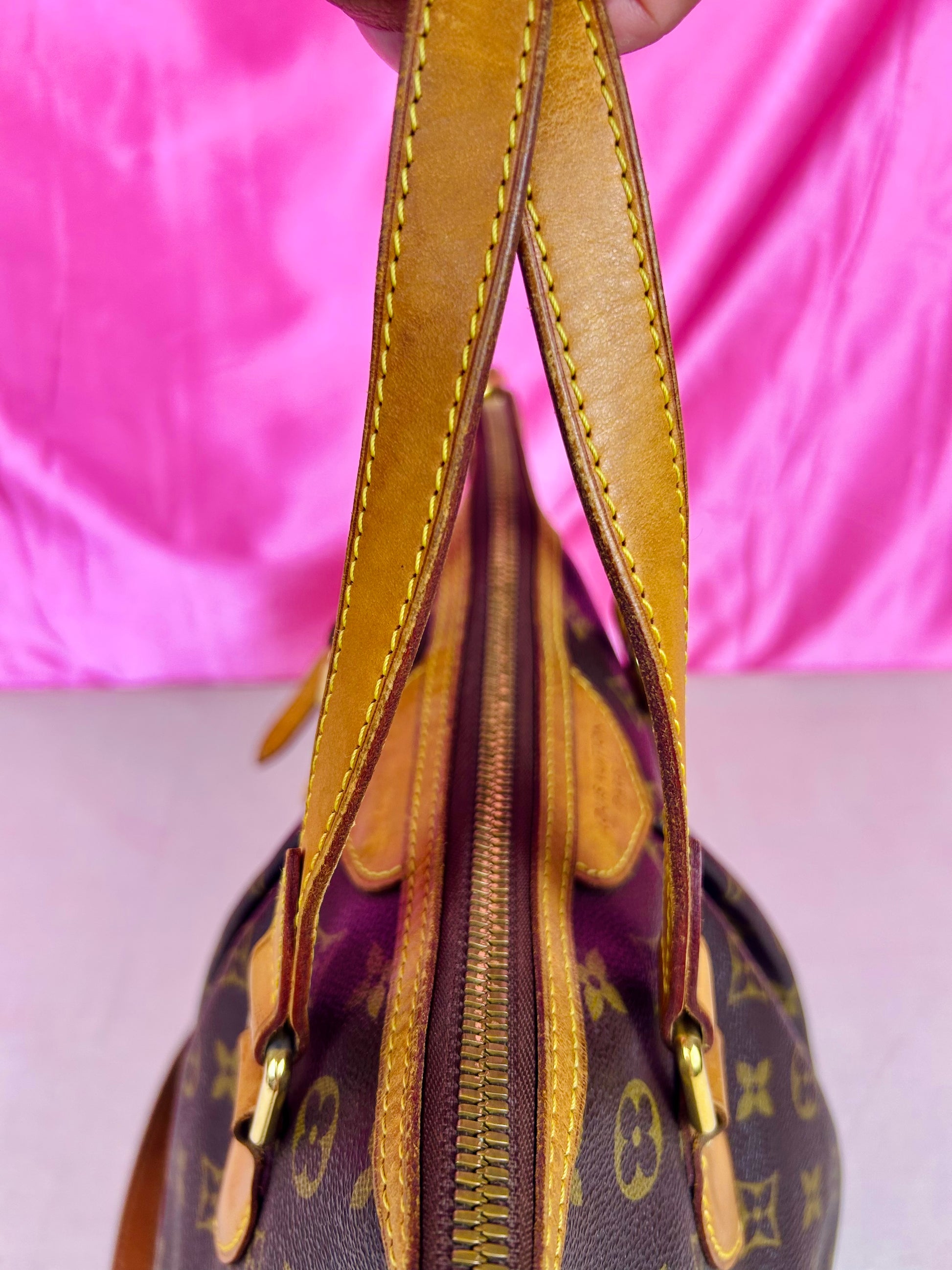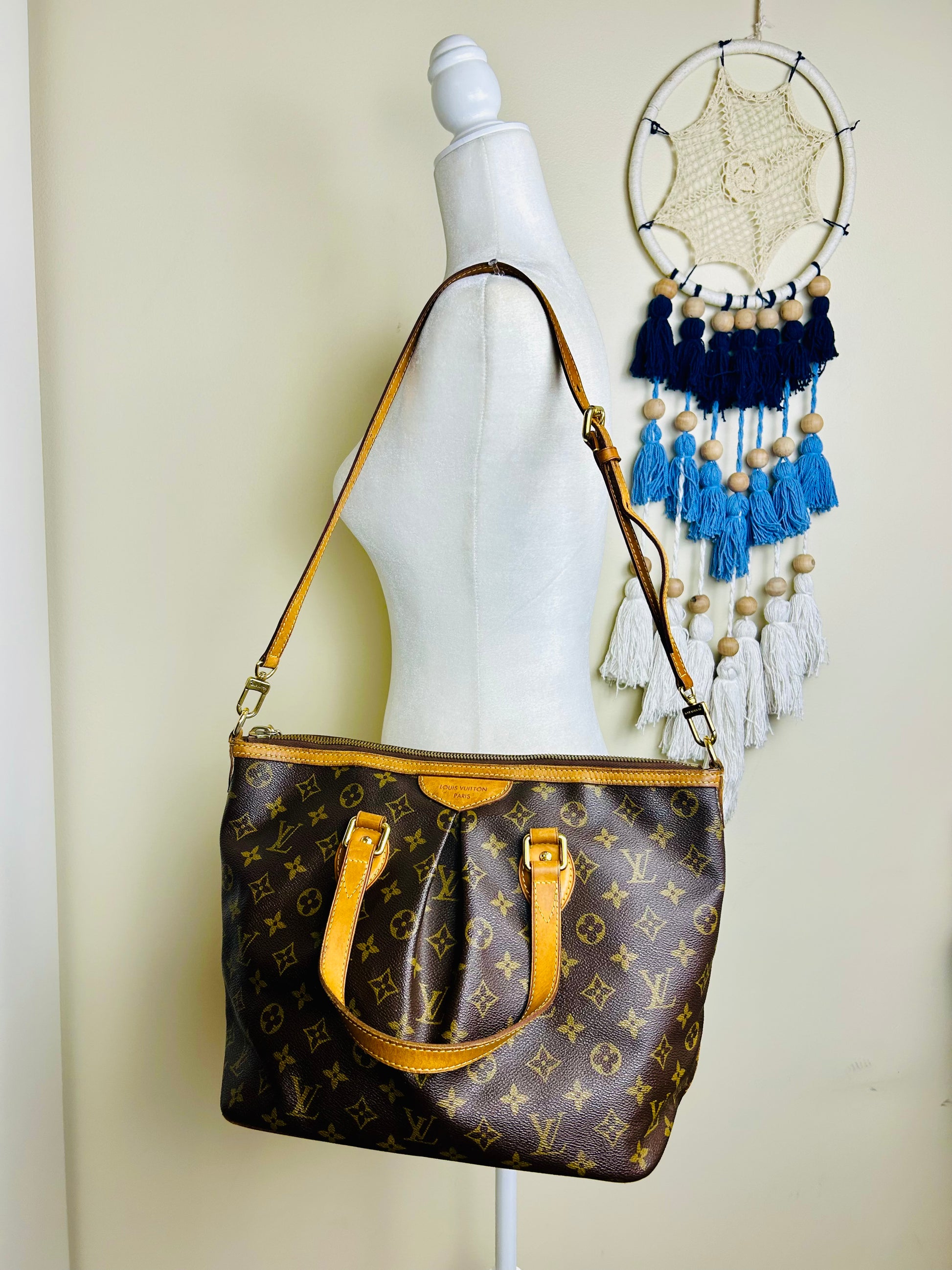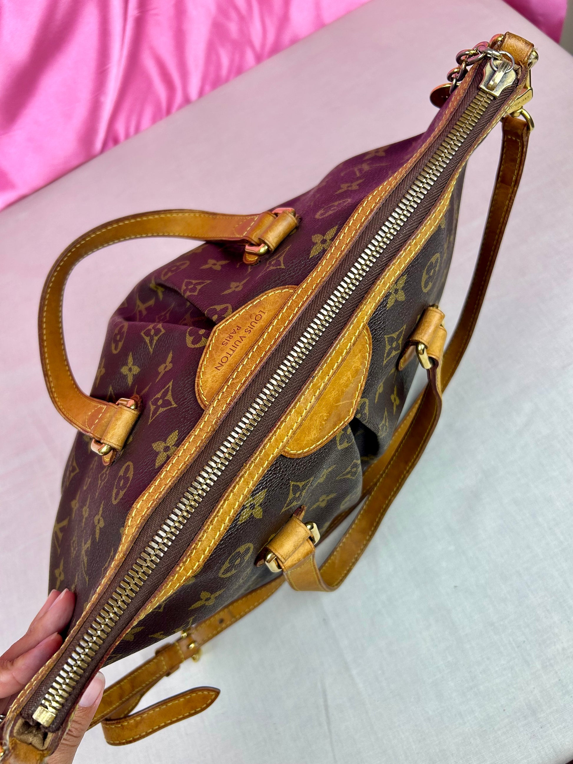 š Description: Canvas is in beautiful condition with no tears or cracks. Piping shows exposures on three of the four bottom corners with discoloration and wearing throughout. Leather trim has some darkening but no cracks or tears. Leather handles are in great condition. Leather strap is also in great condition, with some signs of wear and darkening but no cracks. Interior has staining in the pockets but is otherwise clean. Zipper pulls smoothly. Hardware remains shiny.