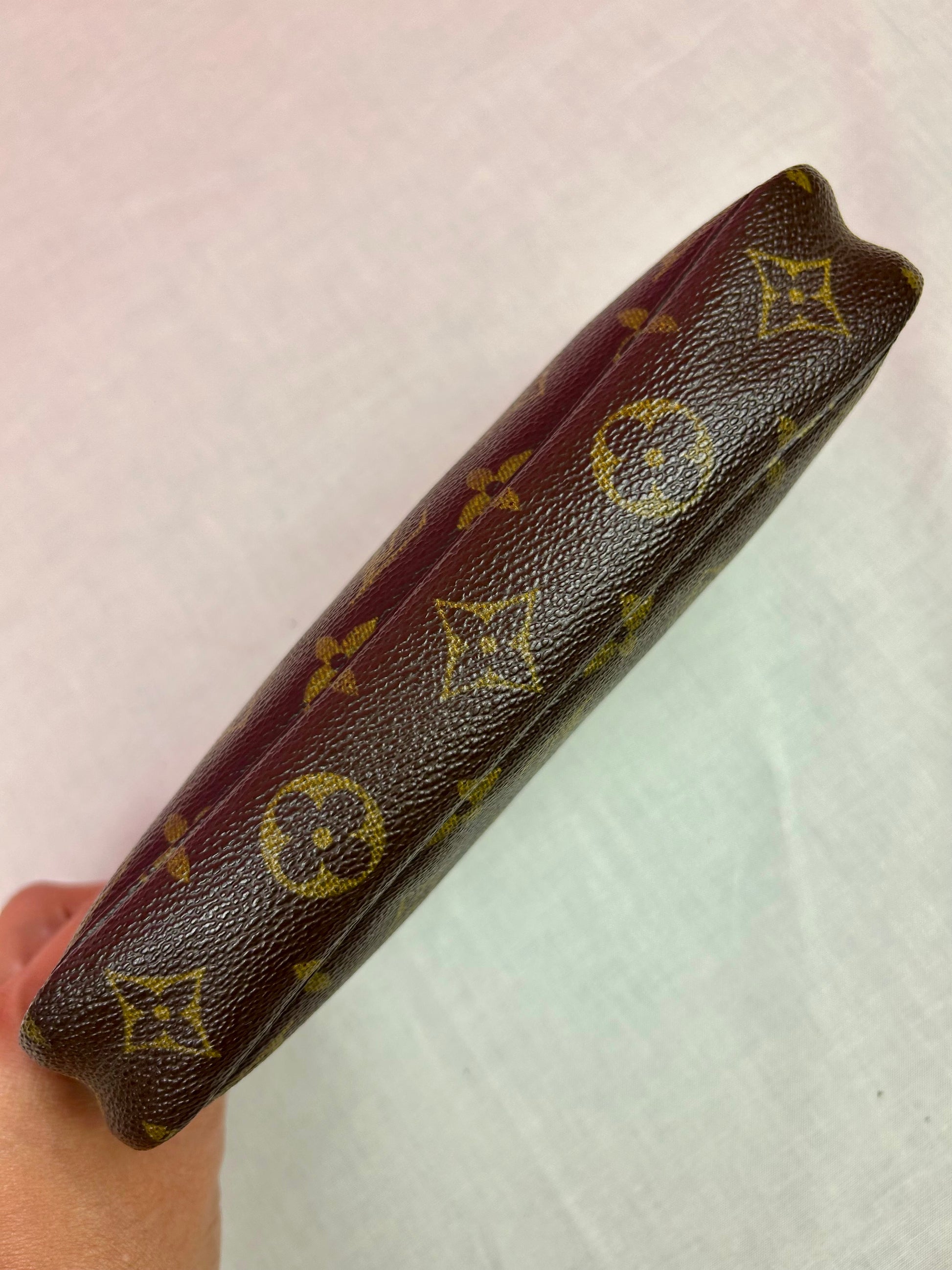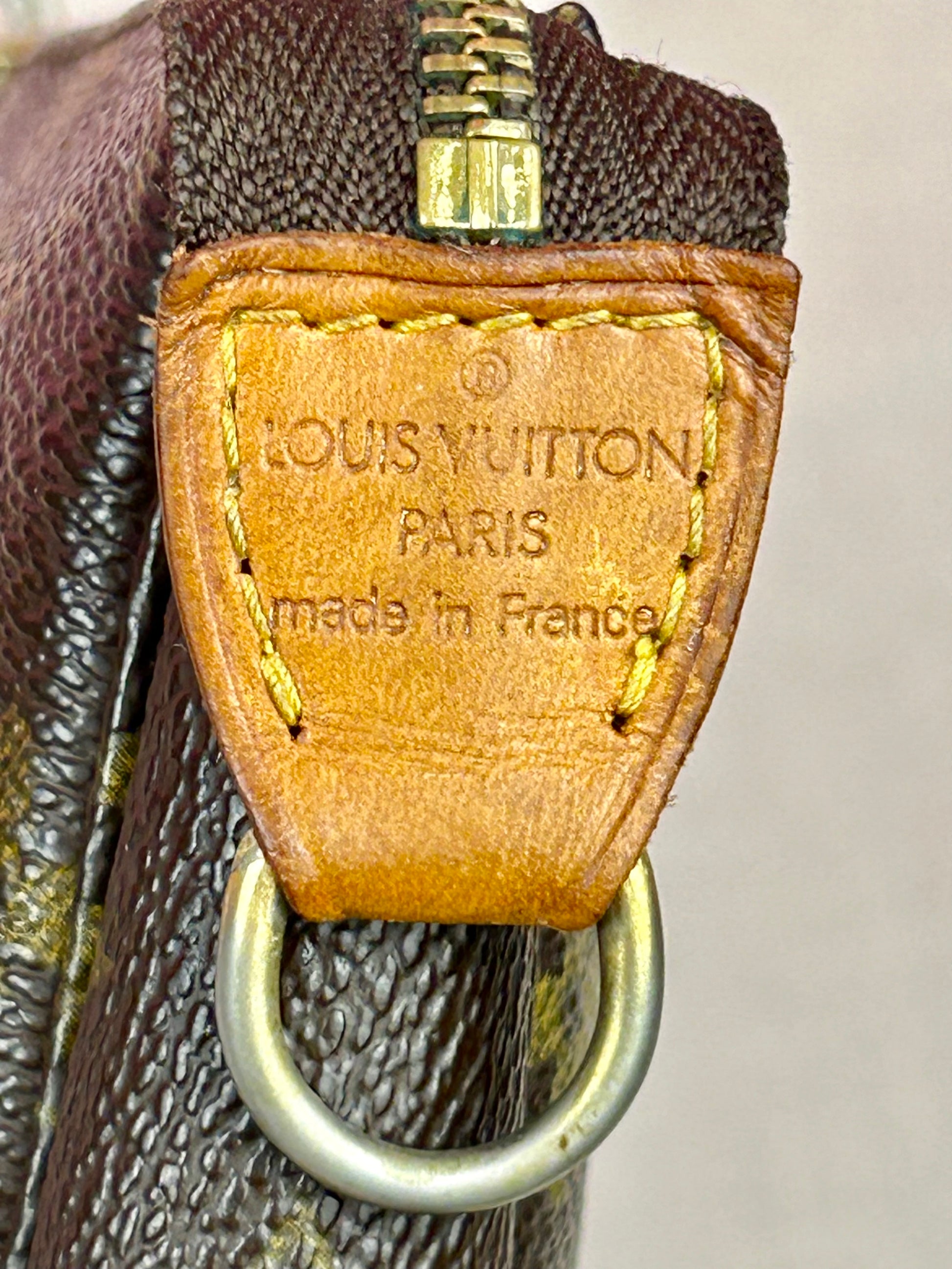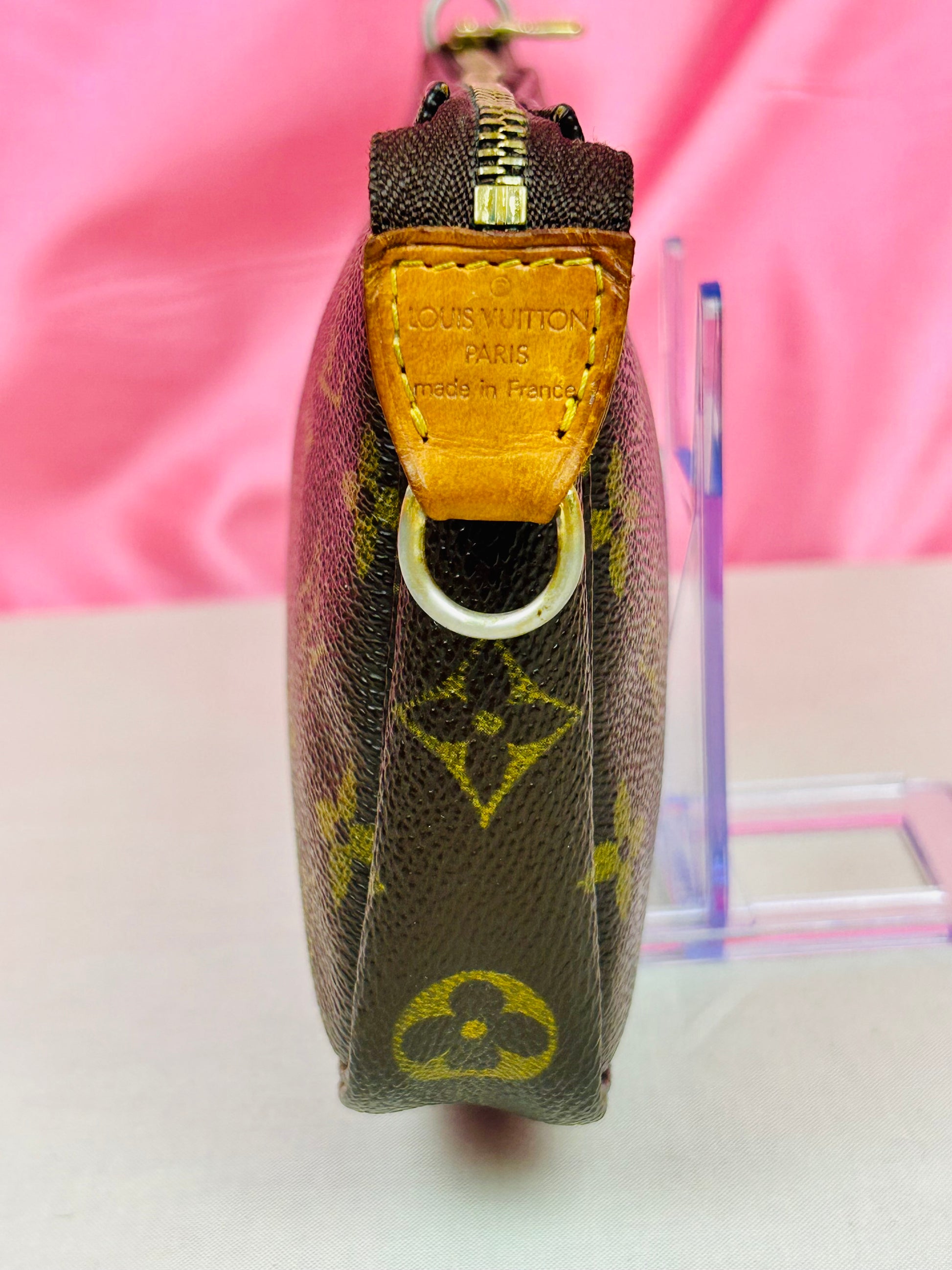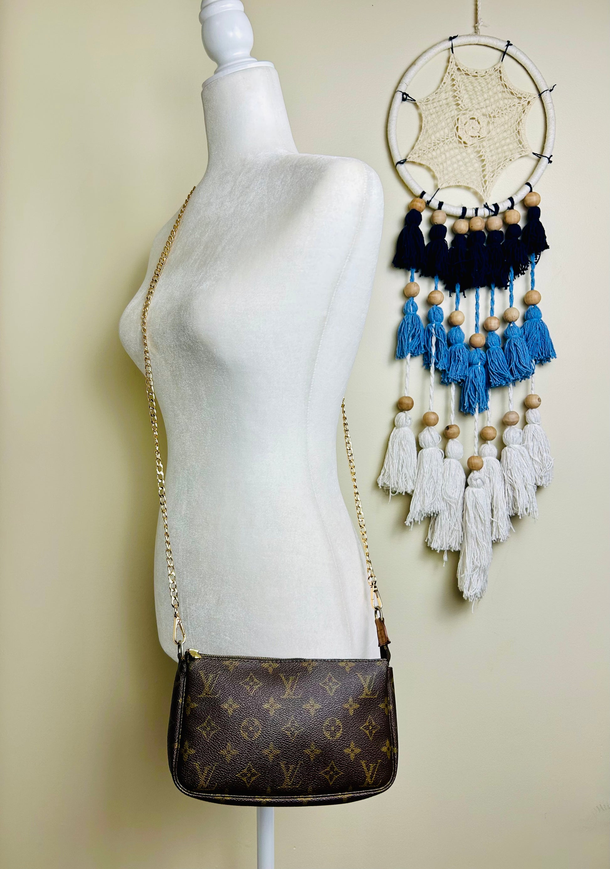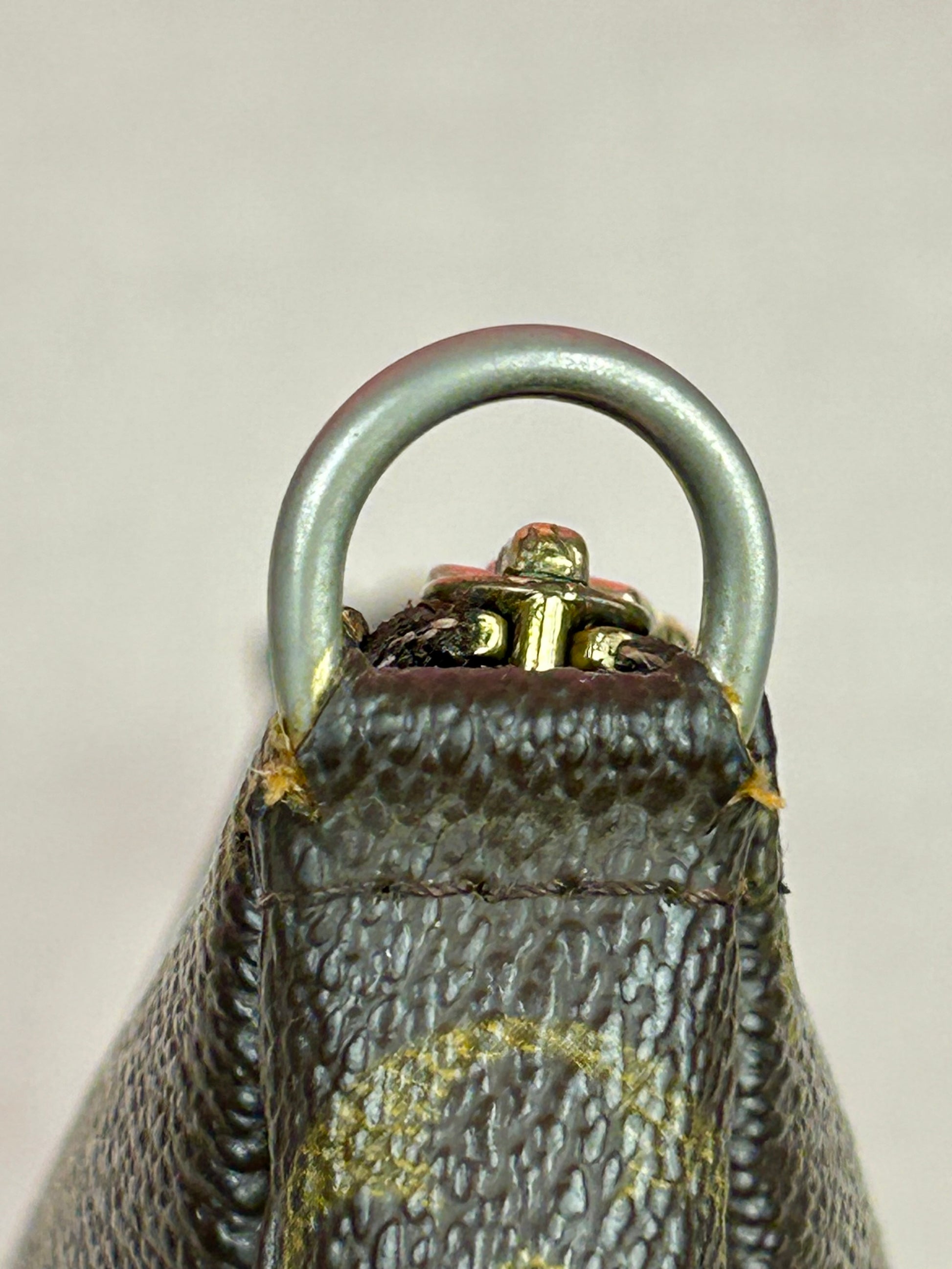 š Description: This classic Pochette Accessoires is the perfect everyday grab-and-go piece! The canvas is in bright and vibrant. There are minor cracks in the canvas by the one of the D-Rings, common for this model. D-rings have silvered, but the zipper is gold and the pull glides smoothly. The interior is very clean. Comes with a generic gold chain for crossbody wear. A timeless staple that pairs perfectly with any outfit!
