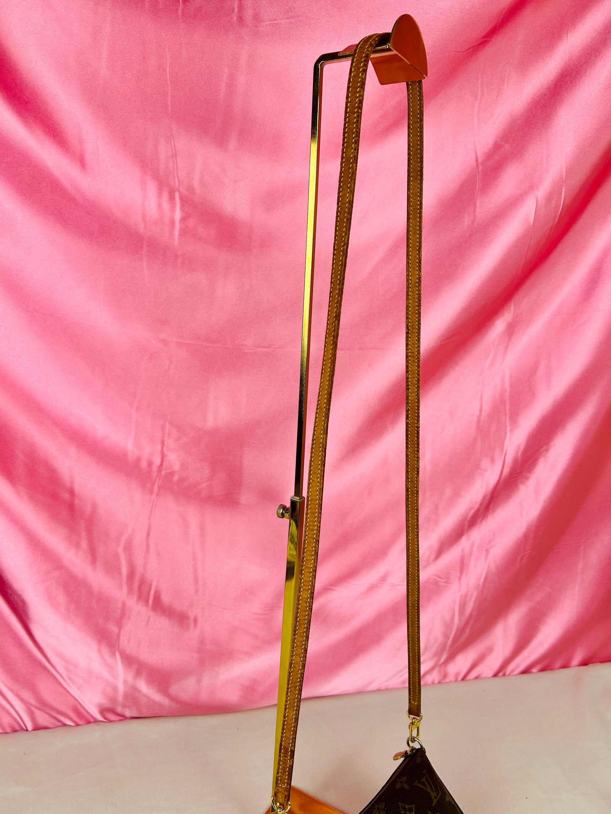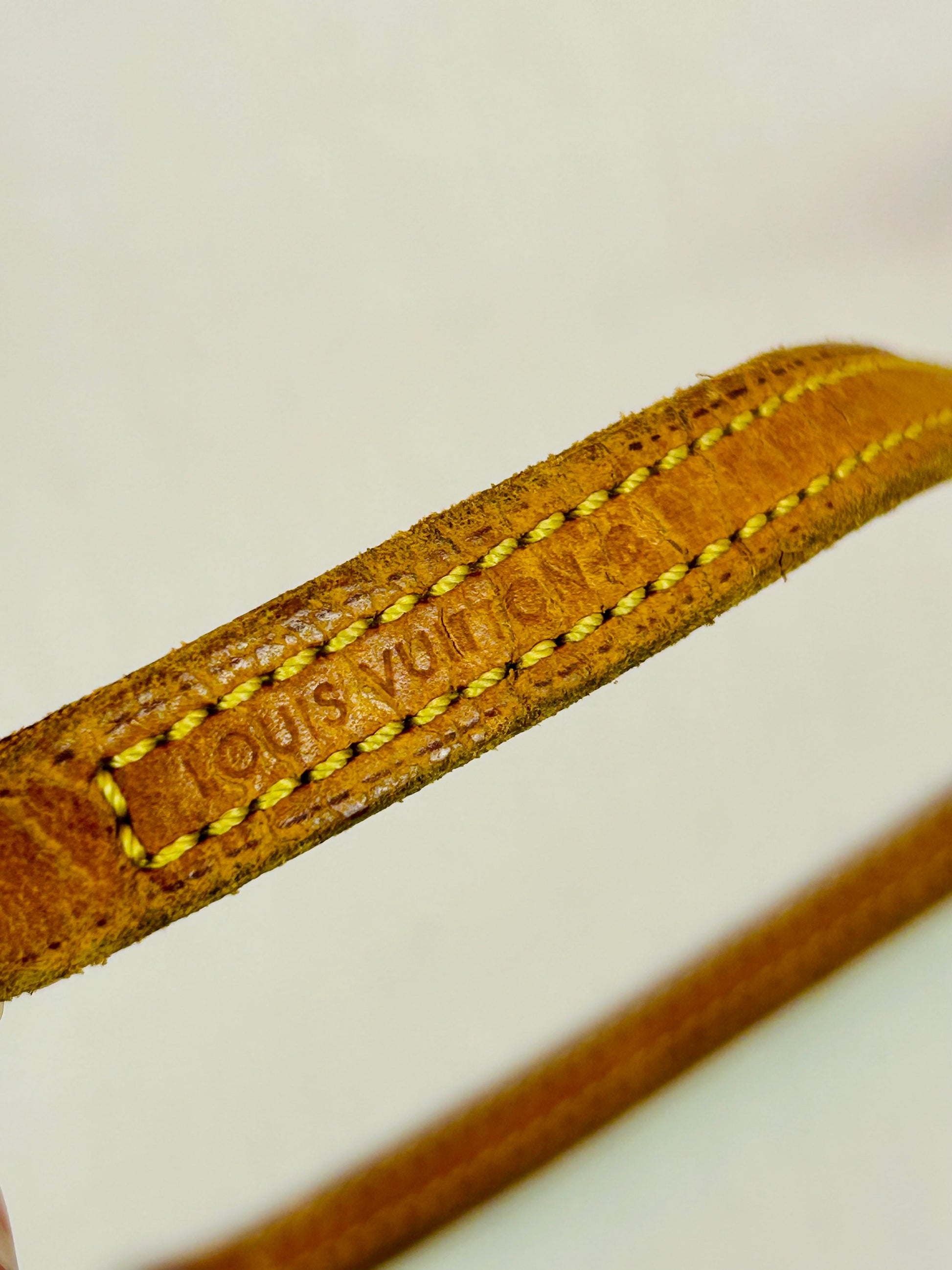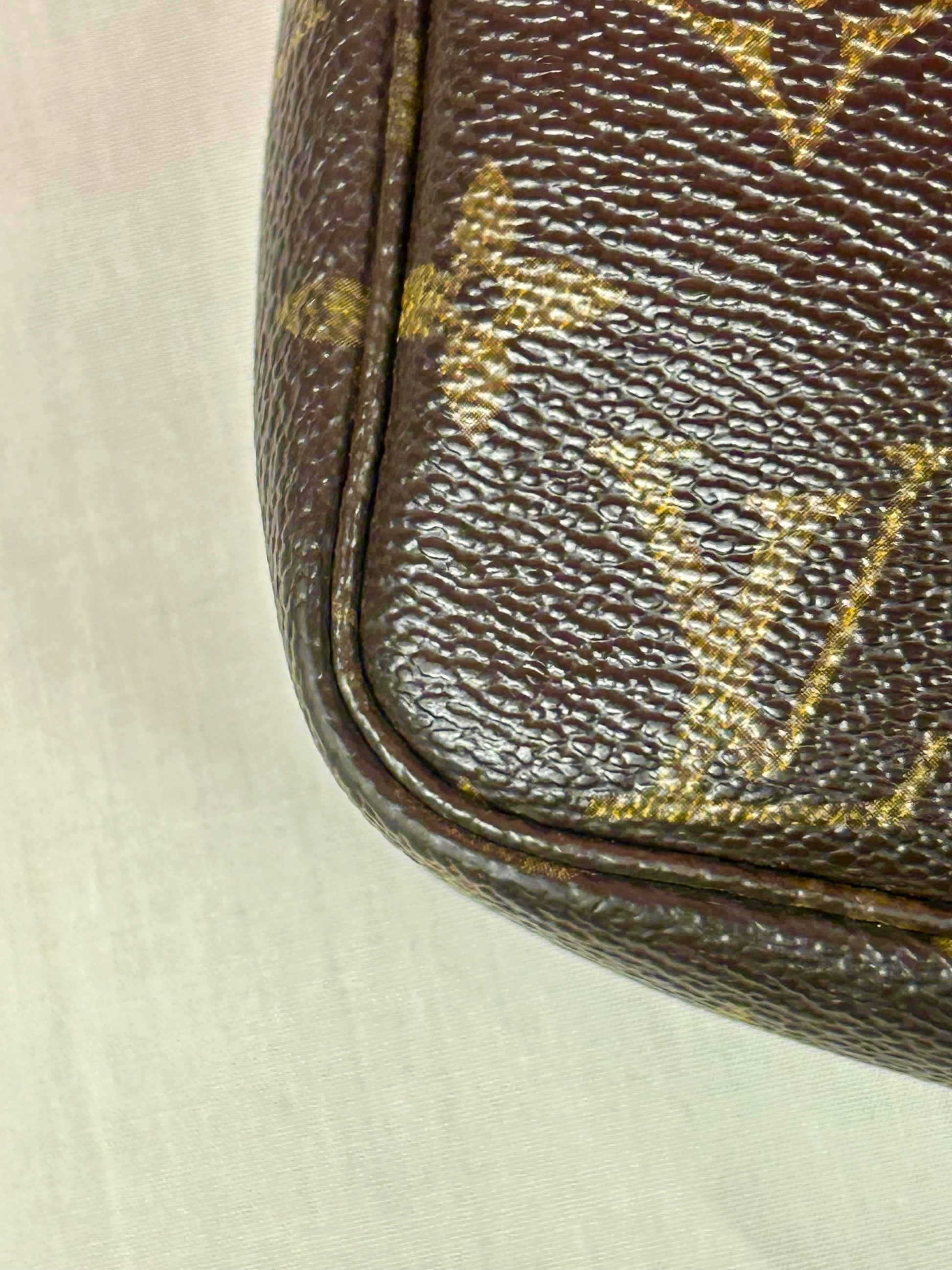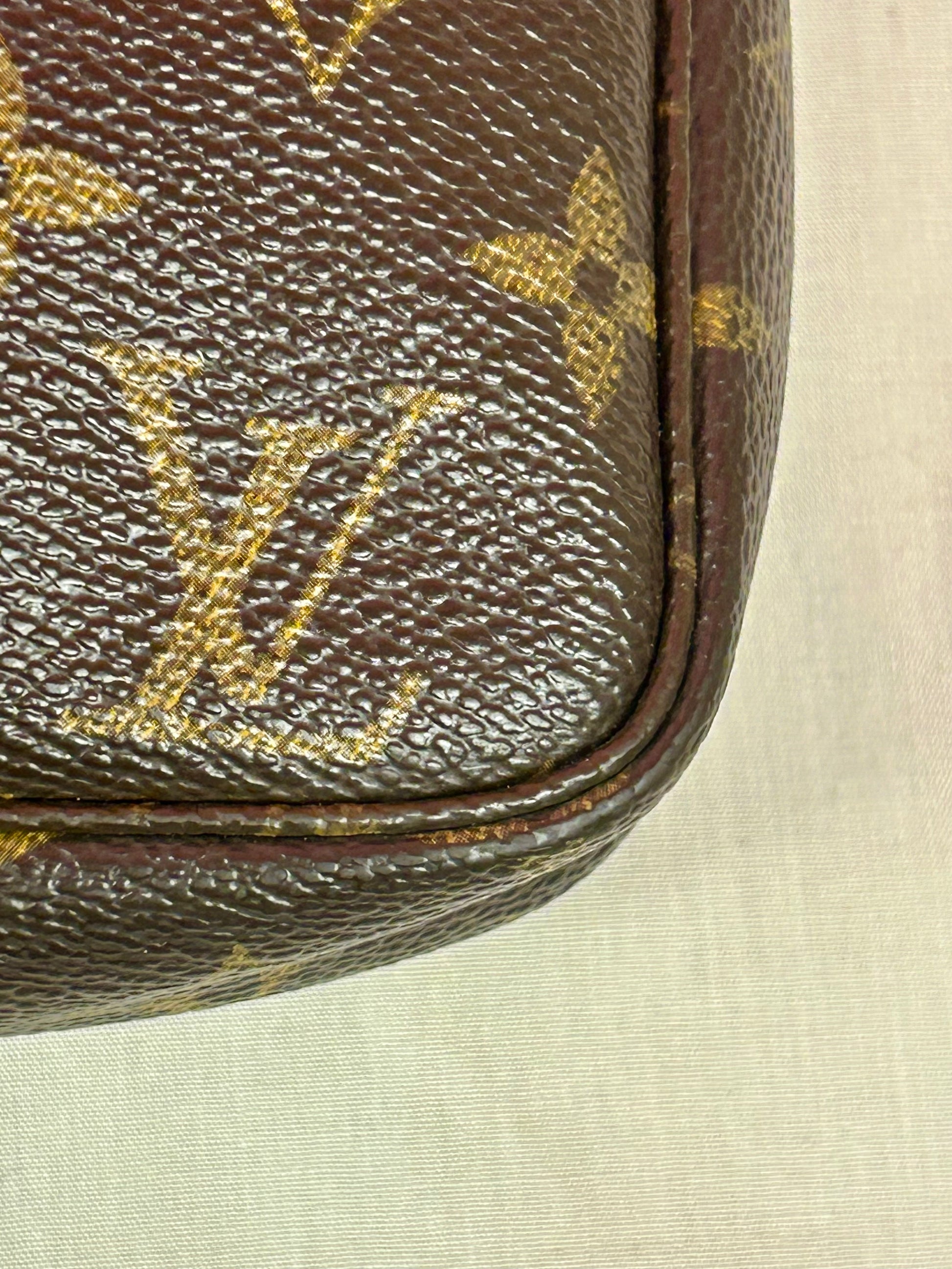 š Description: This classic Pochette Accessories is the perfect everyday grab-and-go piece! The canvas is in beautiful condition. Some micro cracks near the D rings, very common for this model. D-rings and zipper are gold with some wearing, and the pull glides smoothly. The interior is clean, several small pen markings. The removable LV leather strap has cracking and wear throughout, but remains strong and plenty of usage left. Comes with a generic gold chain for crossbody wear. A timeless staple that pairs perfectly with any outfit!