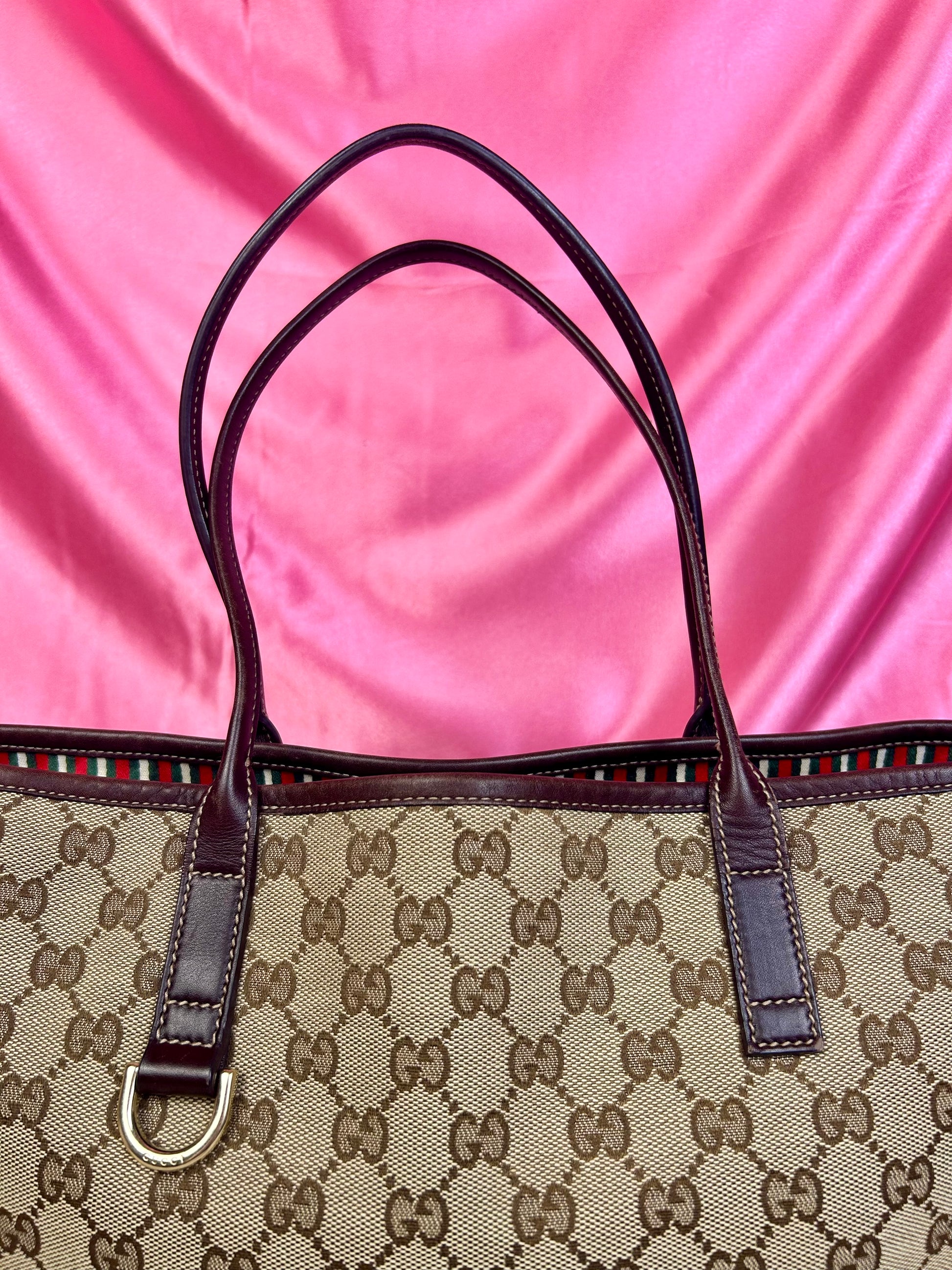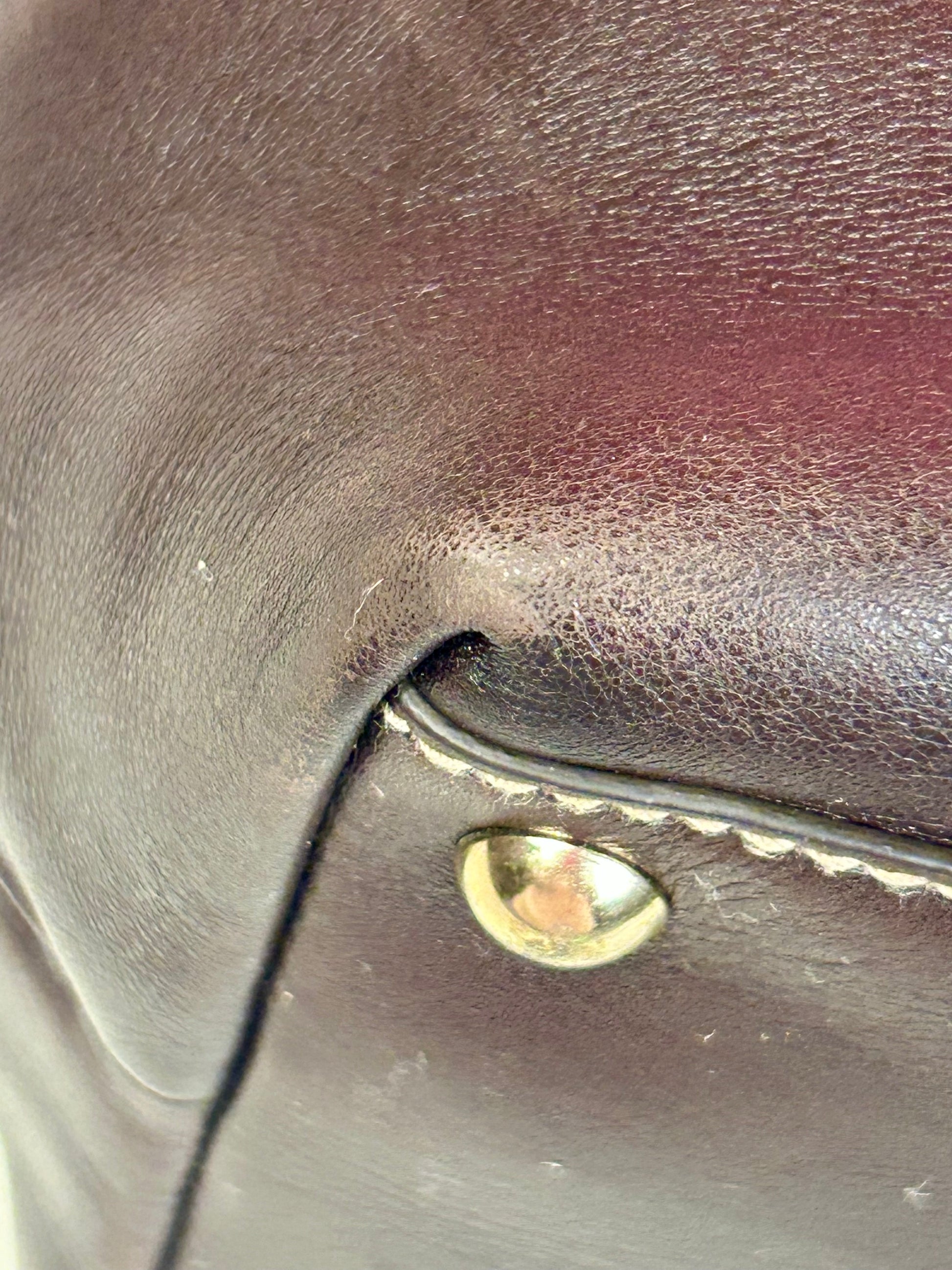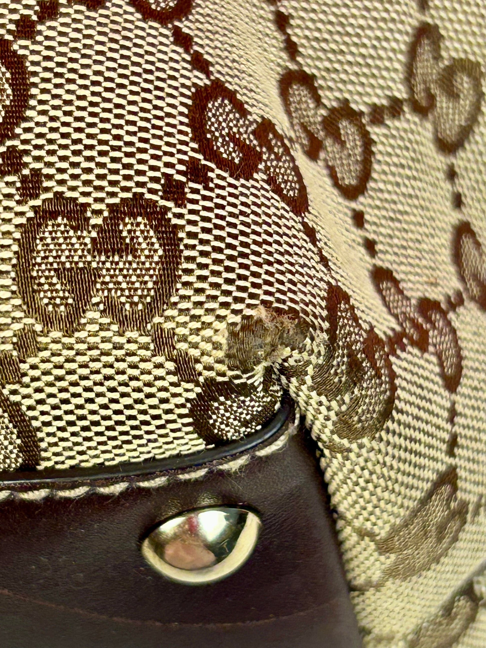 💜 Description: Canvas is in great condition with two small frays on the front left and one on the right side. Bottom leather shows some rubbing and mild wear on the corners consistent with normal usage. Top leather trim has some rubs but no cracks or tears. Handles are in excellent condition with minimal wear. Interior has some staining on the bottom lining, while the interior pocket is clean and the zipper pulls smoothly.