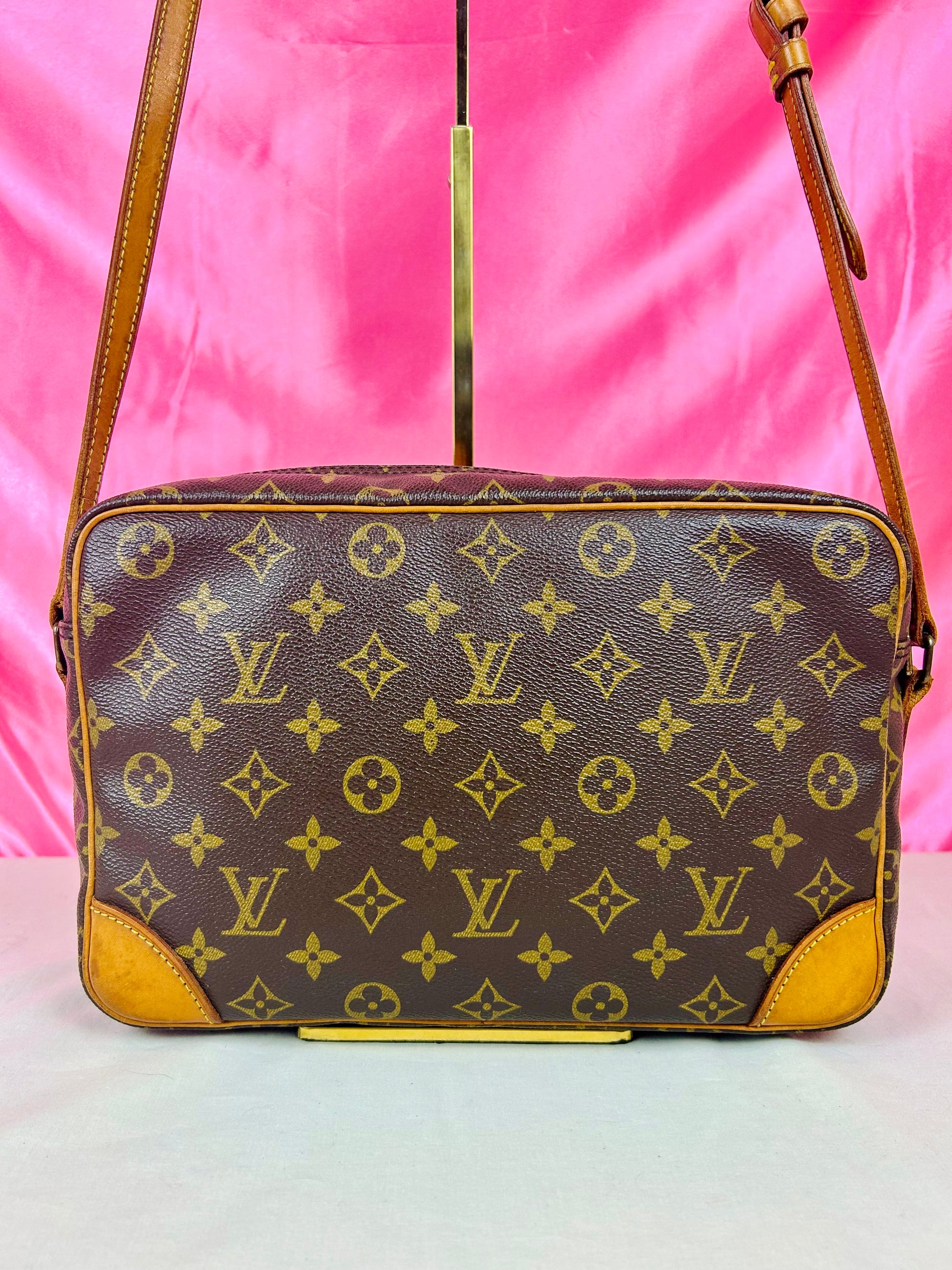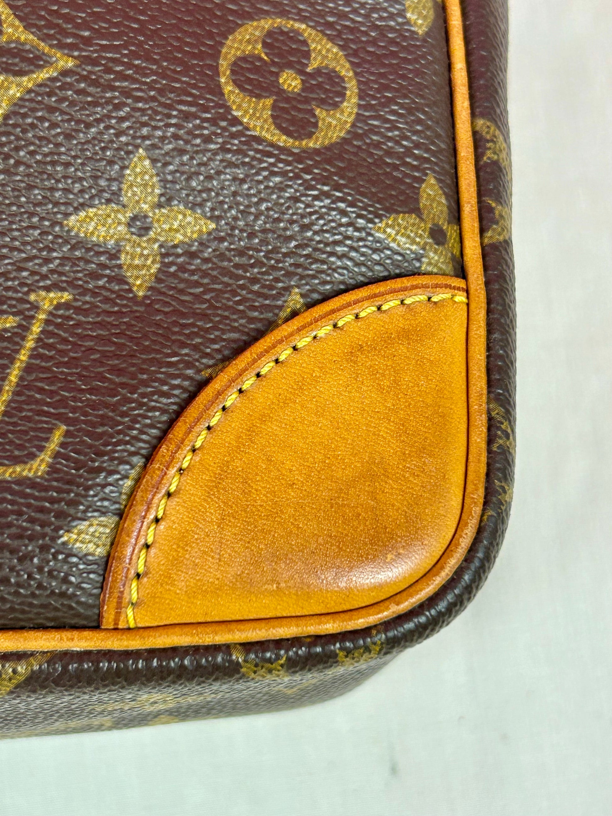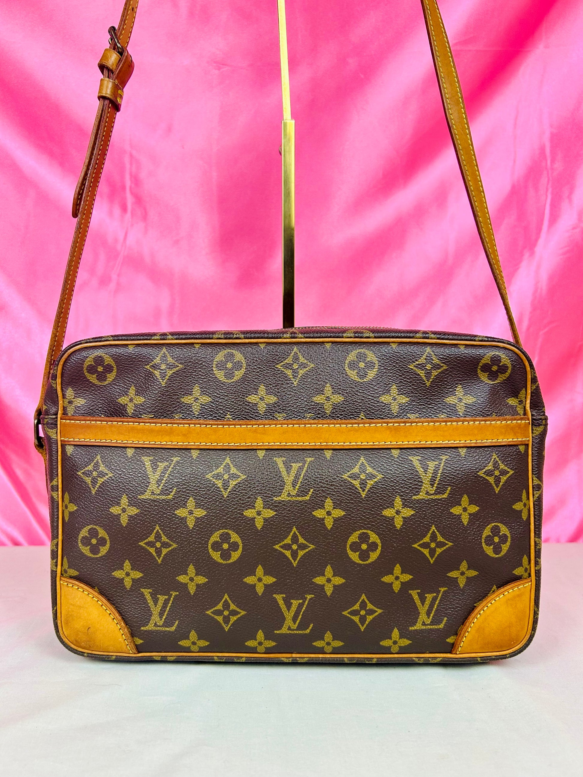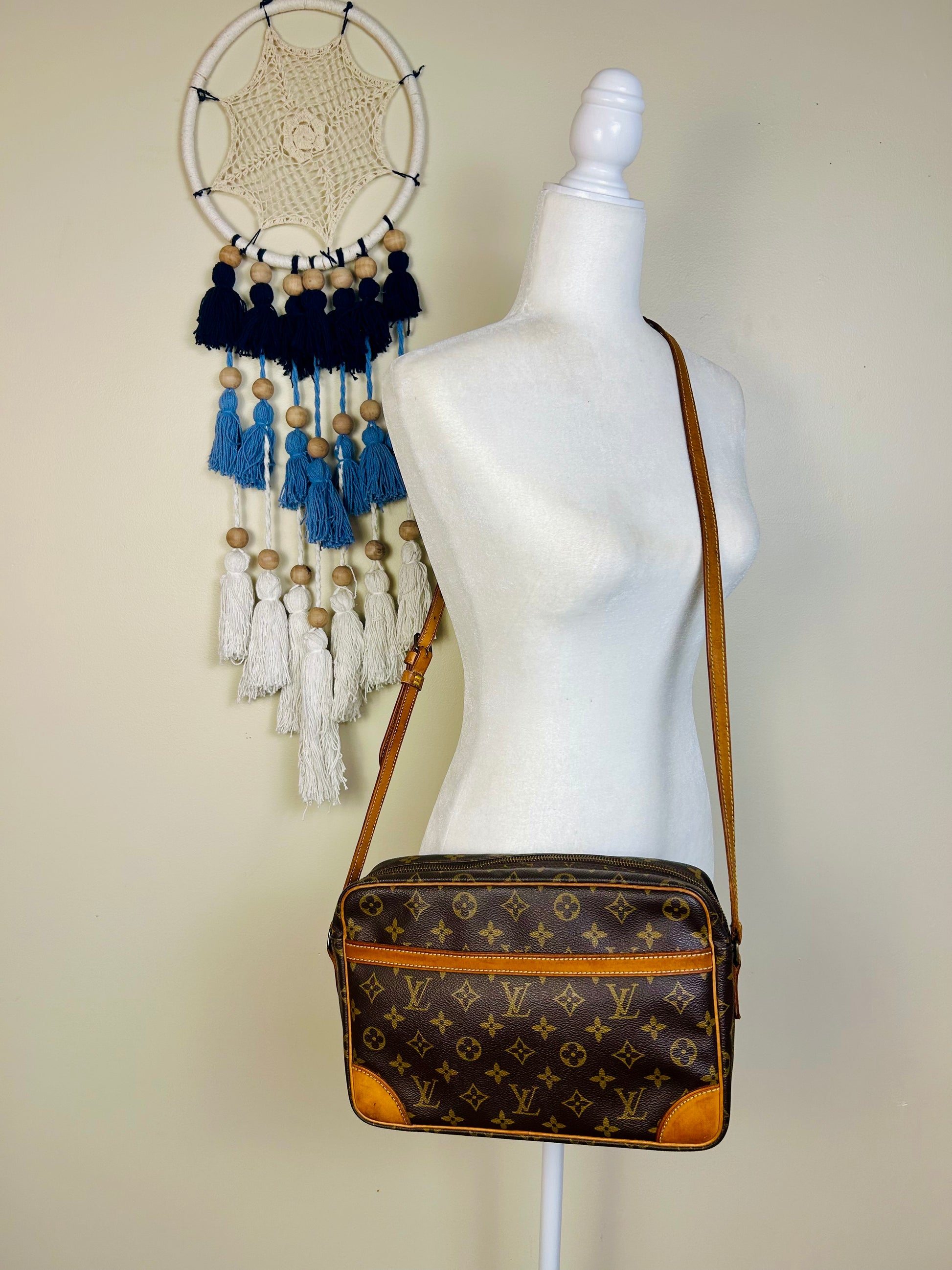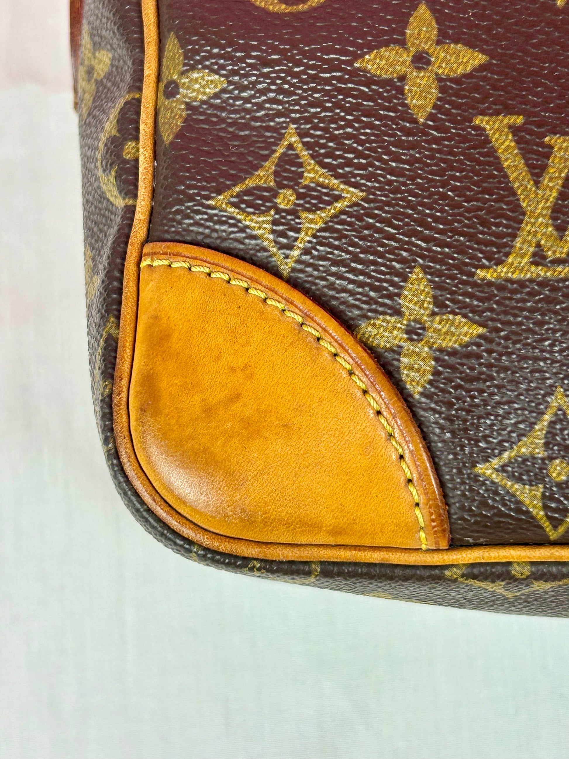 š Description: The Trocadero 30 is the largest of this model. Canvas is in beautiful condition with no cracks or tears. Leather piping is in great condition. Normal wear on the leather trim on the front and some marking on the corner leather tabs. Interior is clean with some wear and markings. Previous owner replaced the lining of interor and exterior pockets, they are clean and not sticky. Zipper pulls smoothly. Leather strap is in good condition with no cracks or tears. Chapes are strong. Hardware is shiny. No foul odors noted.
