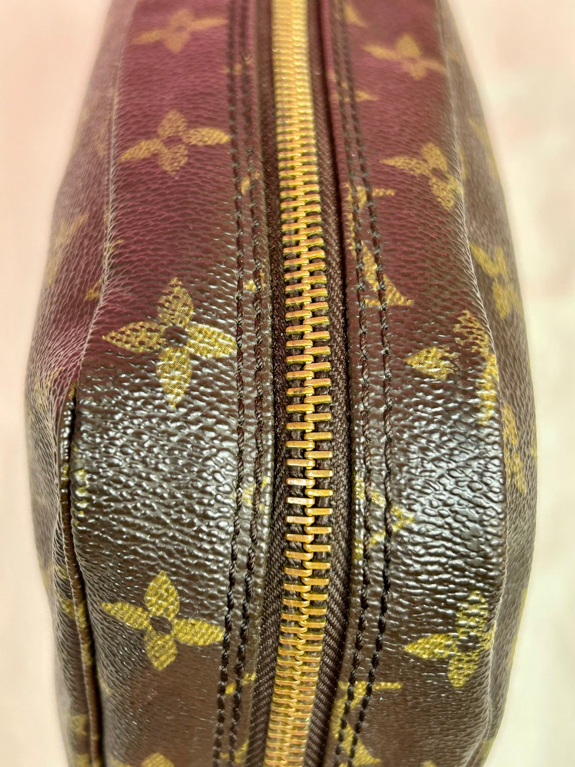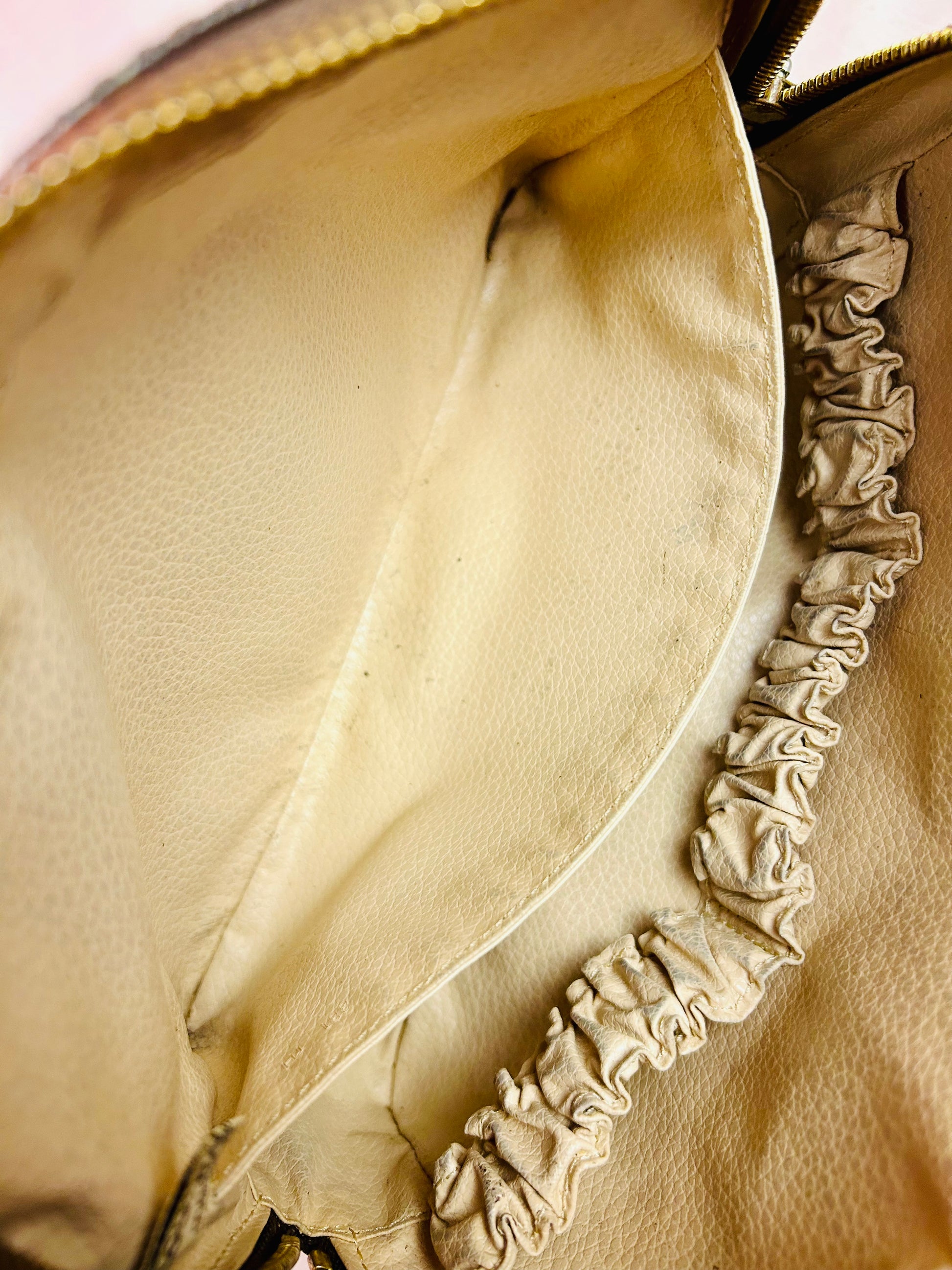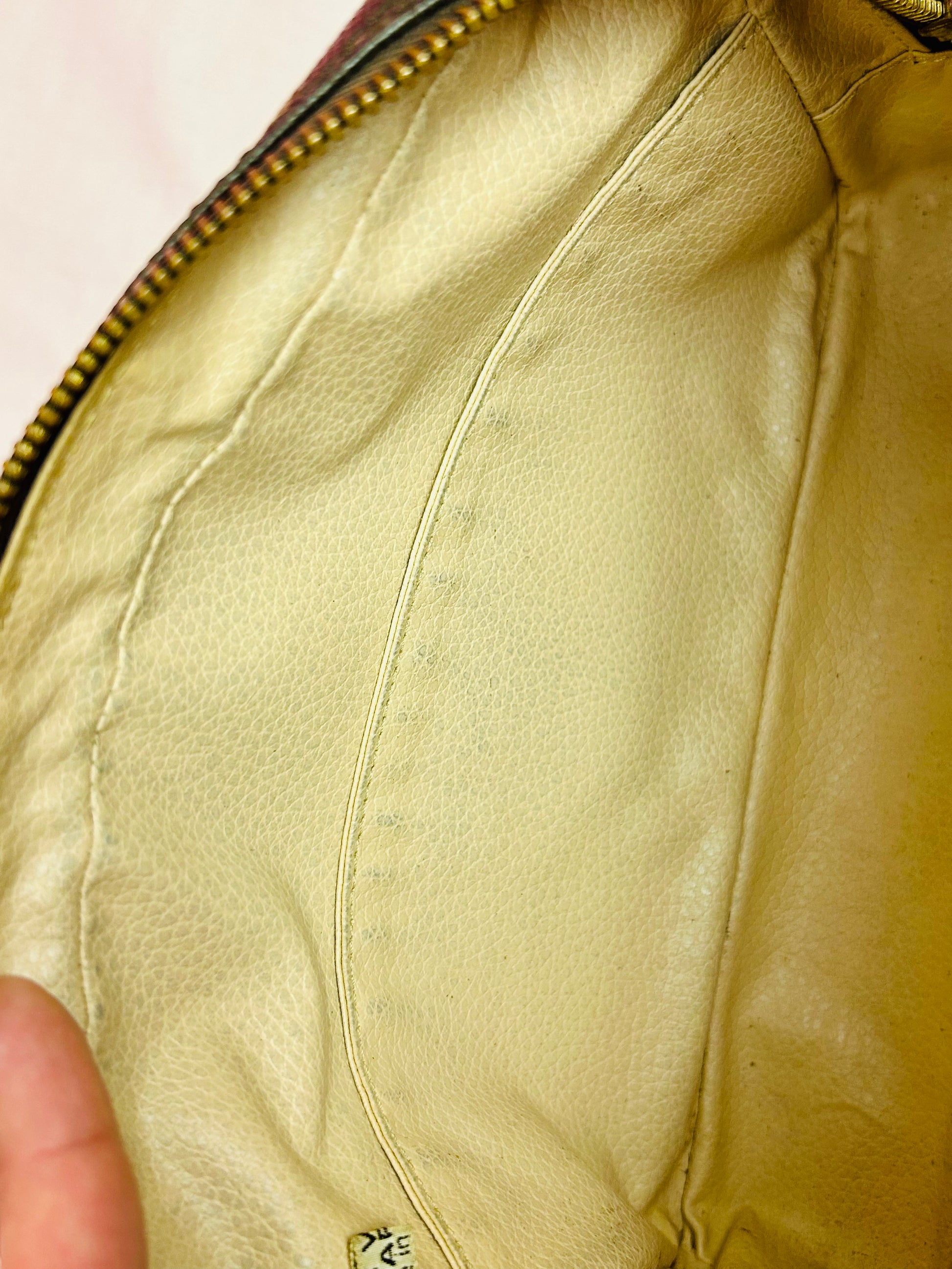 š Description: Canvas is in beautiful condition with no tears or cracks. Interior is clean with some light color transfer. Zipper functions smoothly. Hardware shows some tarnishing consistent with age and use.