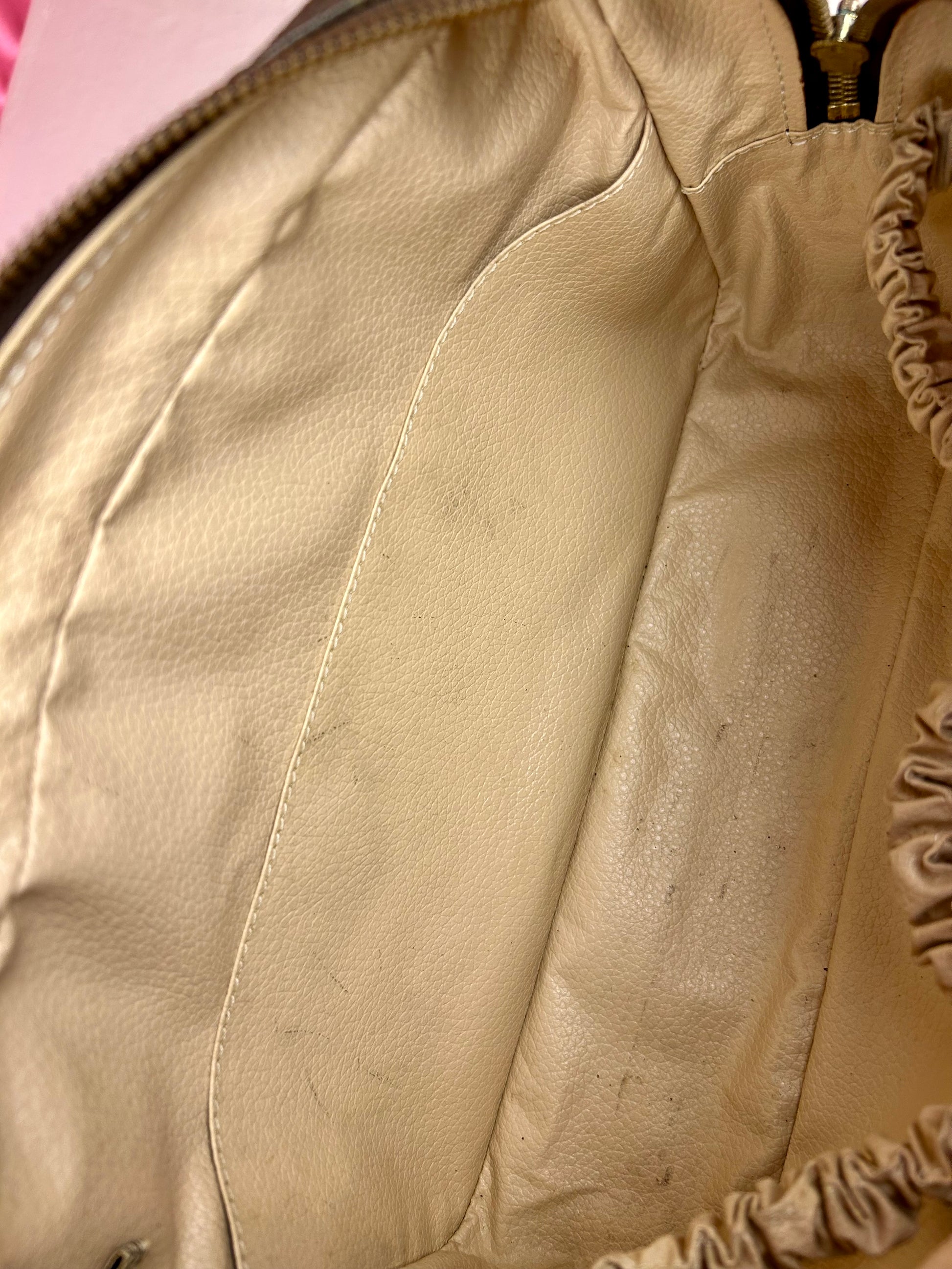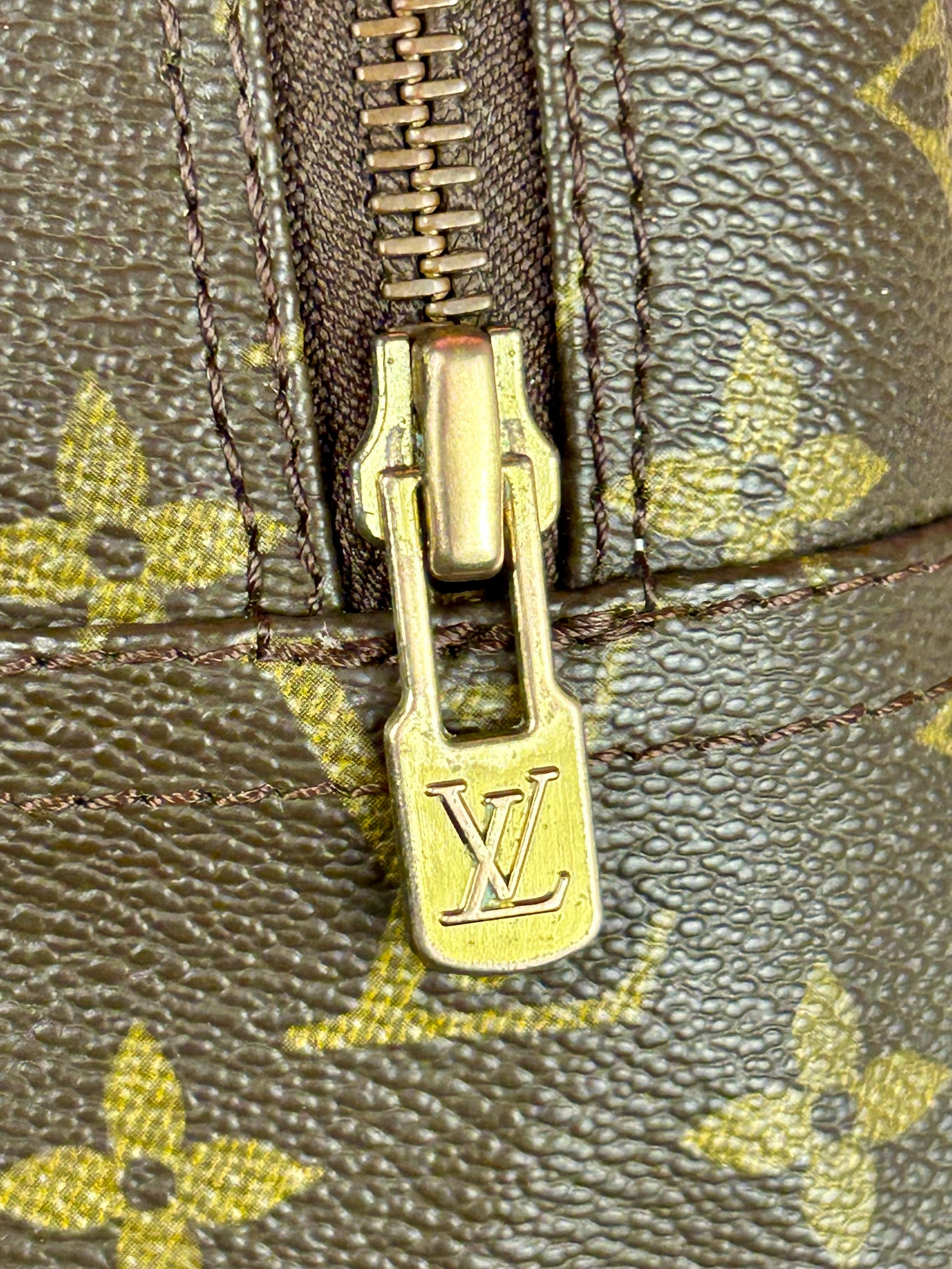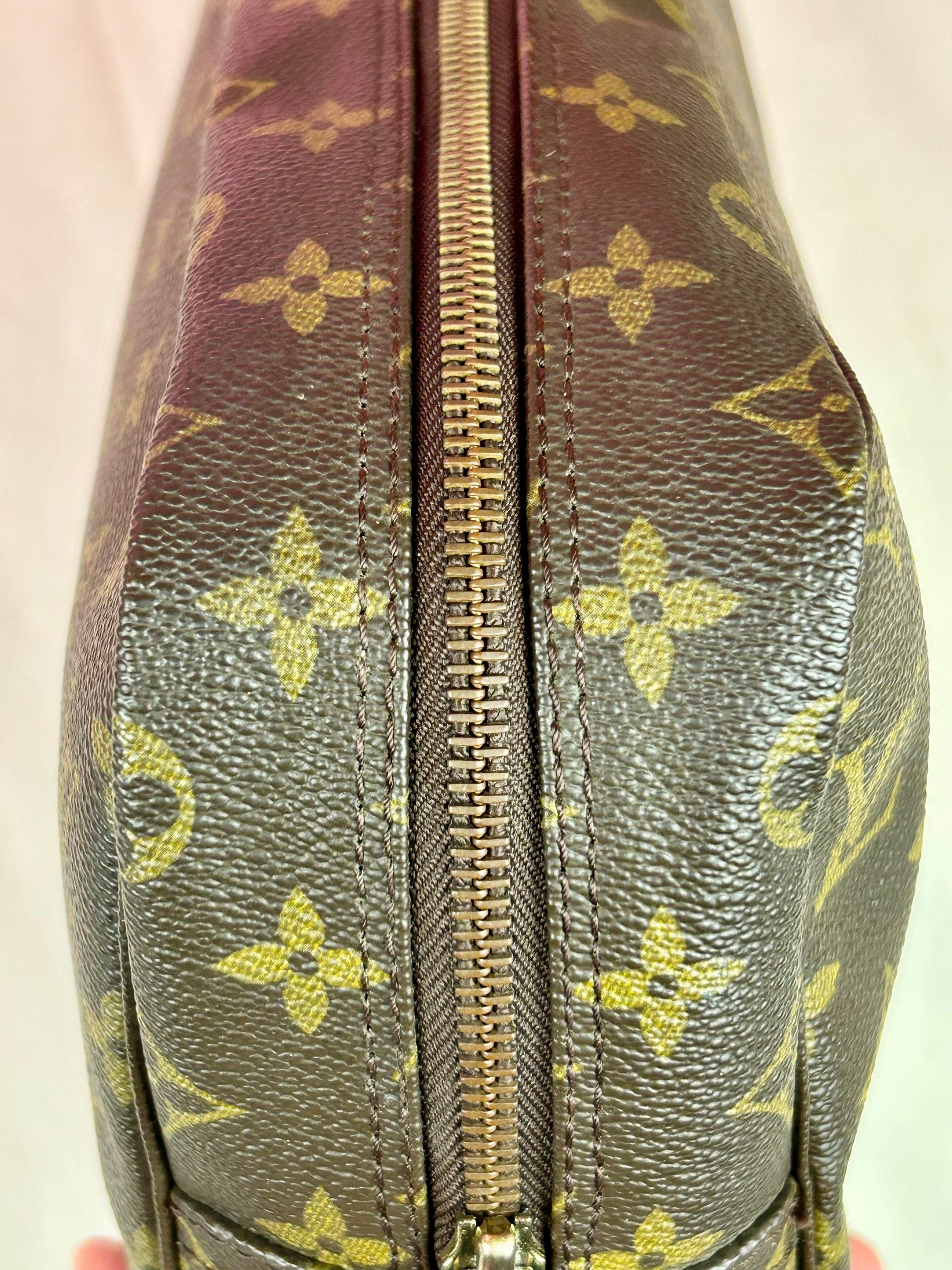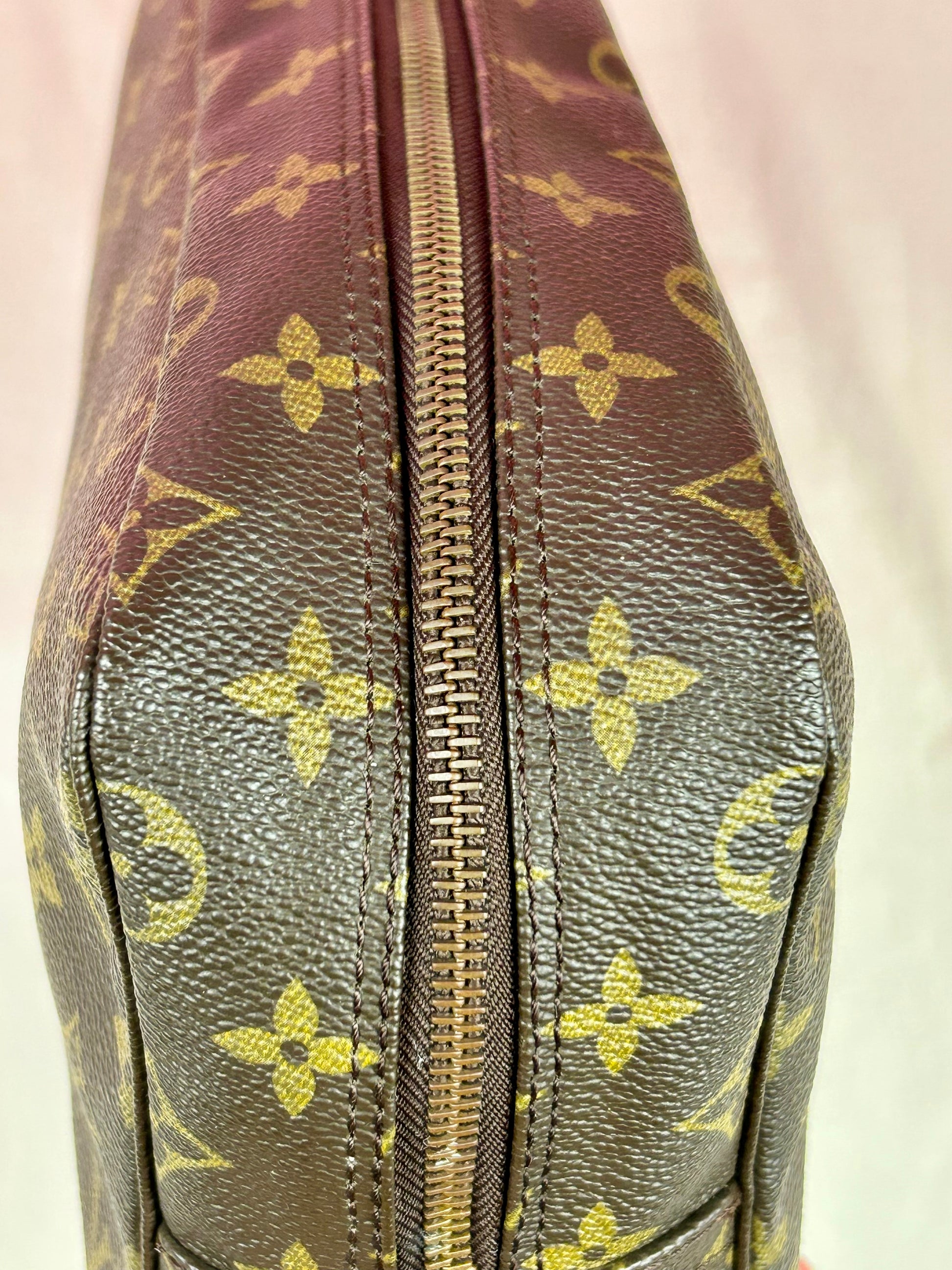 💜 Description: This toiletry pouch is the largest of this model. Canvas is in beautiful condition with no tears or cracks. There are a few micro markings on the left side of the canvas. Interior is clean with some light markings near the inside of the zipper pull. Zipper functions smoothly. Hardware is shiny.