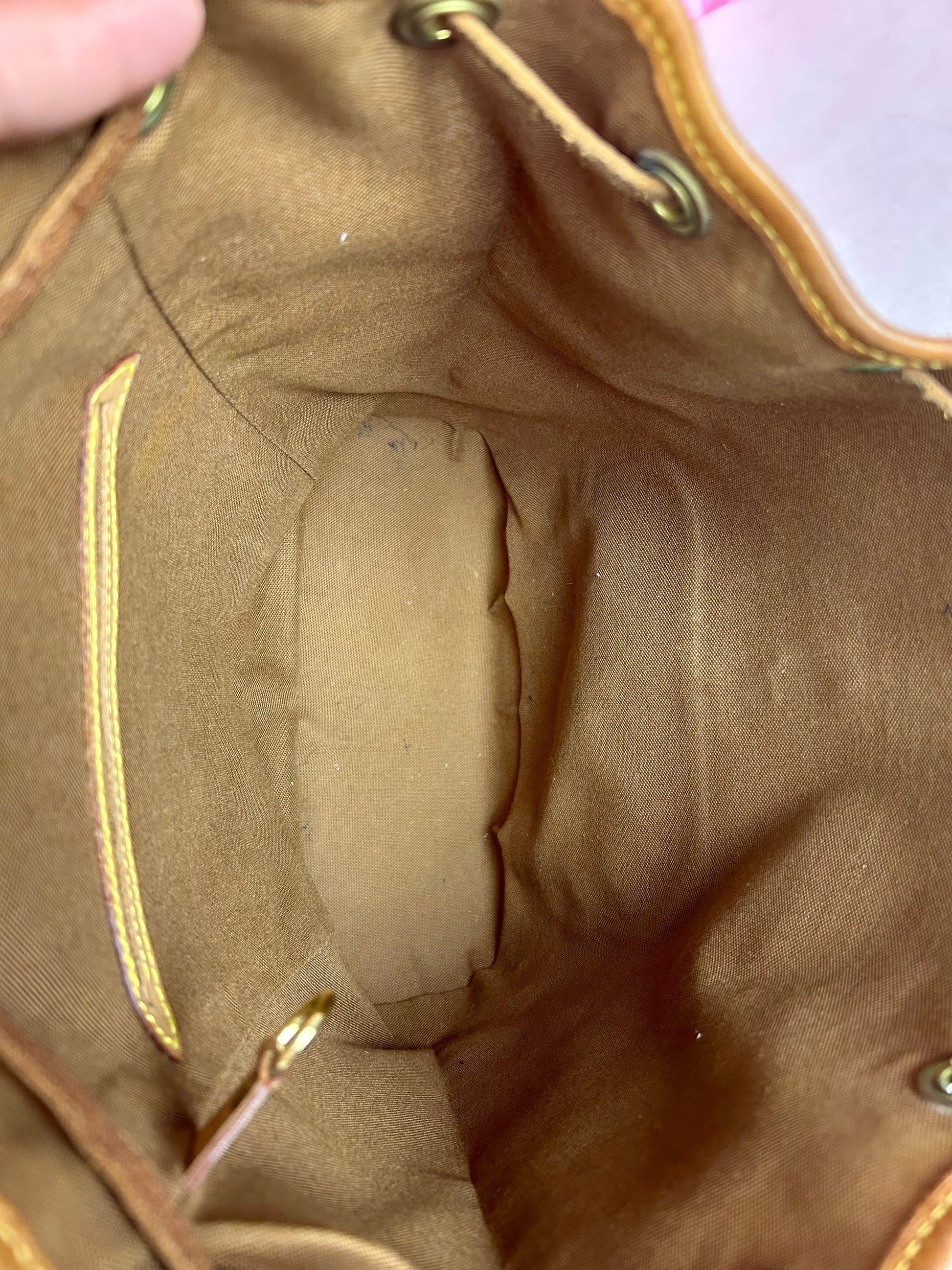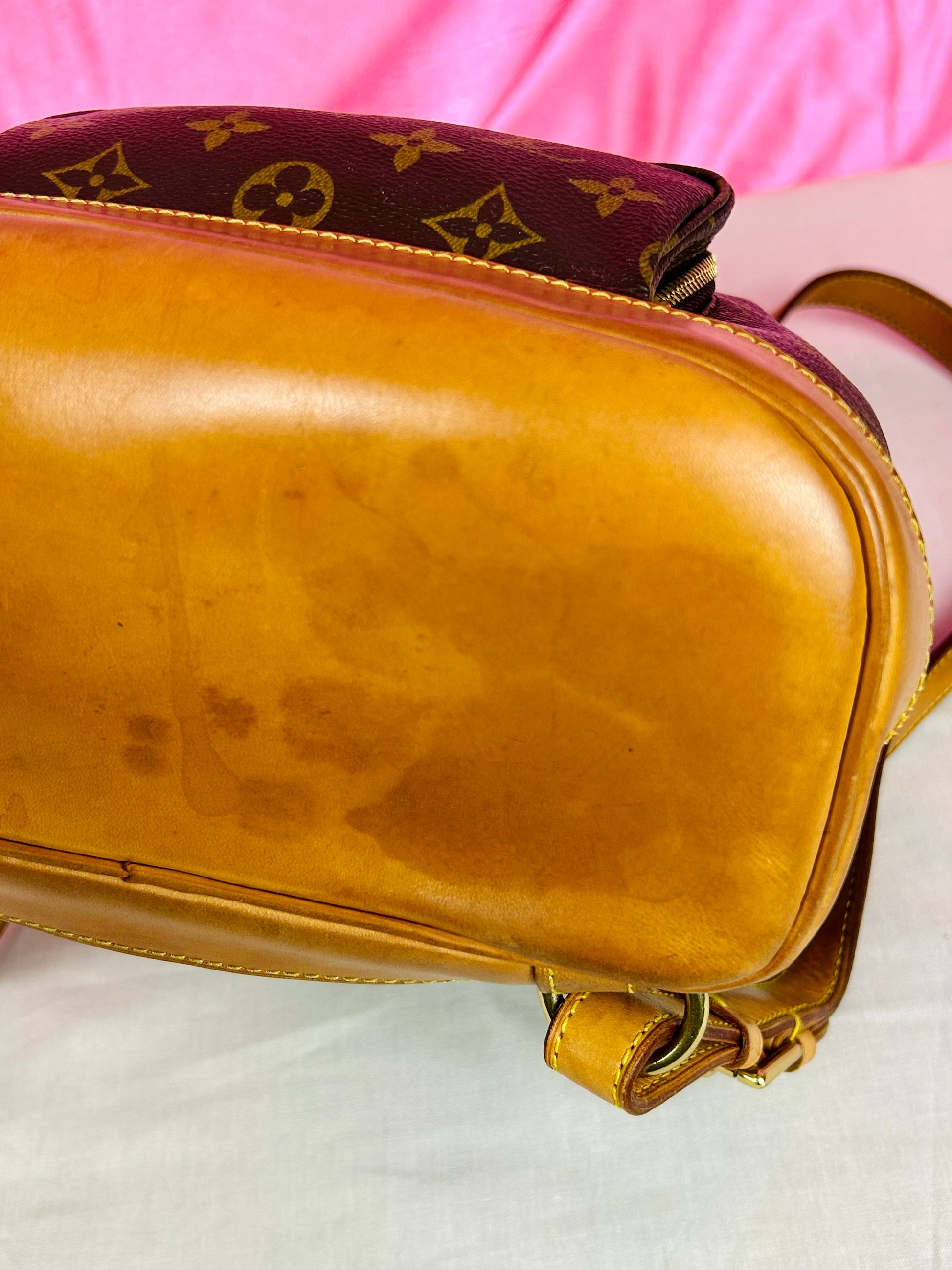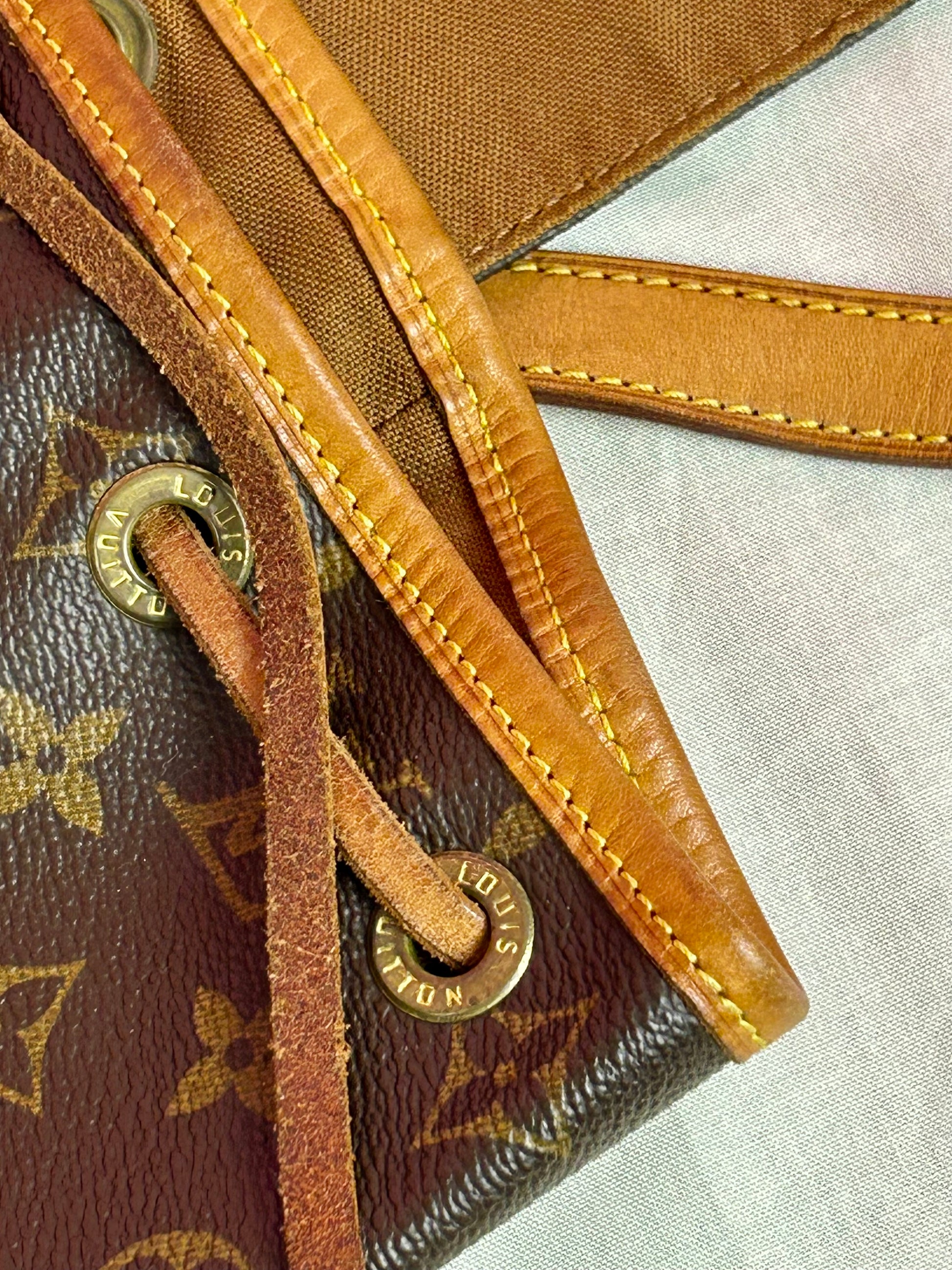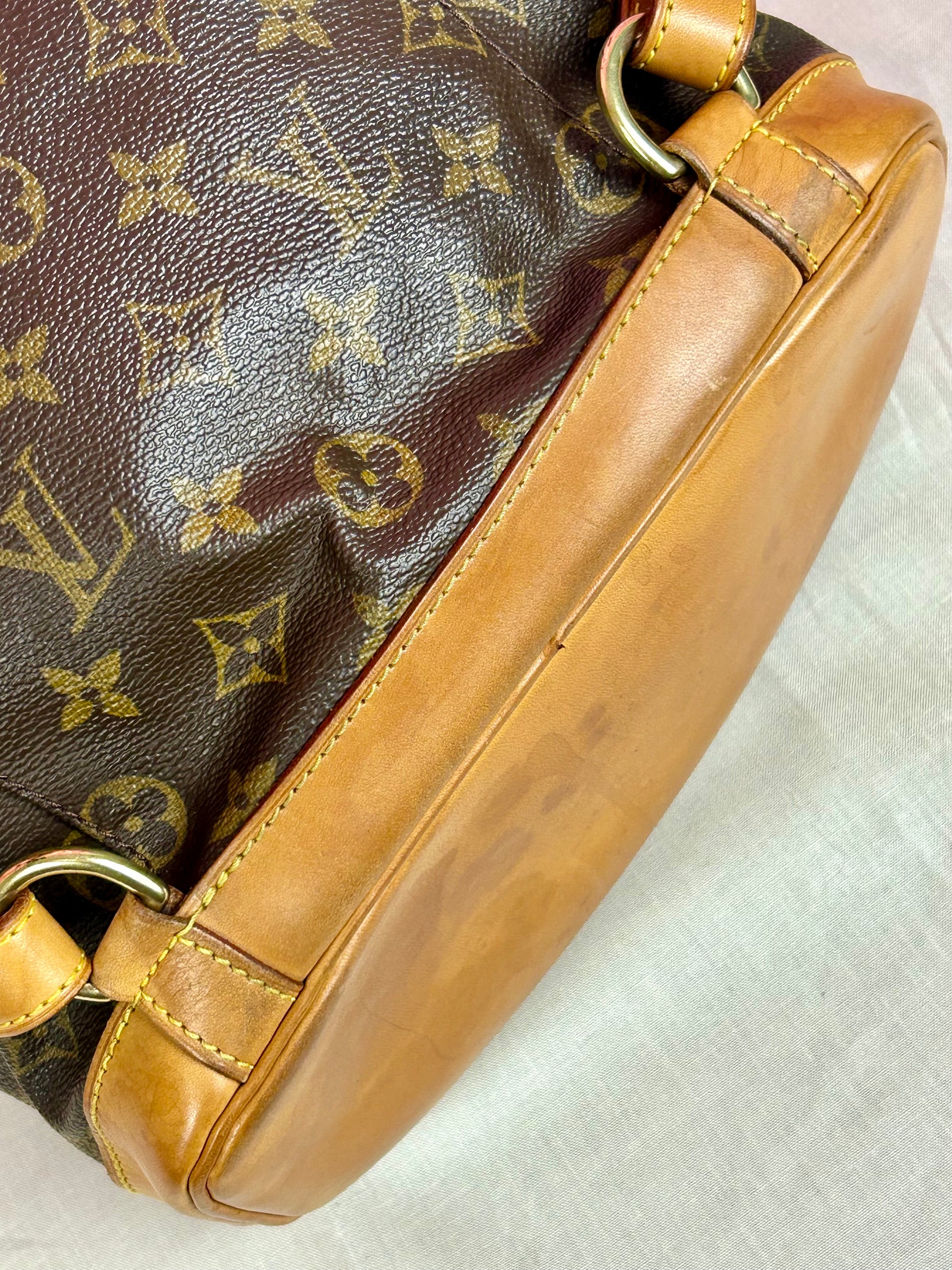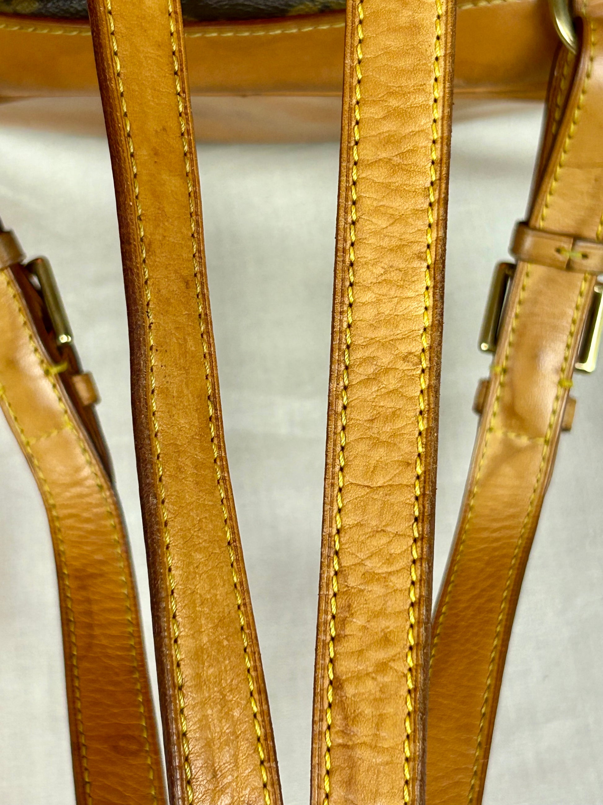 π Description: A perfect hands-free bag! Canvas is in great condition, no cracks or tears. Leather has watermarks throughout, but mostly an even patina. Straps and chapes are strong, no cracks, but do have wearing and marking consistent with normal usage. Buckle works properly and has no cracks. Trim is in excellent condition, it has no holes or cracks. Hardware is gold and works properly. Front pocket has some light markings. Interior has some mild pen marking but is otherwise clean. A classic and versatile piece!
