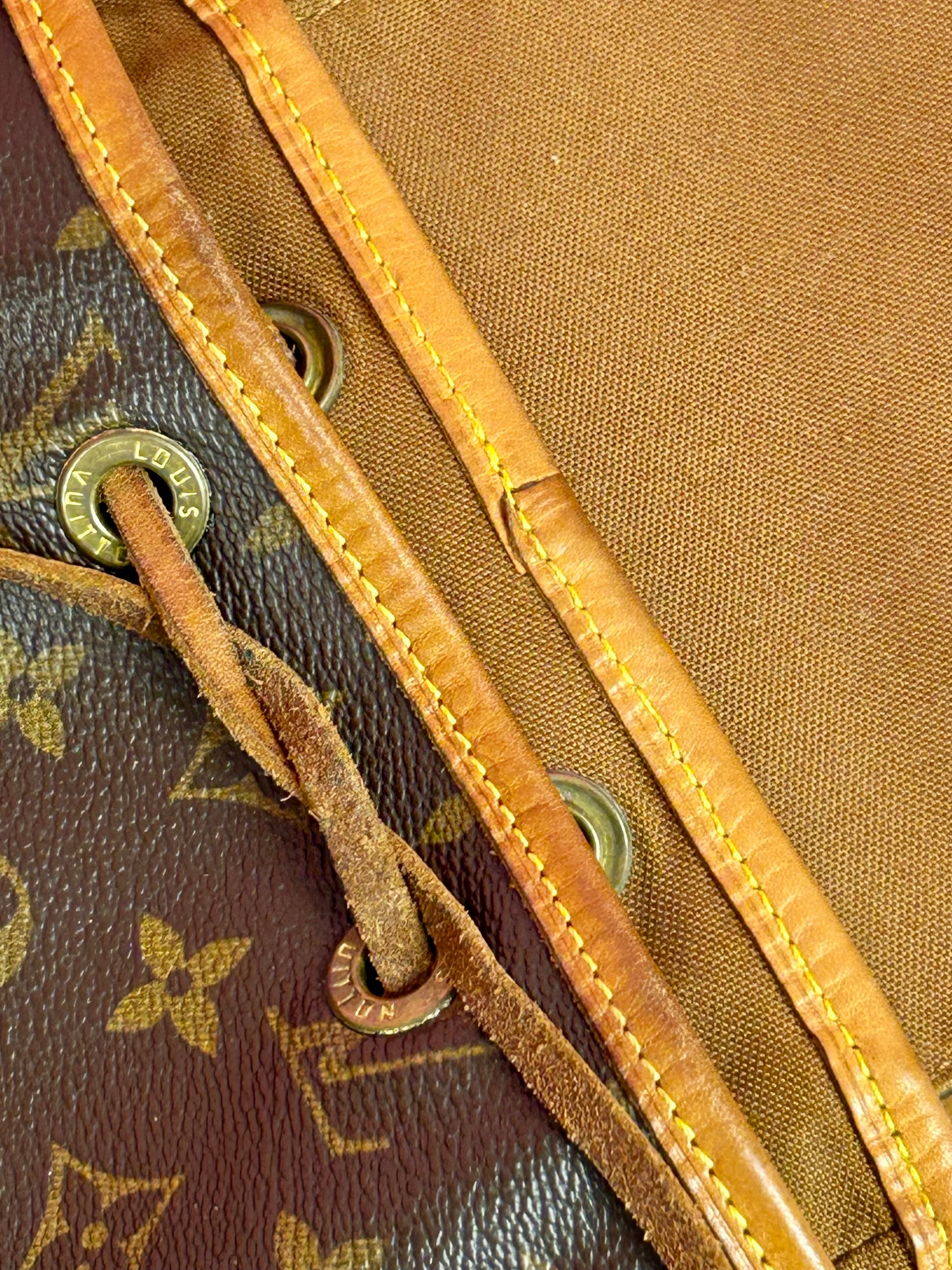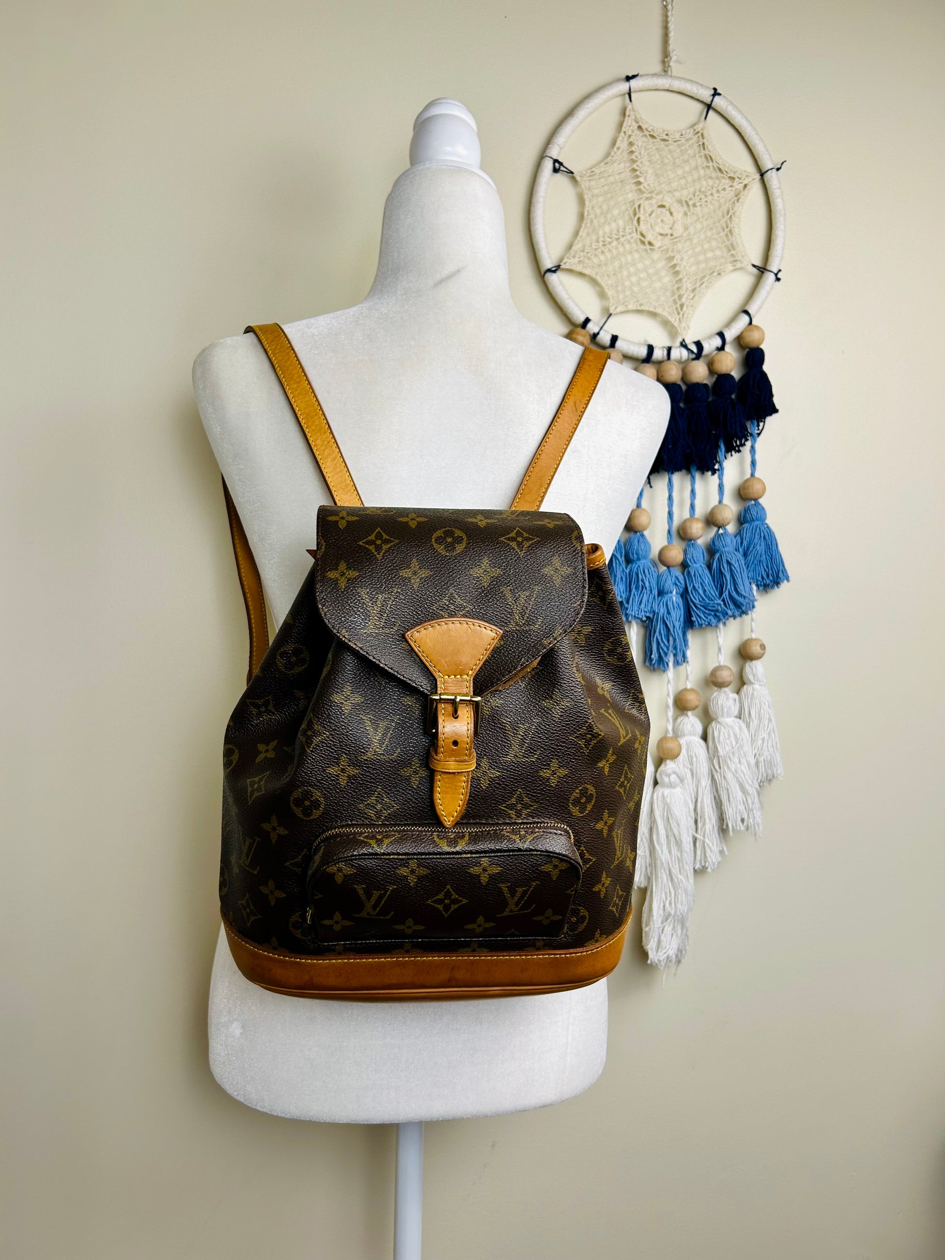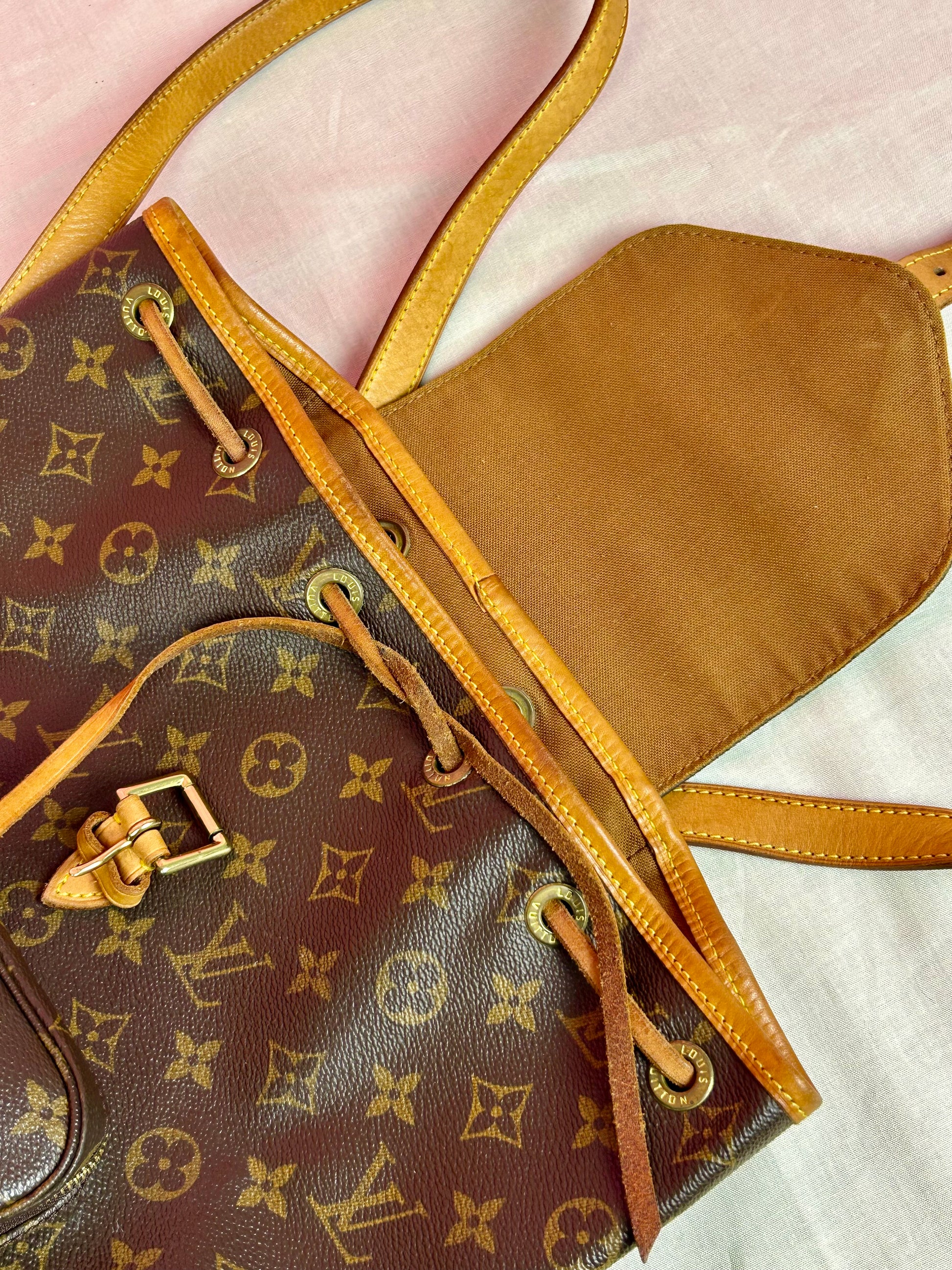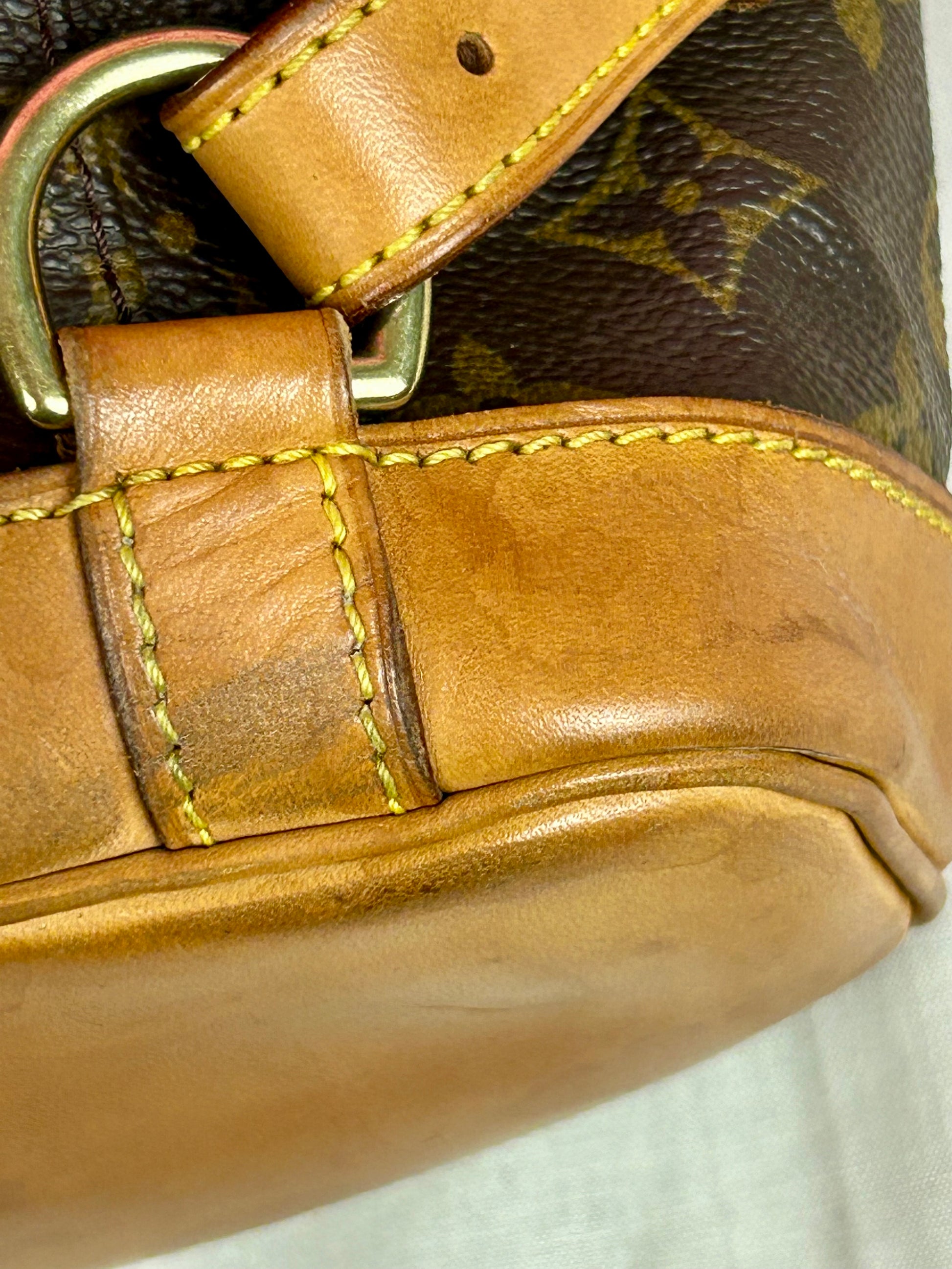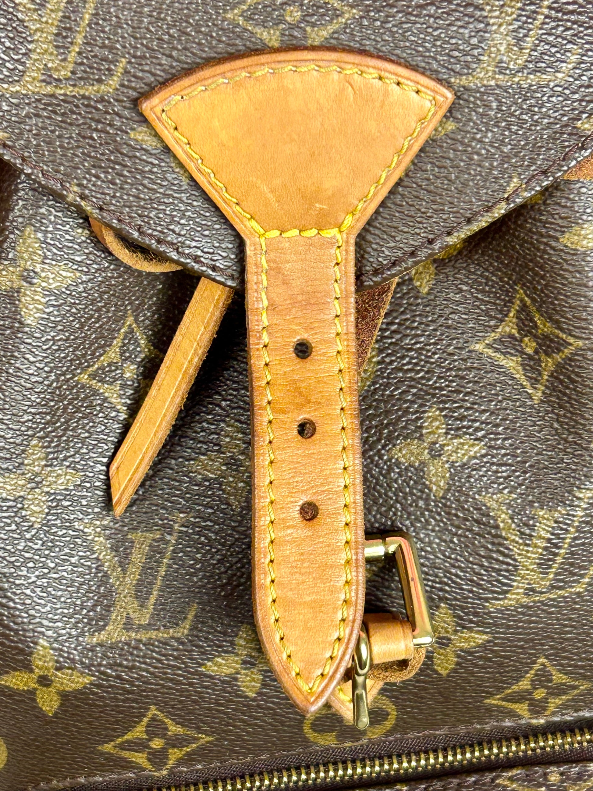 π Description: A perfect hands-free bag! Canvas is in great condition, no cracks or tears. Leather has watermarks throughout, but mostly an even patina. Straps and chapes are strong, no cracks, but do have wearing and marking consistent with normal usage. Buckle works properly and has no cracks. Trim is in excellent condition, it has no holes or cracks. Hardware is gold and works properly. Front pocket has some light markings. Interior has some mild pen marking but is otherwise clean. A classic and versatile piece!
