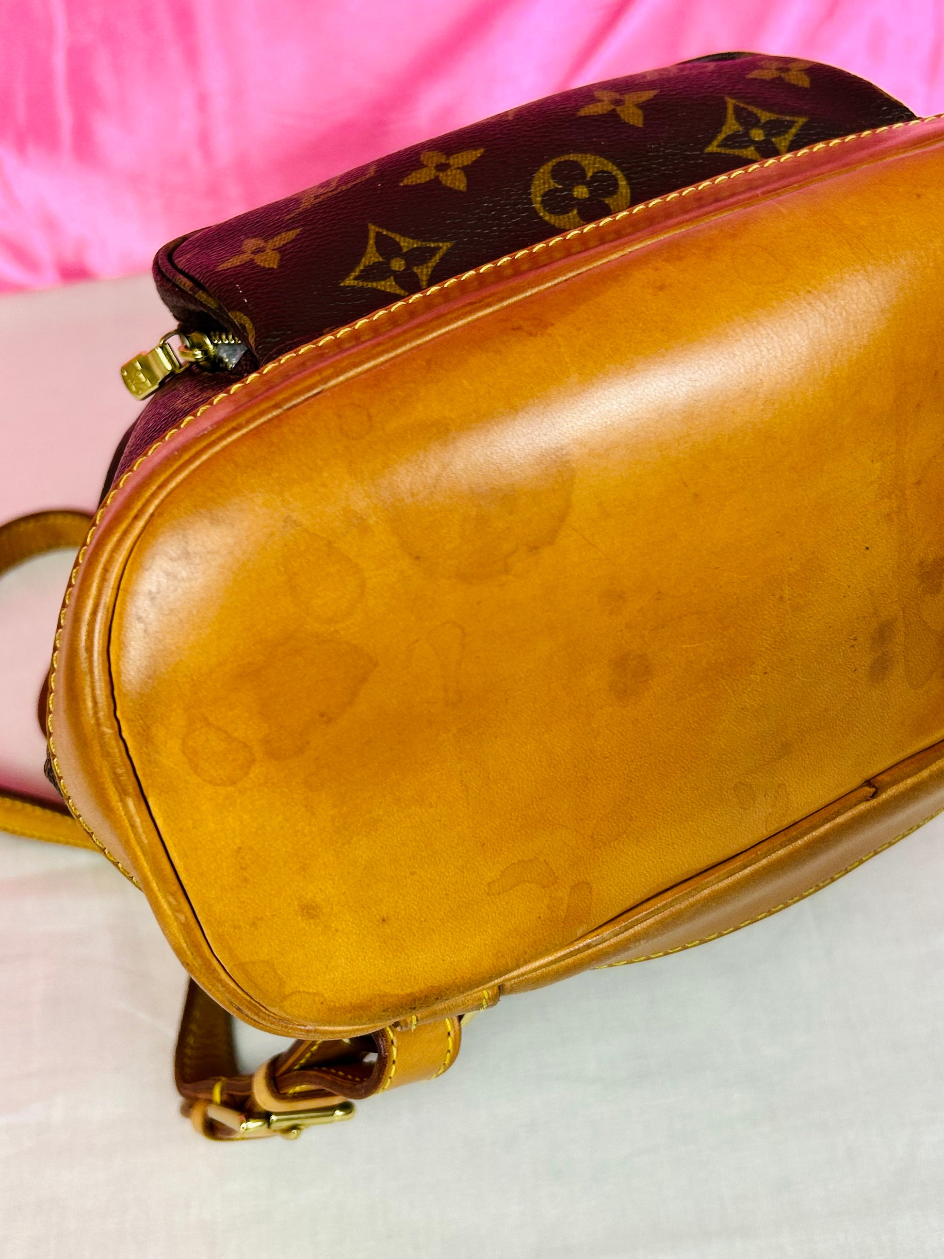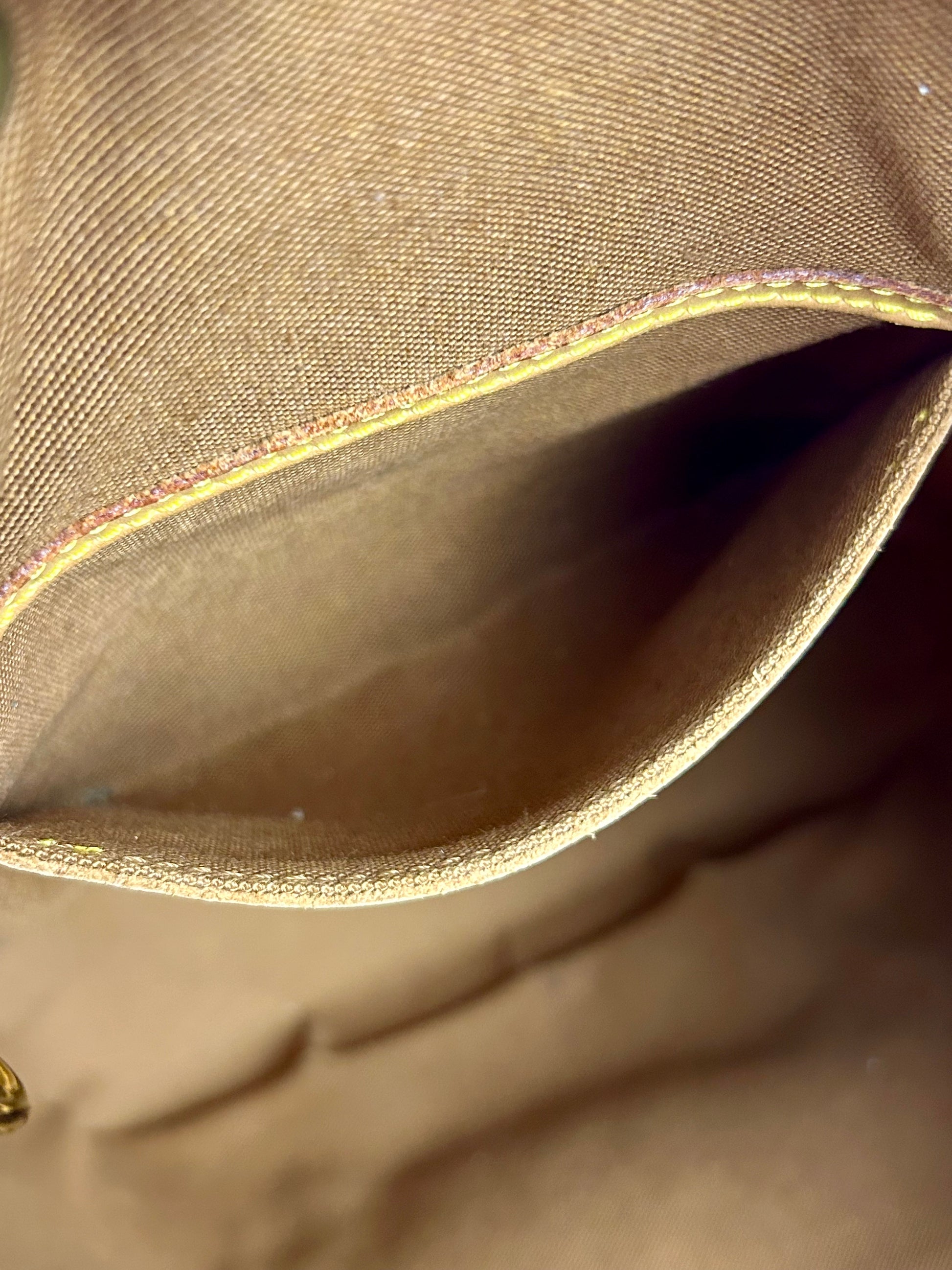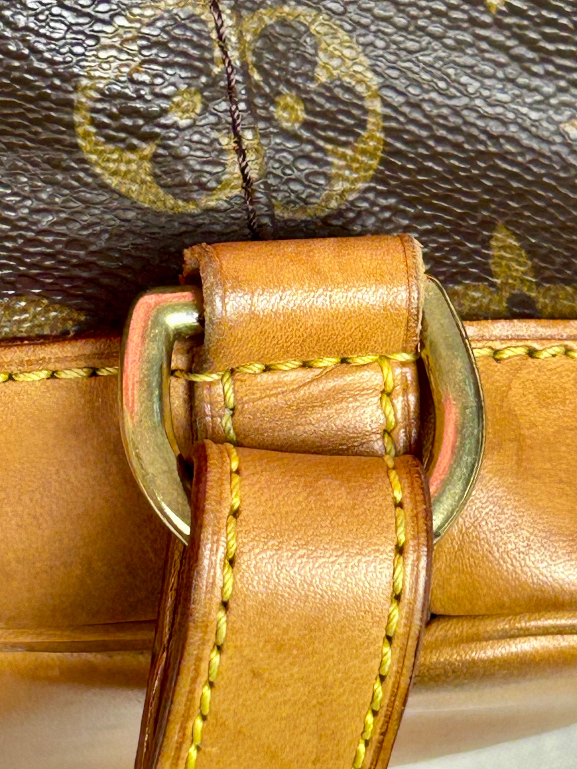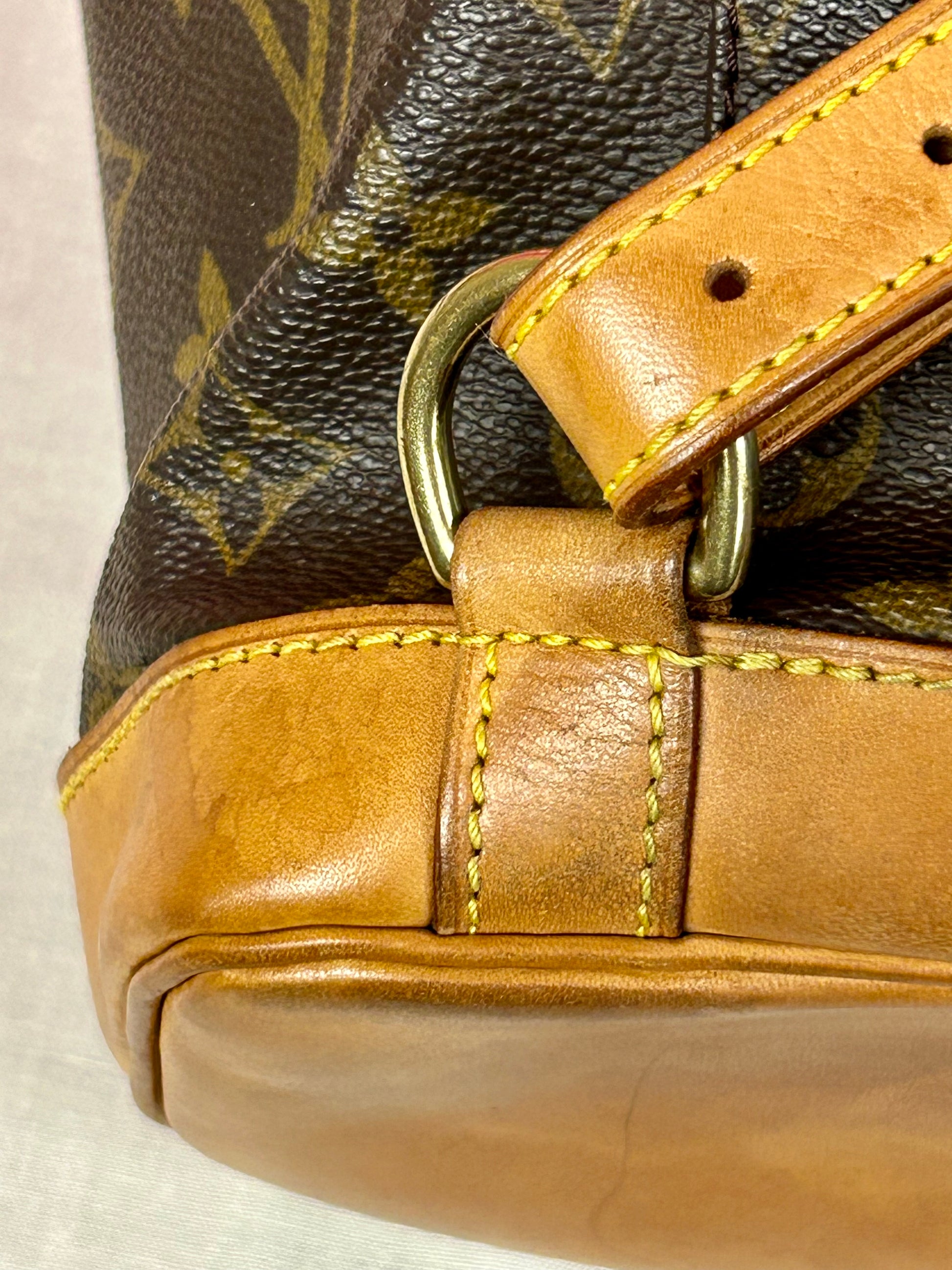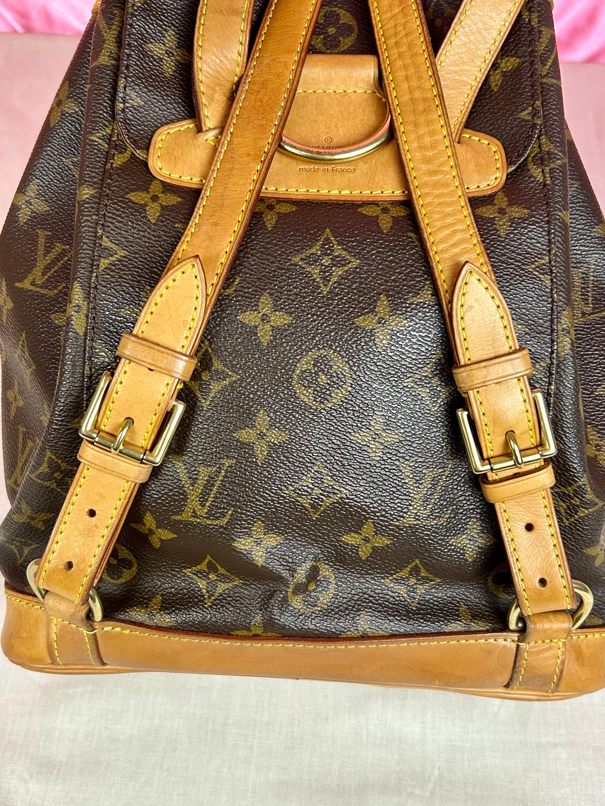 π Description: A perfect hands-free bag! Canvas is in great condition, no cracks or tears. Leather has watermarks throughout, but mostly an even patina. Straps and chapes are strong, no cracks, but do have wearing and marking consistent with normal usage. Buckle works properly and has no cracks. Trim is in excellent condition, it has no holes or cracks. Hardware is gold and works properly. Front pocket has some light markings. Interior has some mild pen marking but is otherwise clean. A classic and versatile piece!