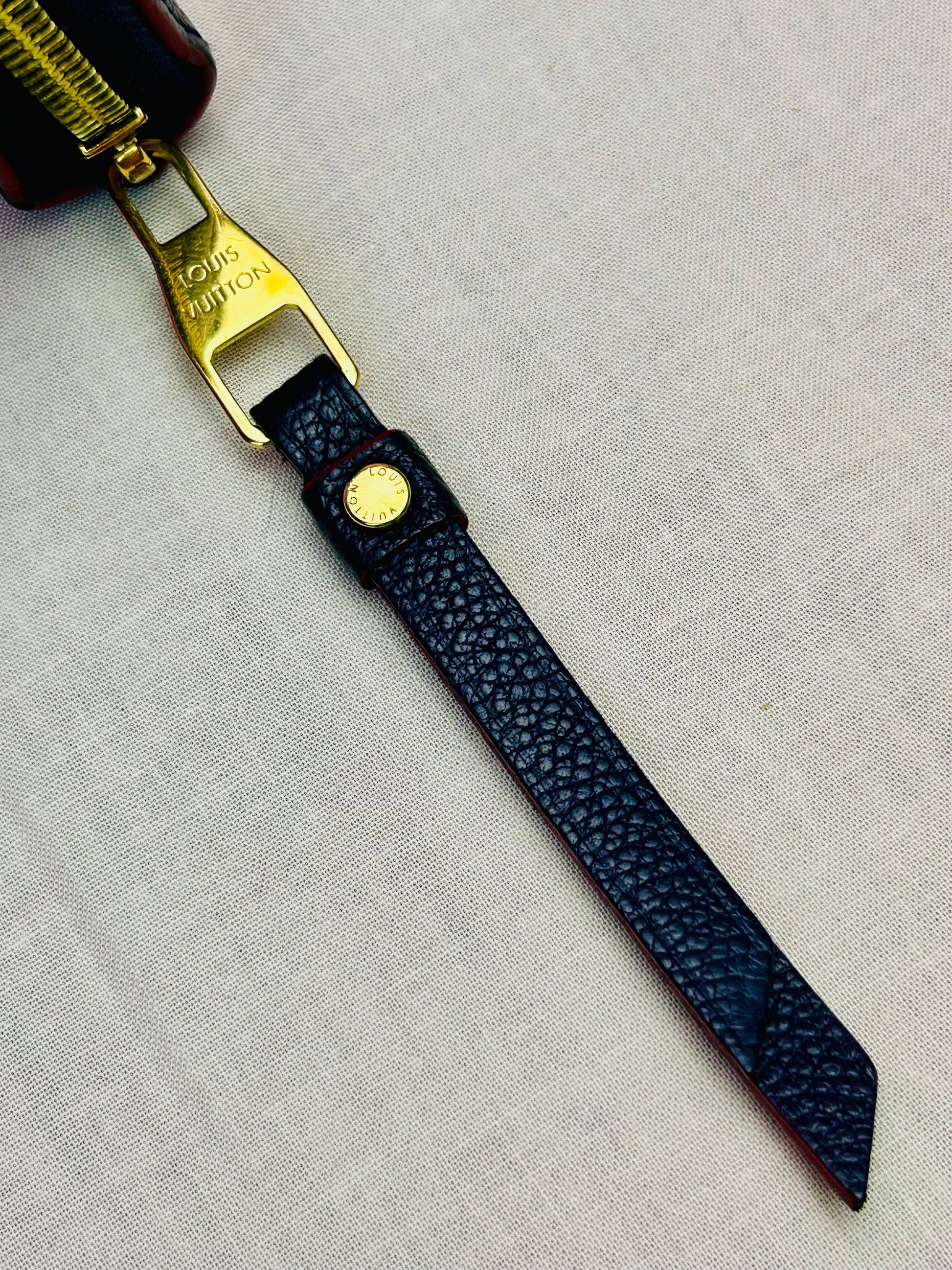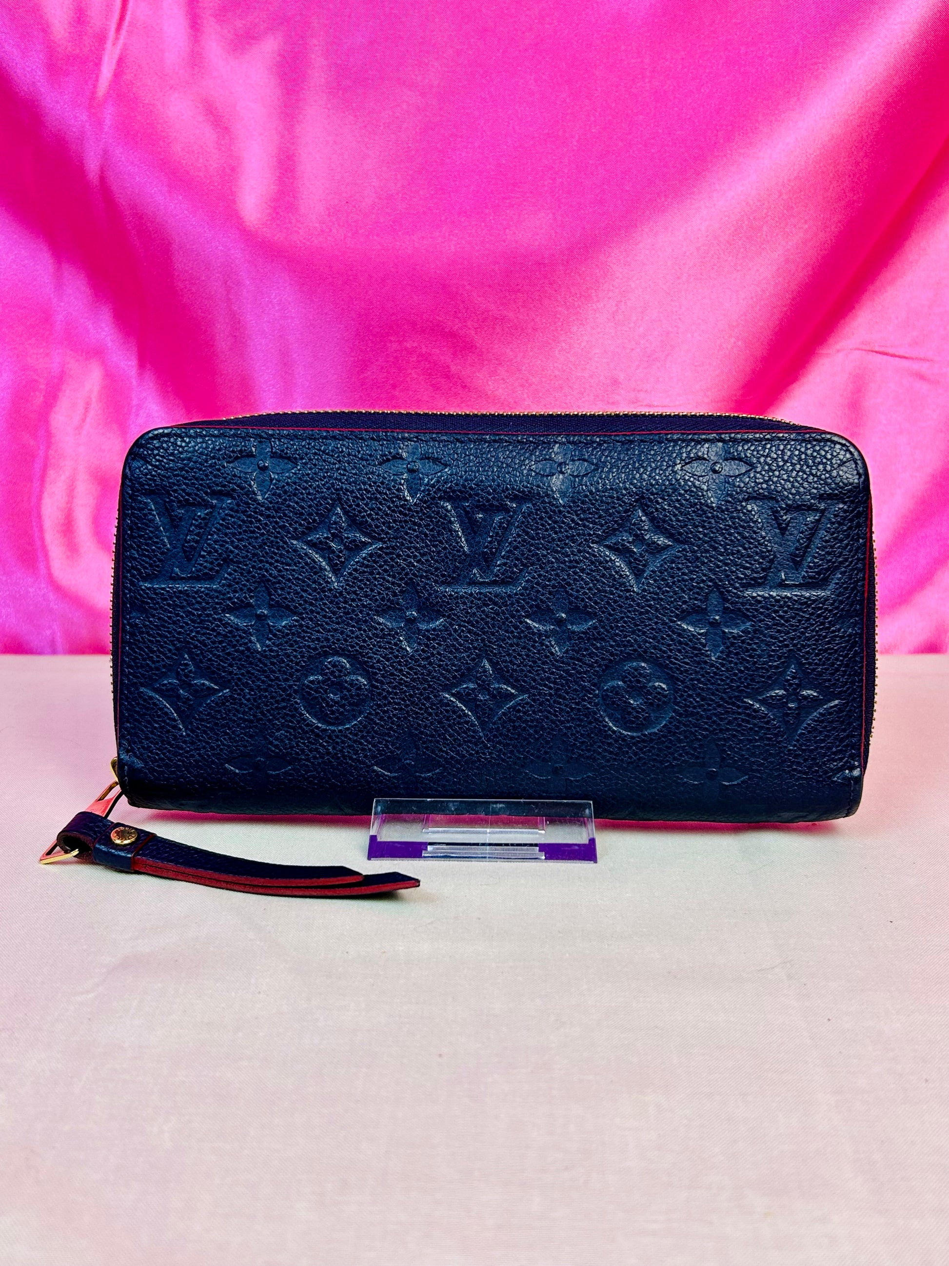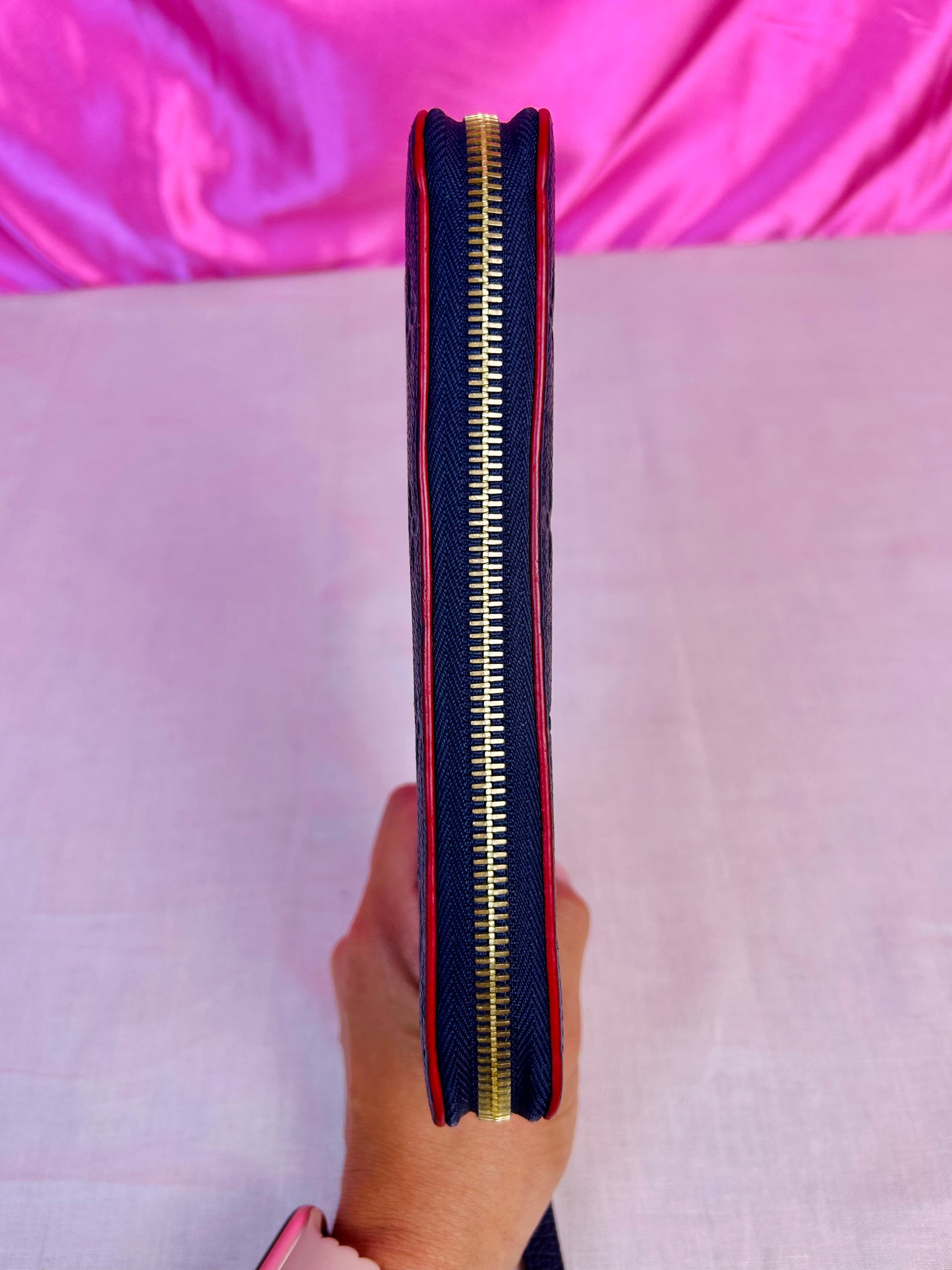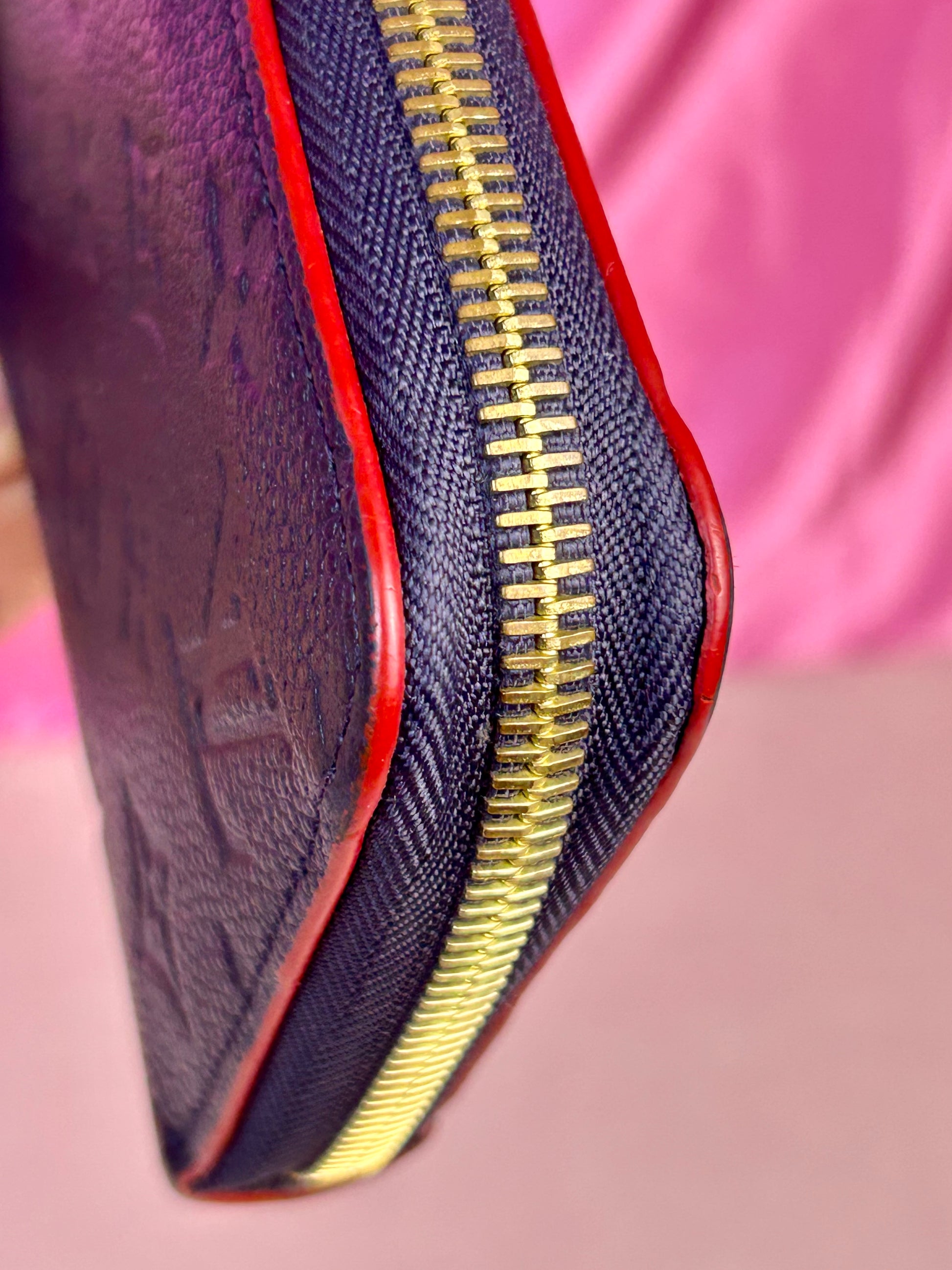 💜 Description: Leather is in excellent condition—this wallet is stunning! Red trim piping has some micro cracks near the bottom fold but no exposed piping. Main zipper and interior compartment zipper pull and function well. Interior has 1 slit compartment, 12 card slots, and coin pouch.
