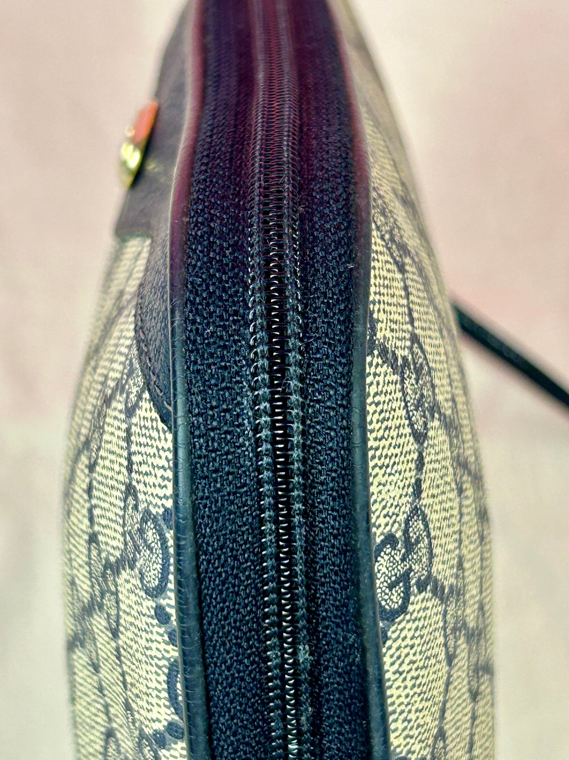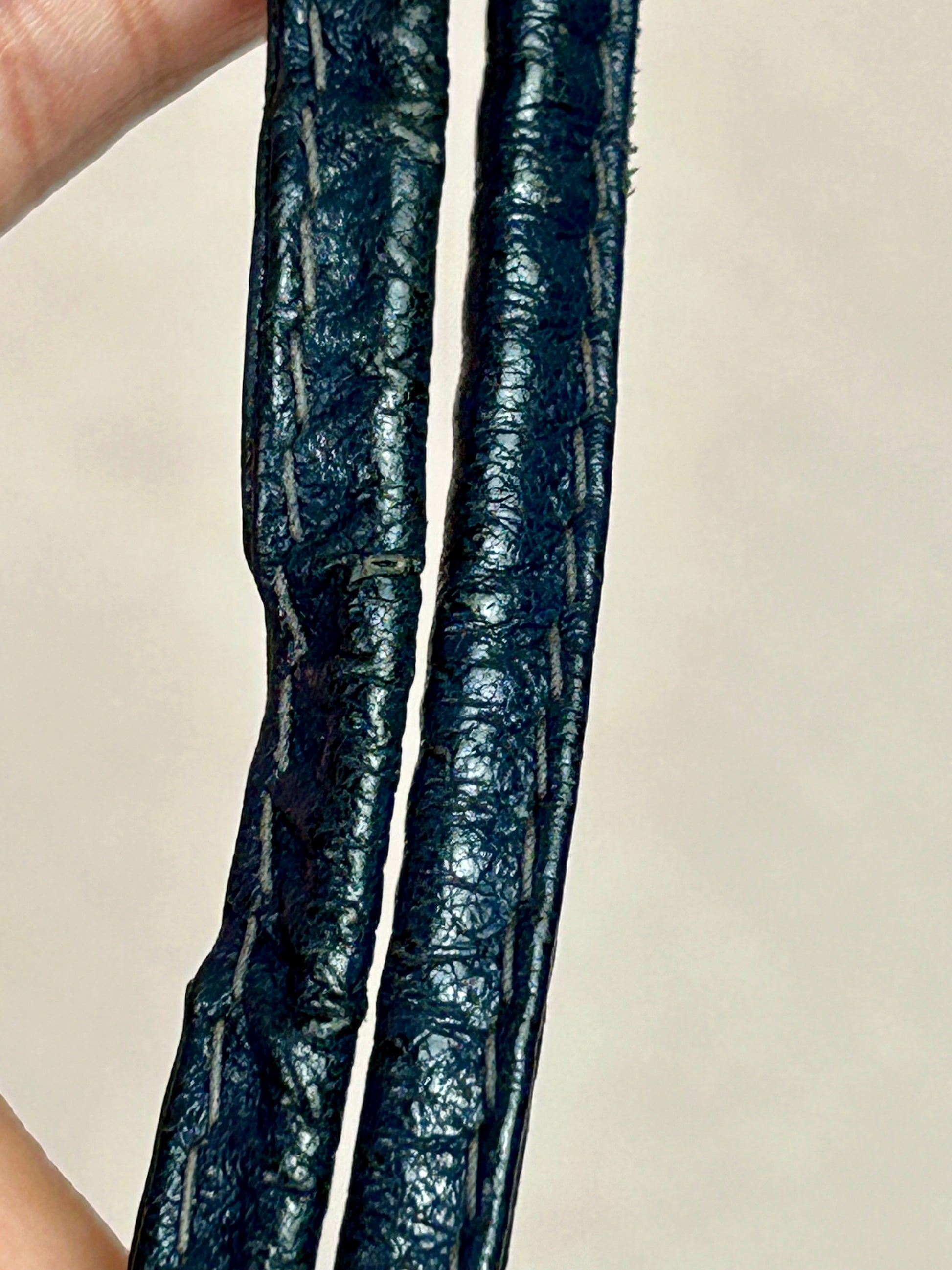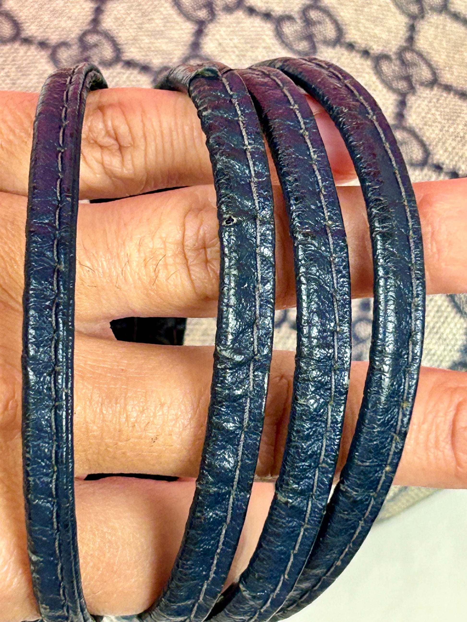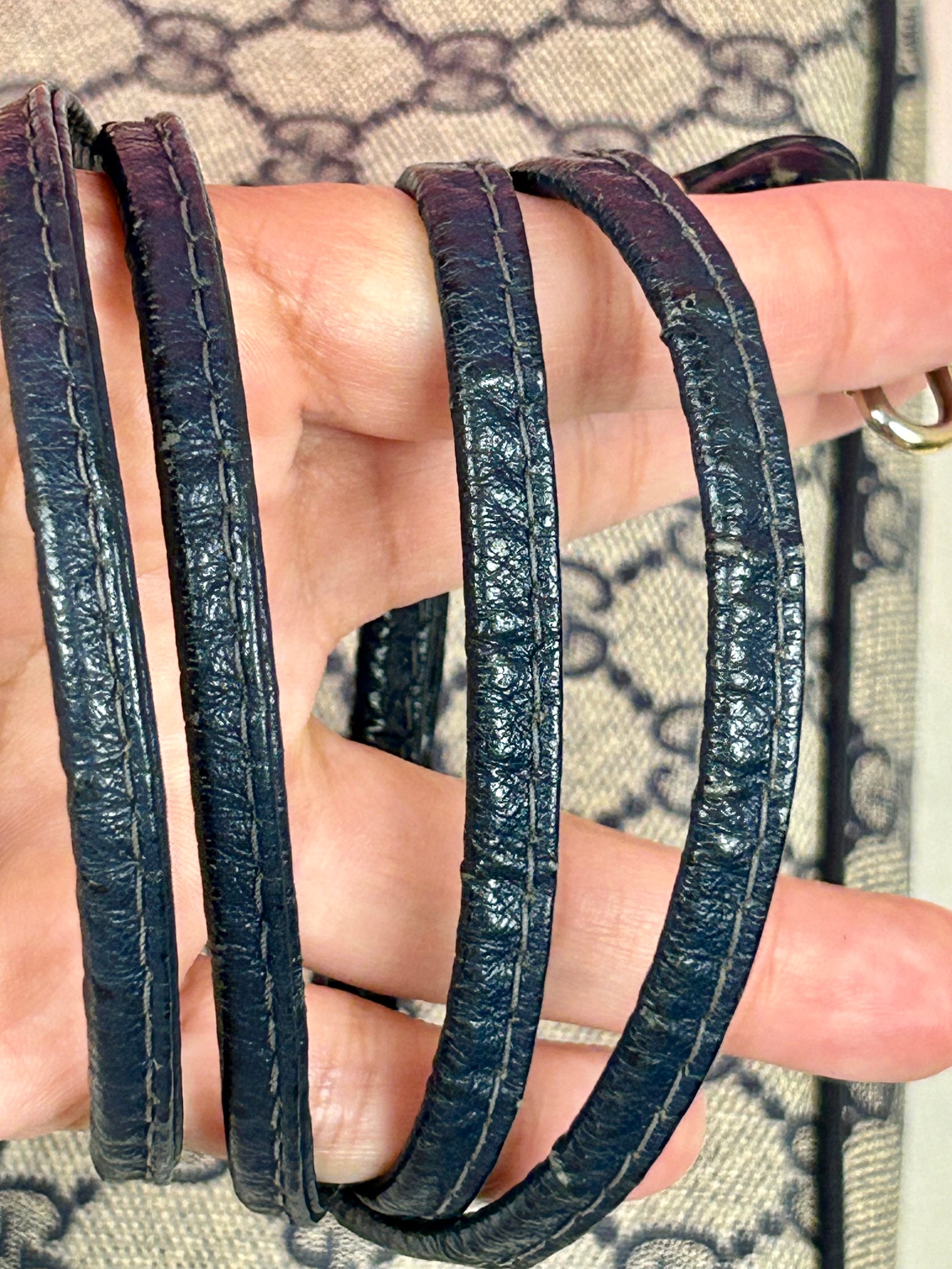 🤎 Description: The canvas is in beautiful condition, no cracks or tears. Navy leather shows light normal wear. Chapes are strong and in excellent condition. The zipper pull works smoothly and hardware has silvered. Interior has been cleaned, coating has been removed. The removeable leather strap has a flattened section, but is overall strong.
