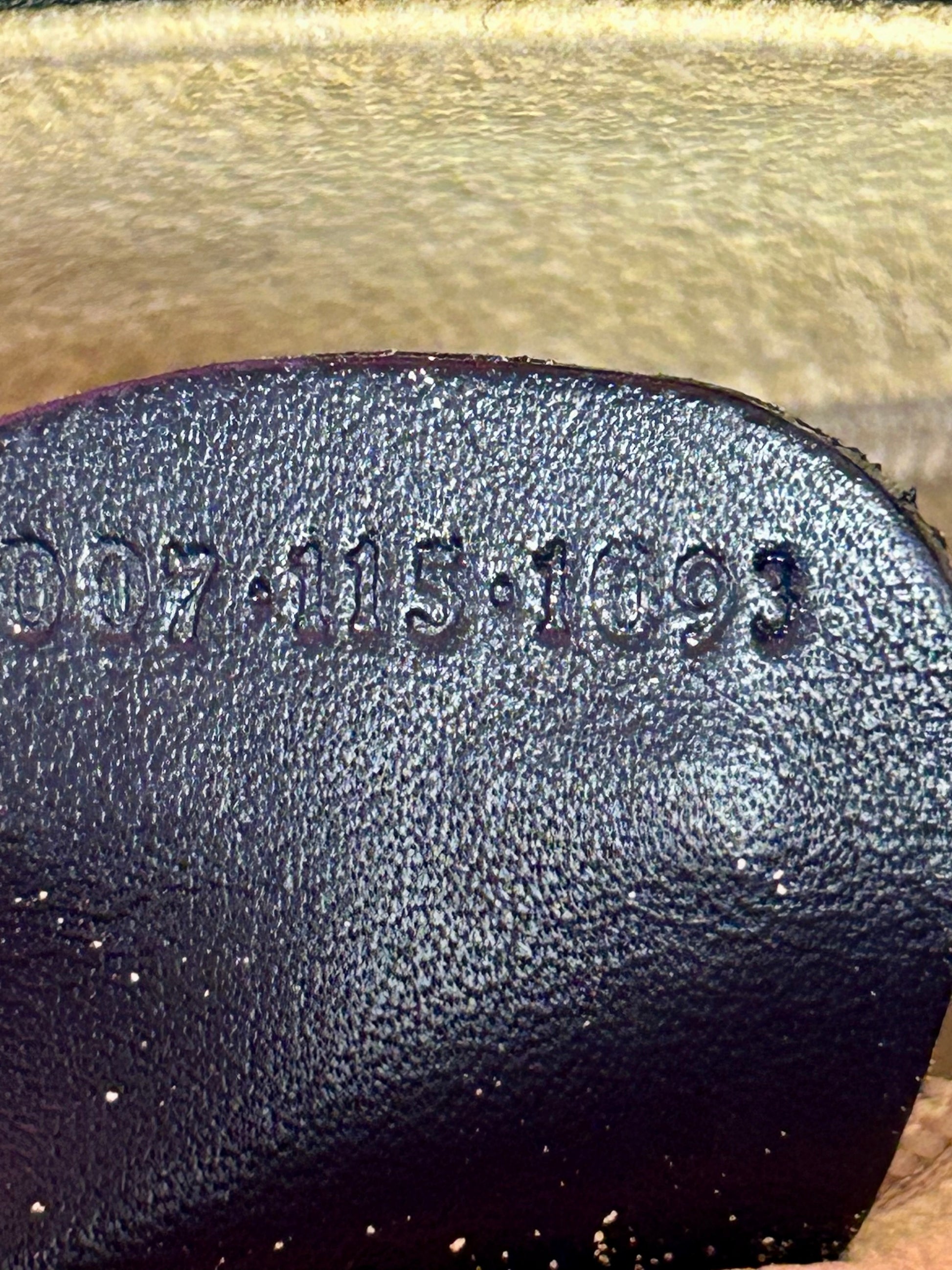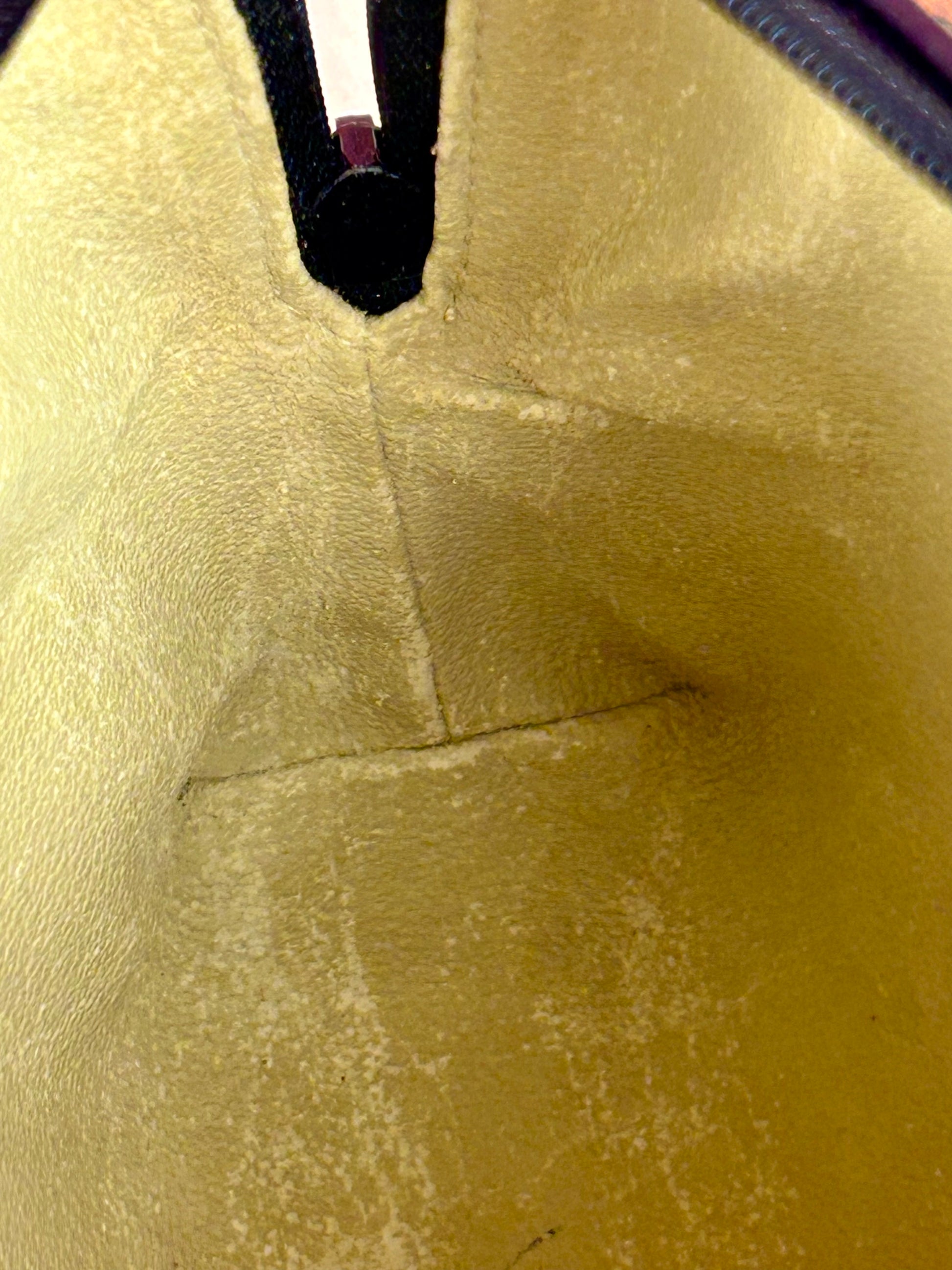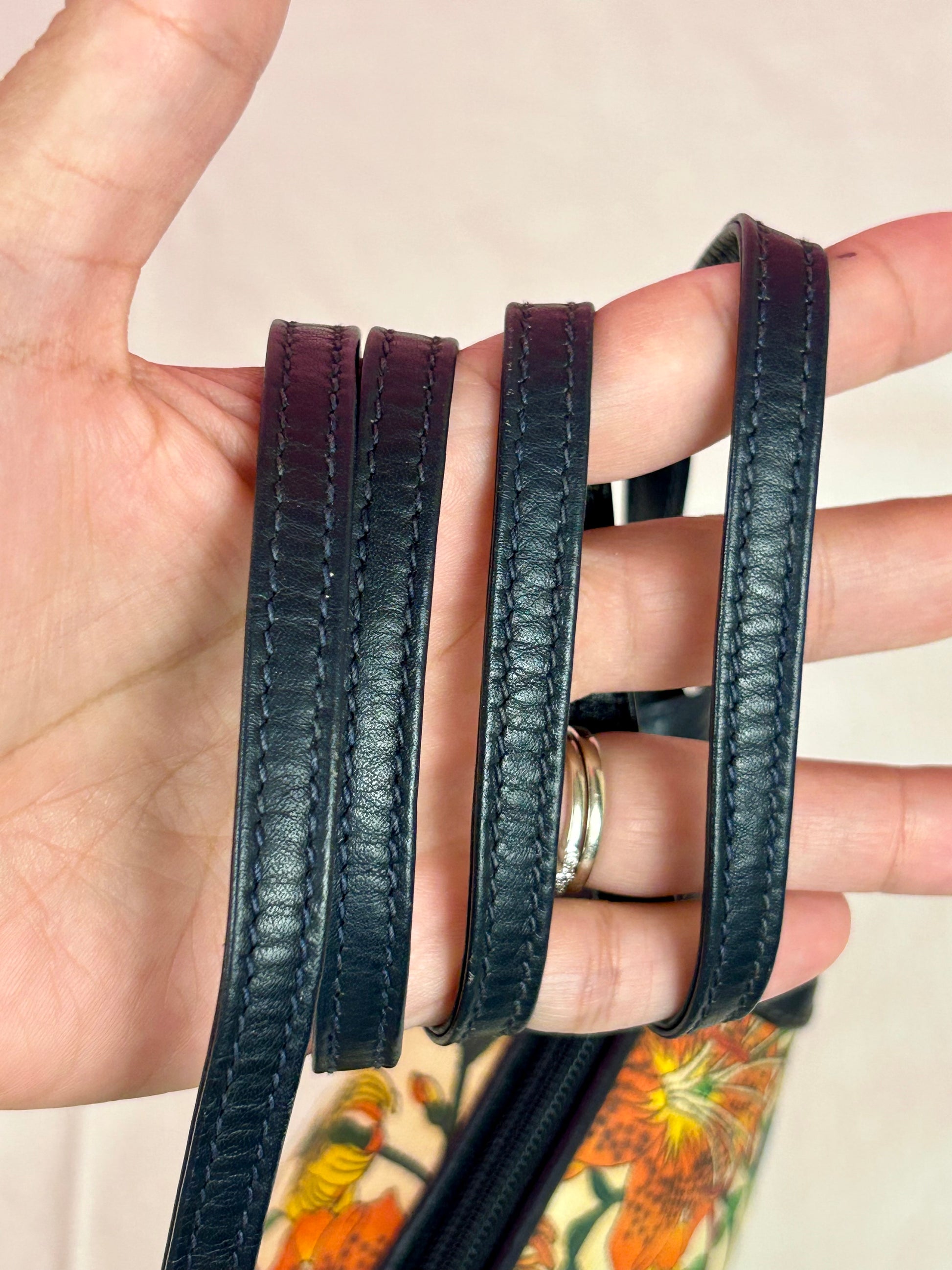 💜 Description: Fabric canvas has no cracks or tears. Some discoloration near the top zipper pull and top corners on both sides. Navy leather piping is in excellent condition. Bottom leather shows light wear on the corners. Leather strap is in excellent condition with minimal signs of use. Chapes are strong. Zipper functions well and hardware remains shiny. Interior lining is still intact, so it is a little powdery. There are a few pen markings inside but is otherwise clean. Interior pocket is clean and zipper pulls smoothly.