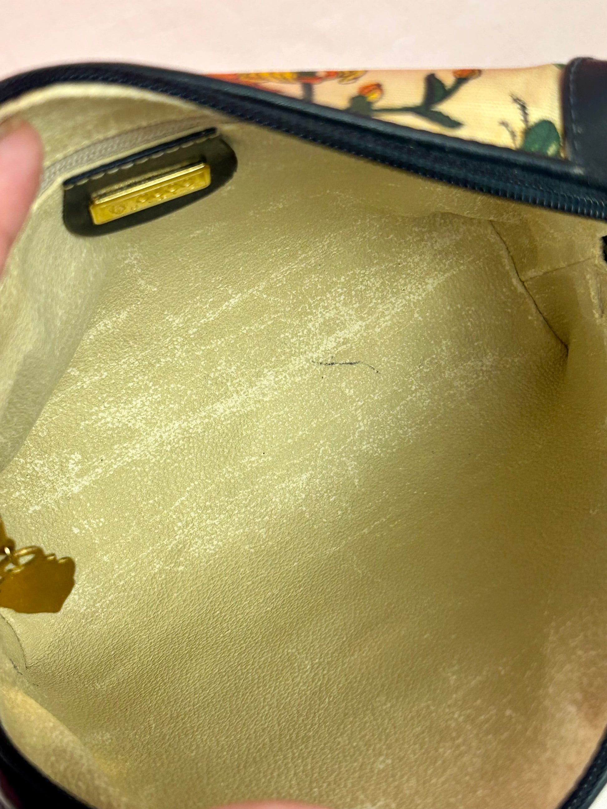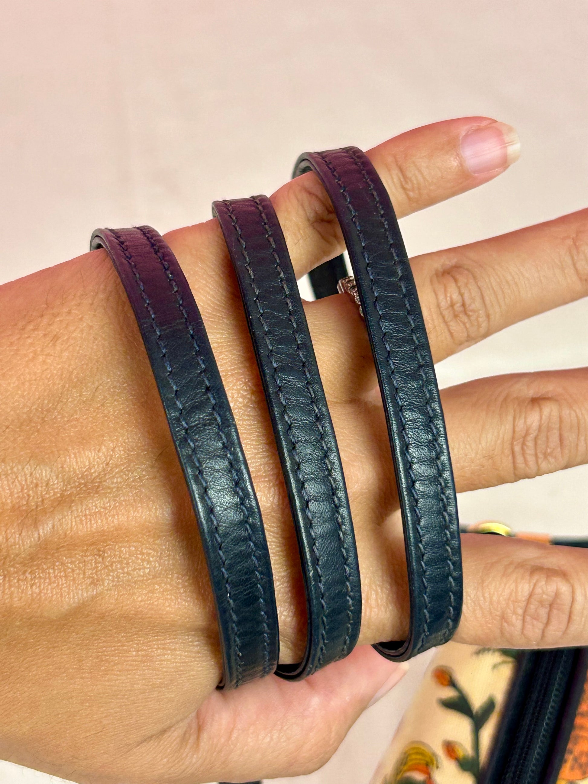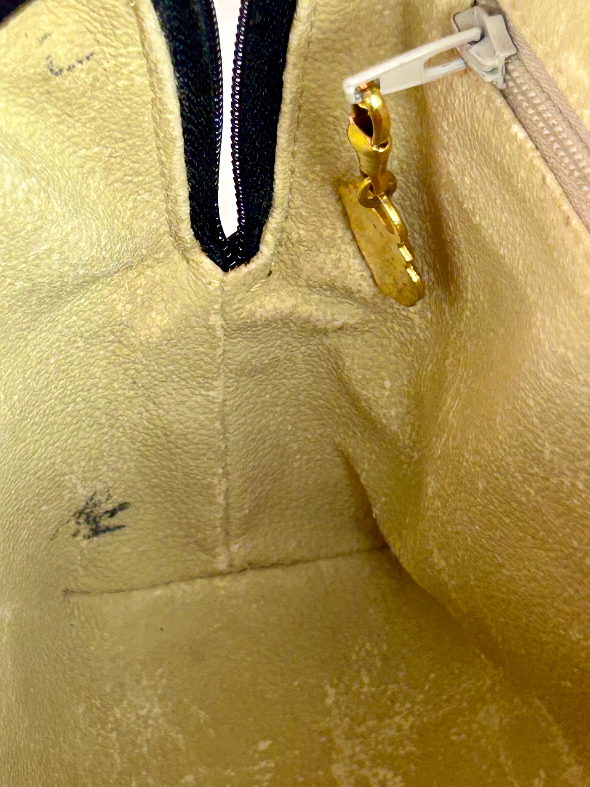 💜 Description: Fabric canvas has no cracks or tears. Some discoloration near the top zipper pull and top corners on both sides. Navy leather piping is in excellent condition. Bottom leather shows light wear on the corners. Leather strap is in excellent condition with minimal signs of use. Chapes are strong. Zipper functions well and hardware remains shiny. Interior lining is still intact, so it is a little powdery. There are a few pen markings inside but is otherwise clean. Interior pocket is clean and zipper pulls smoothly.