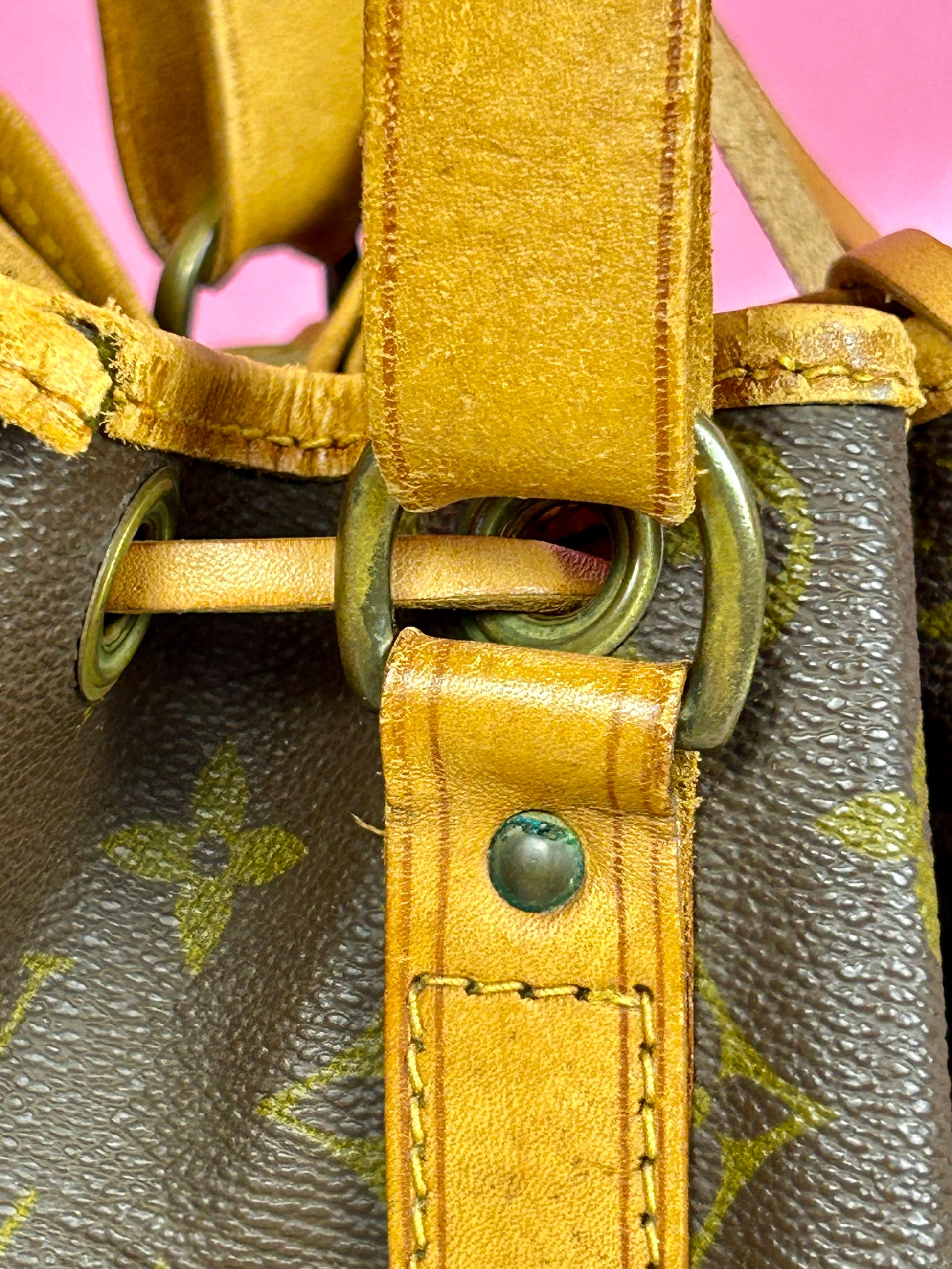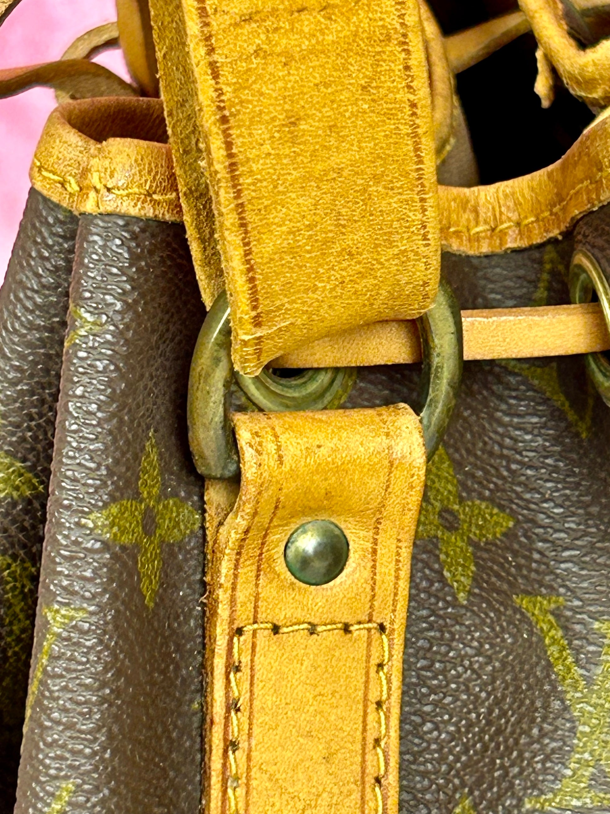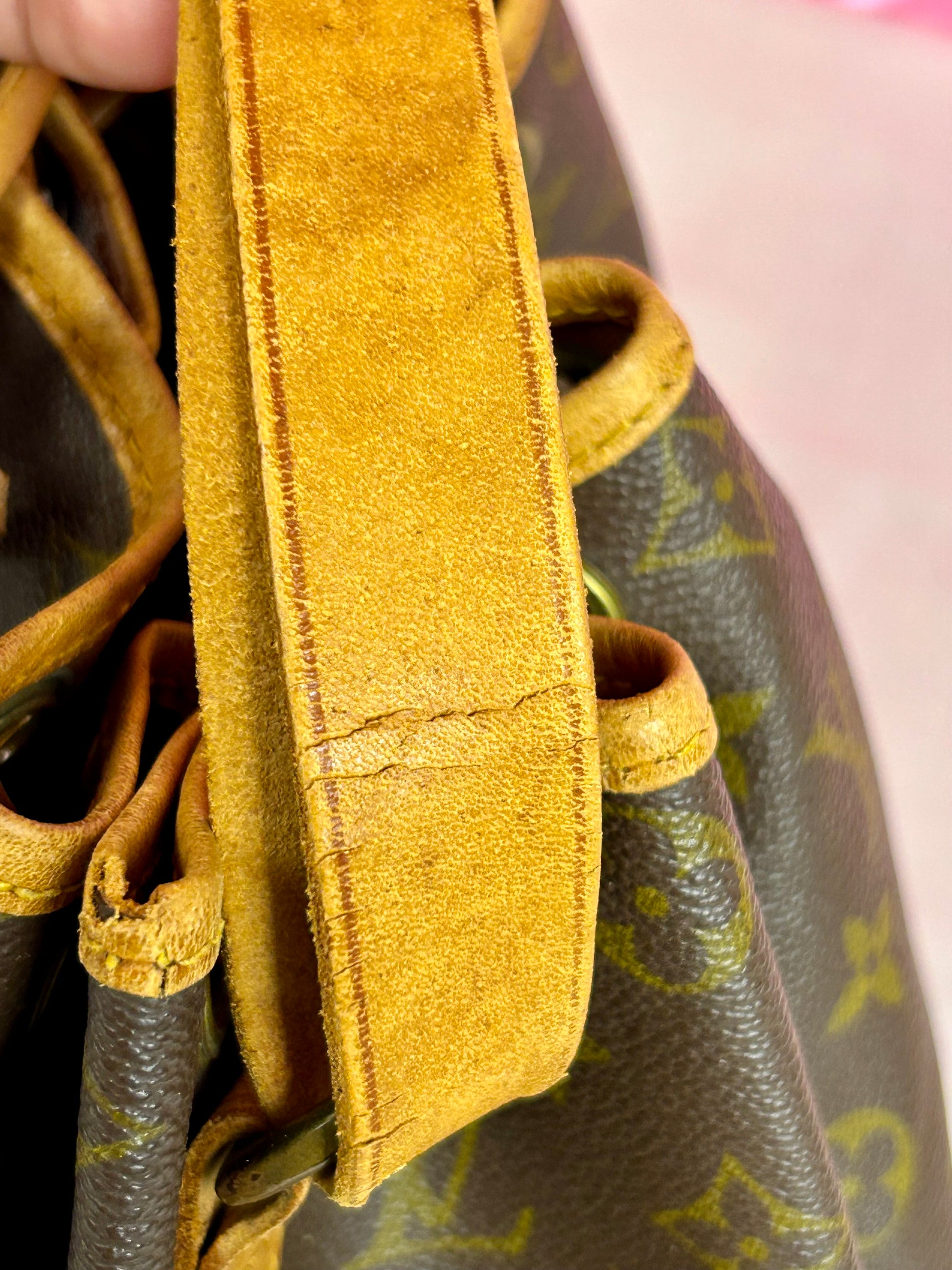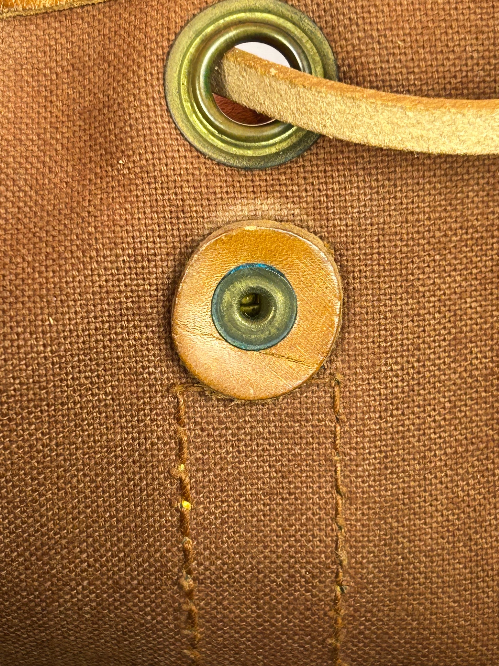 💜 Description: Canvas is in great condition, no cracks or tears. Leather has watermarks throughout, but mostly an even patina. Strap shows normal usage, does have hairline cracks. Chapes are strong. Buckles works properly. Trim has holes and cracks throughout. All rivets are intact. Drawstring is generic. Interior is clean. A classic and versatile piece!