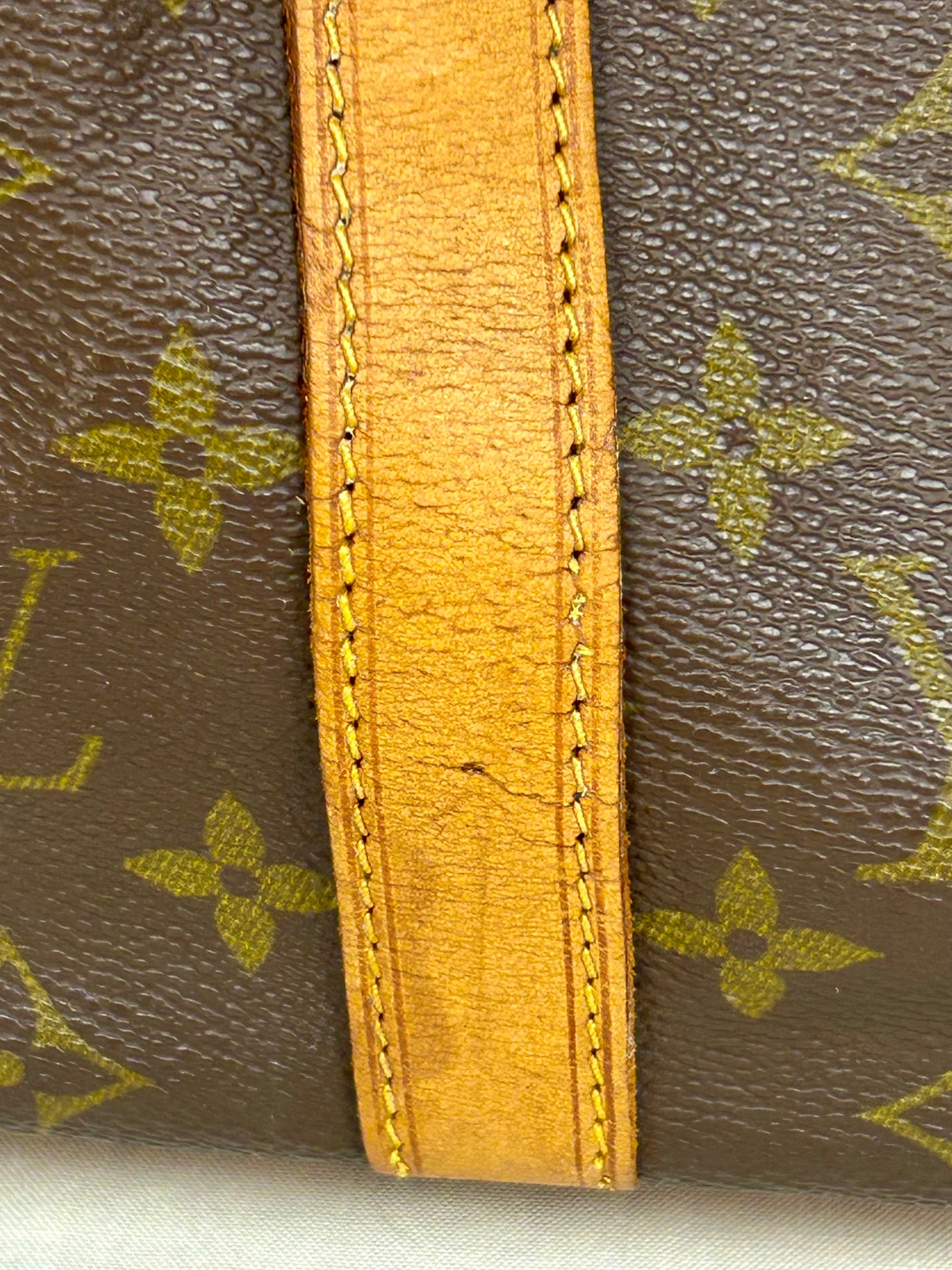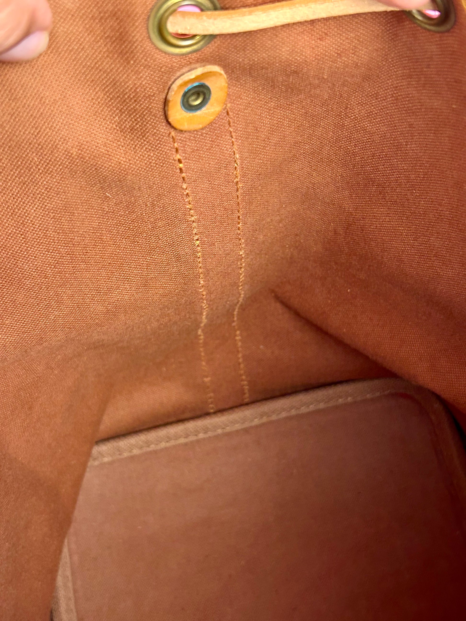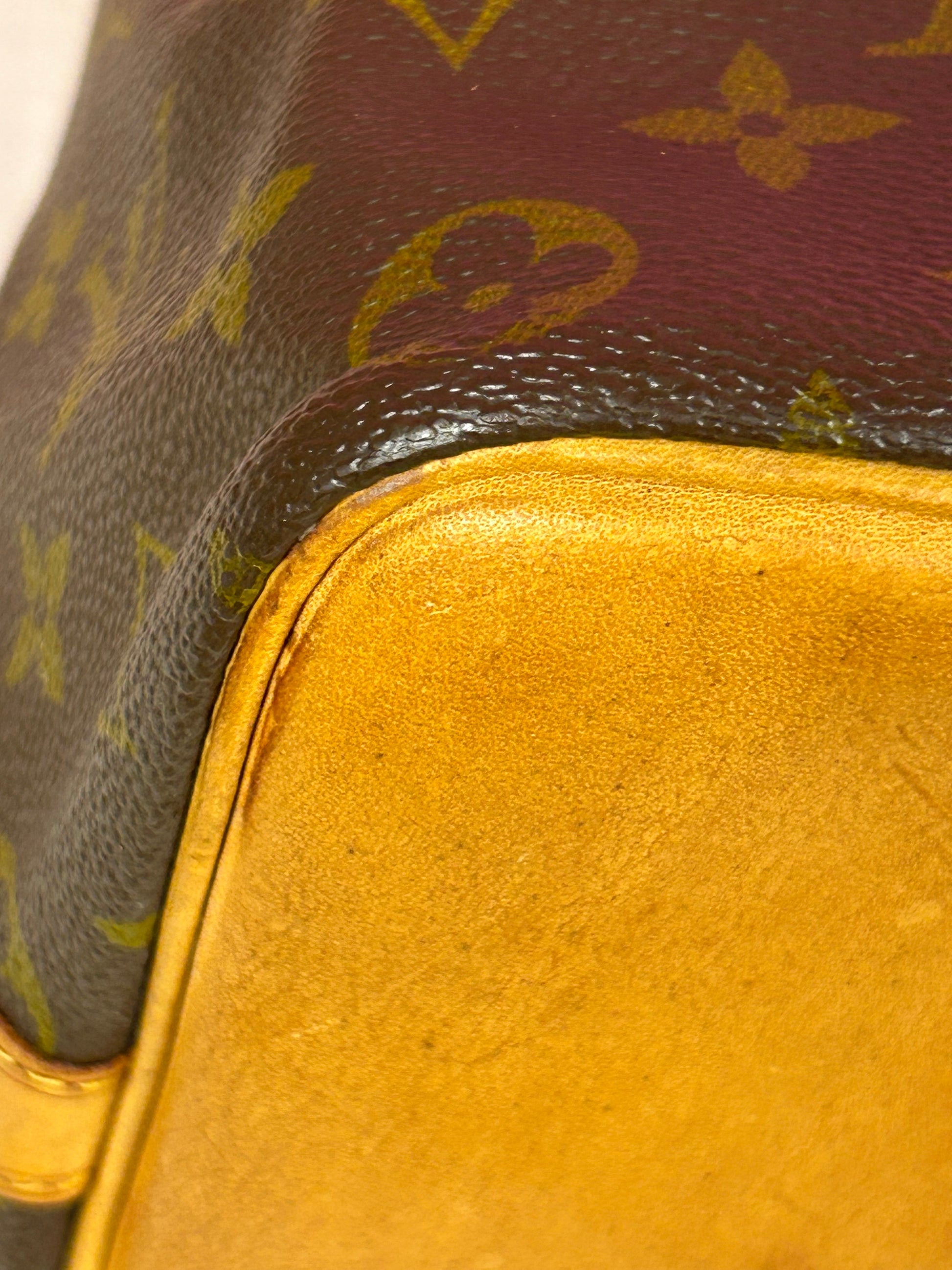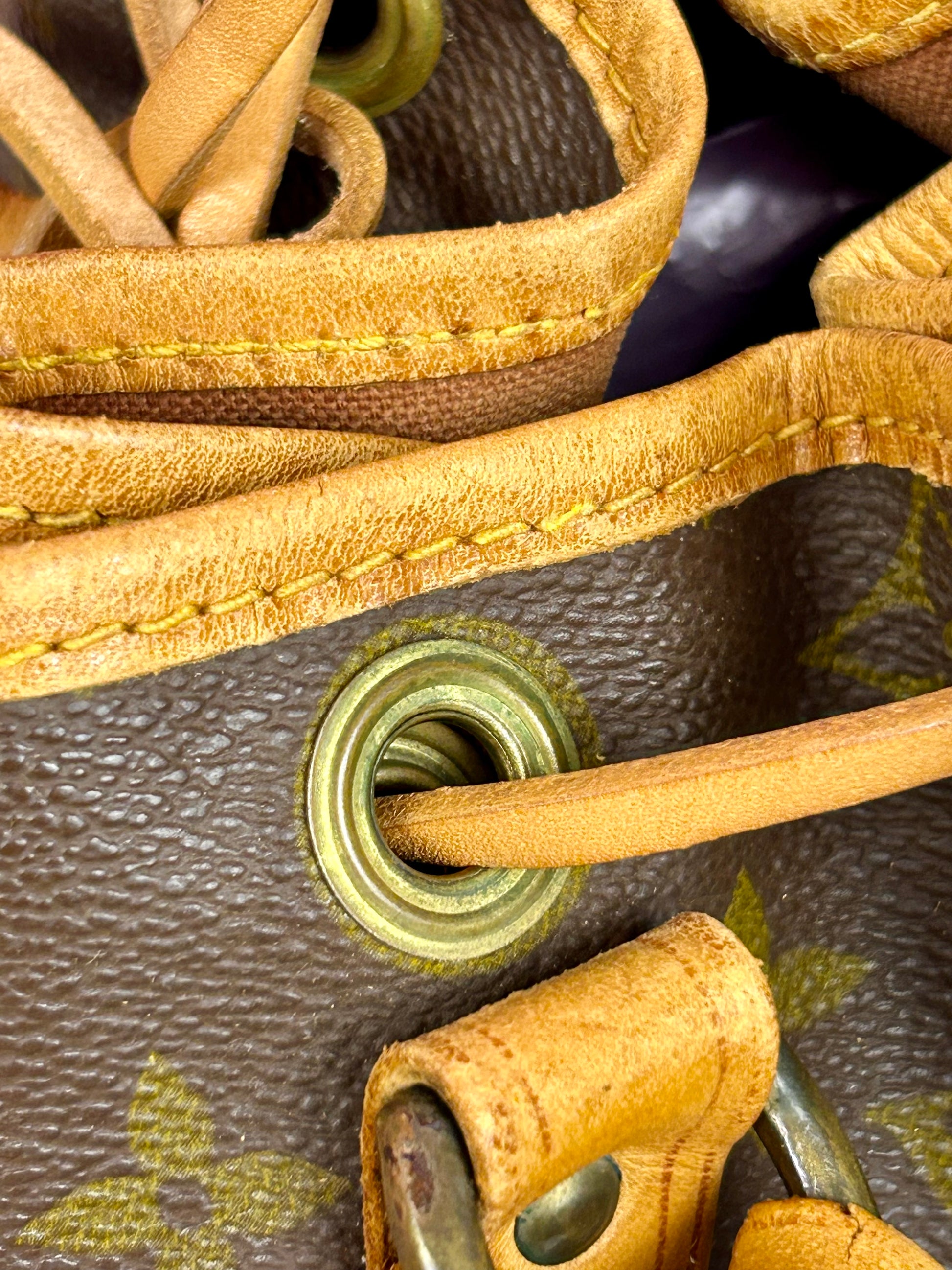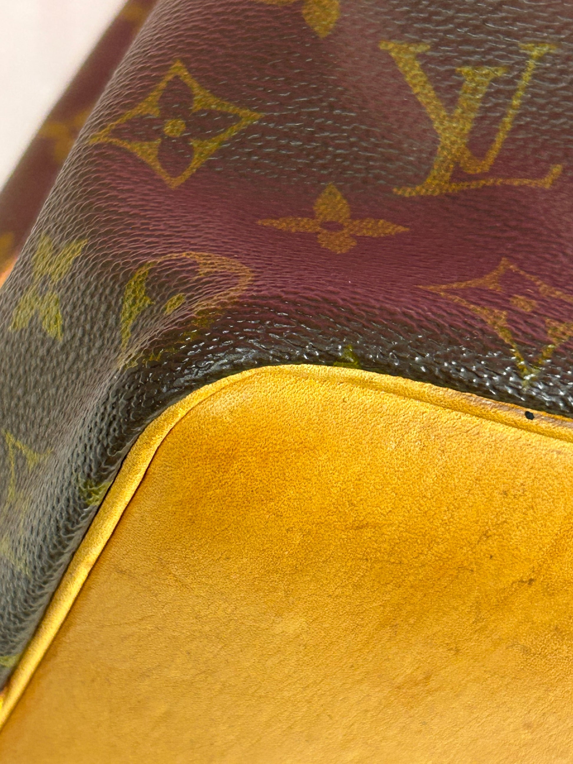 💜 Description: Canvas is in great condition, no cracks or tears. Leather has watermarks throughout, but mostly an even patina. Strap shows normal usage, does have hairline cracks. Chapes are strong. Buckles works properly. Trim has holes and cracks throughout. All rivets are intact. Drawstring is generic. Interior is clean. A classic and versatile piece!