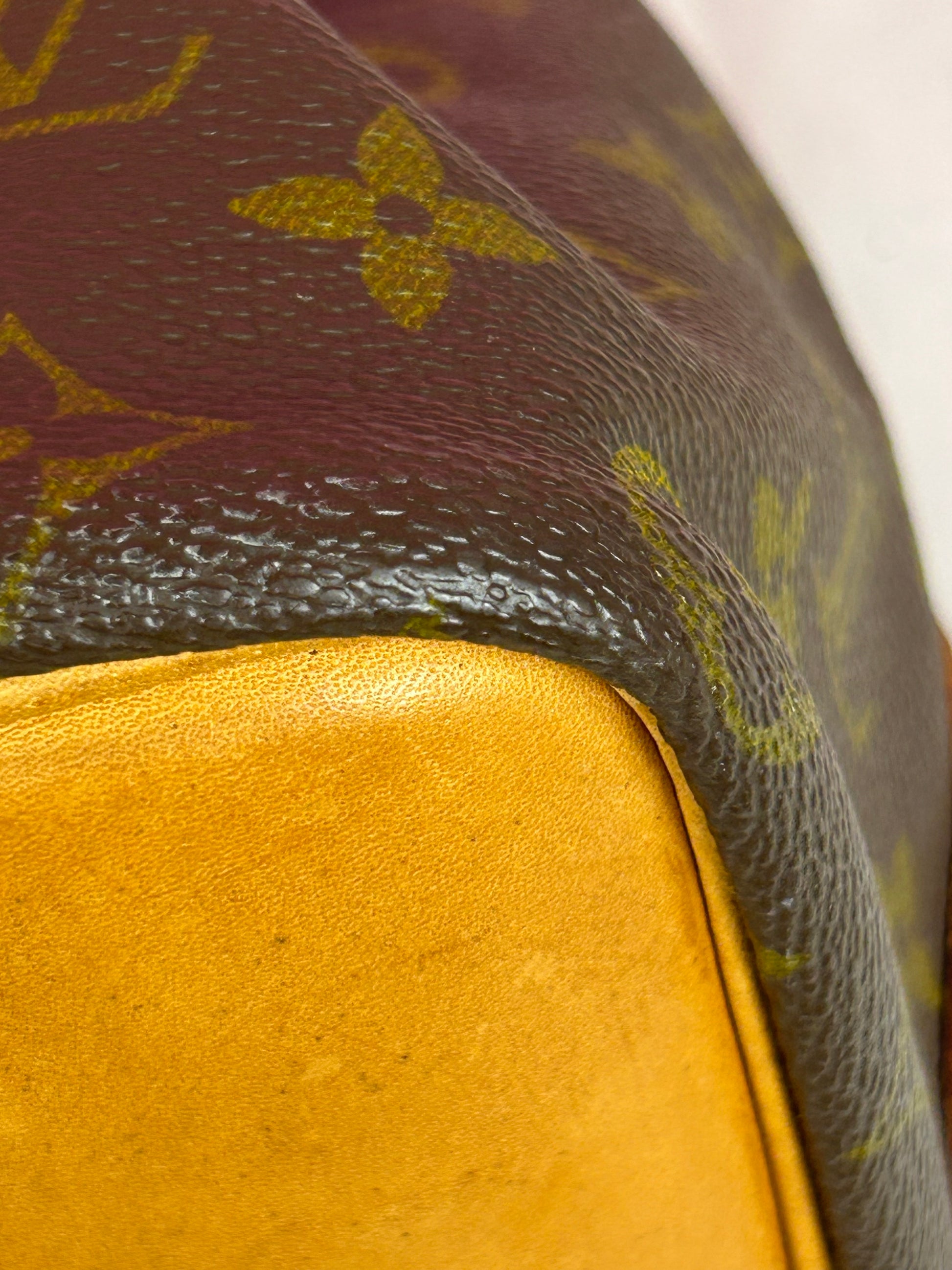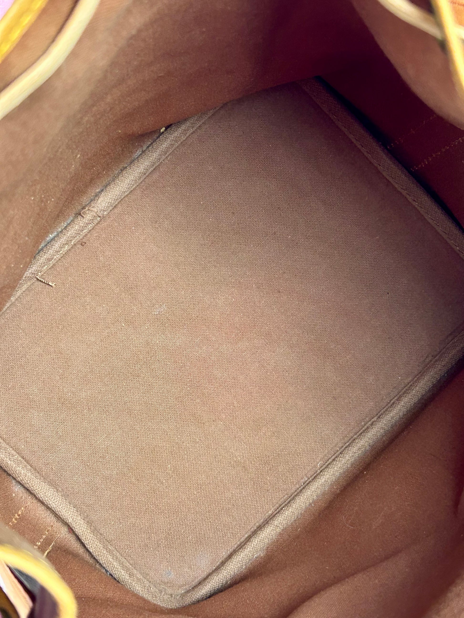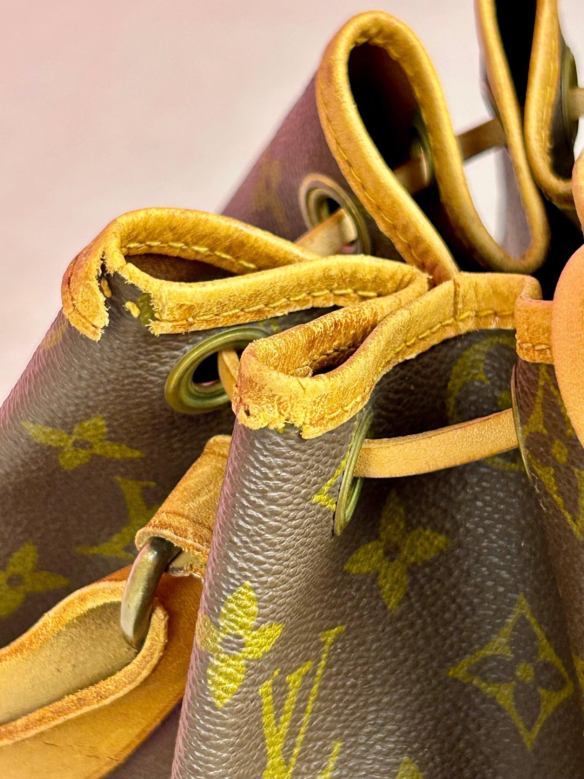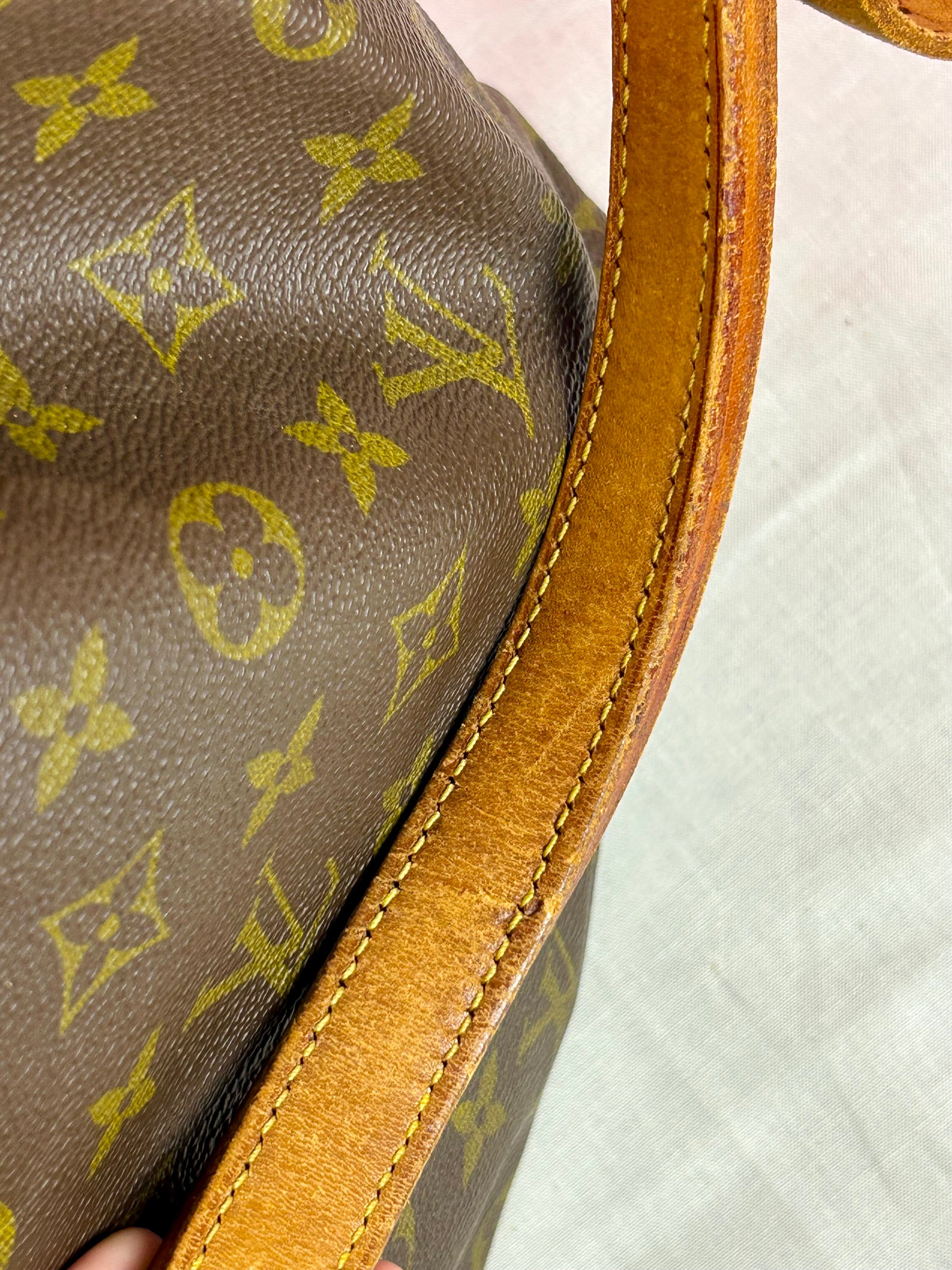 💜 Description: Canvas is in great condition, no cracks or tears. Leather has watermarks throughout, but mostly an even patina. Strap shows normal usage, does have hairline cracks. Chapes are strong. Buckles works properly. Trim has holes and cracks throughout. All rivets are intact. Drawstring is generic. Interior is clean. A classic and versatile piece!