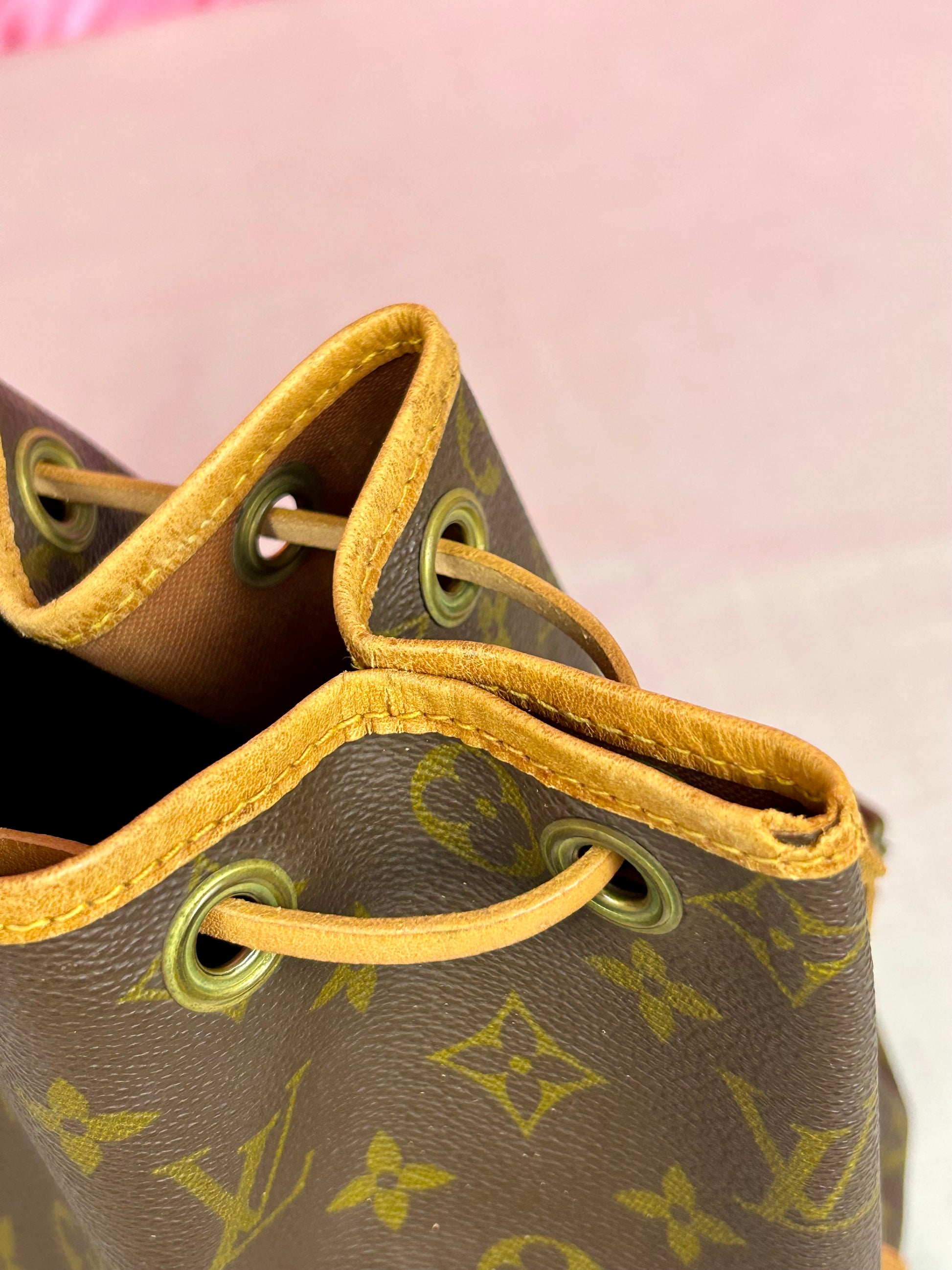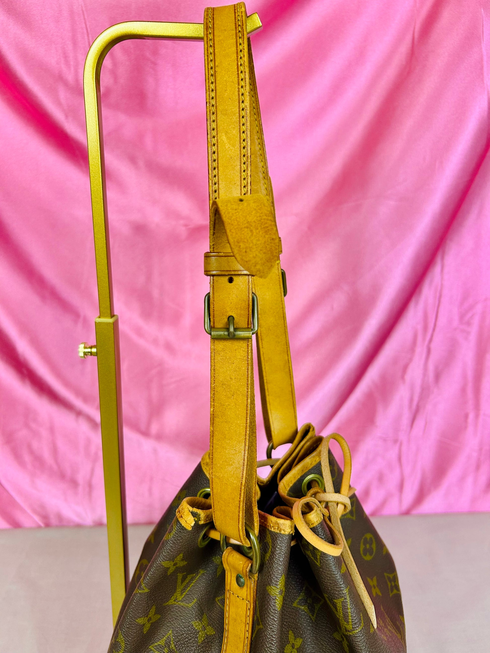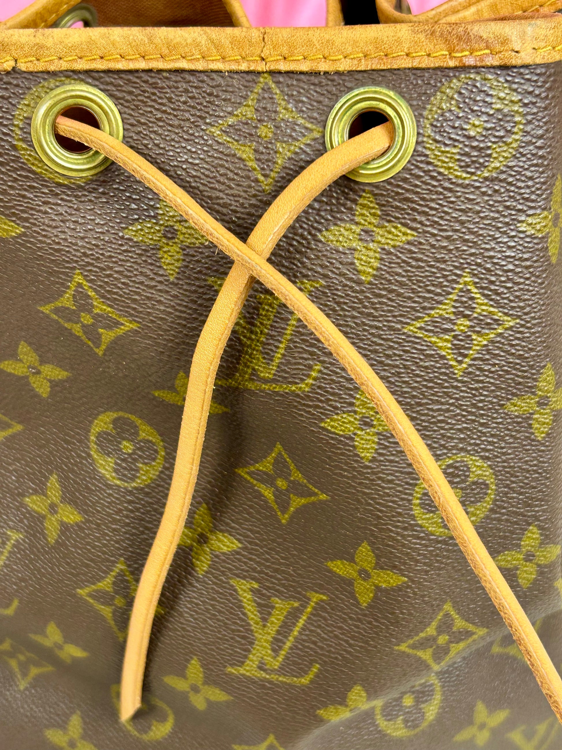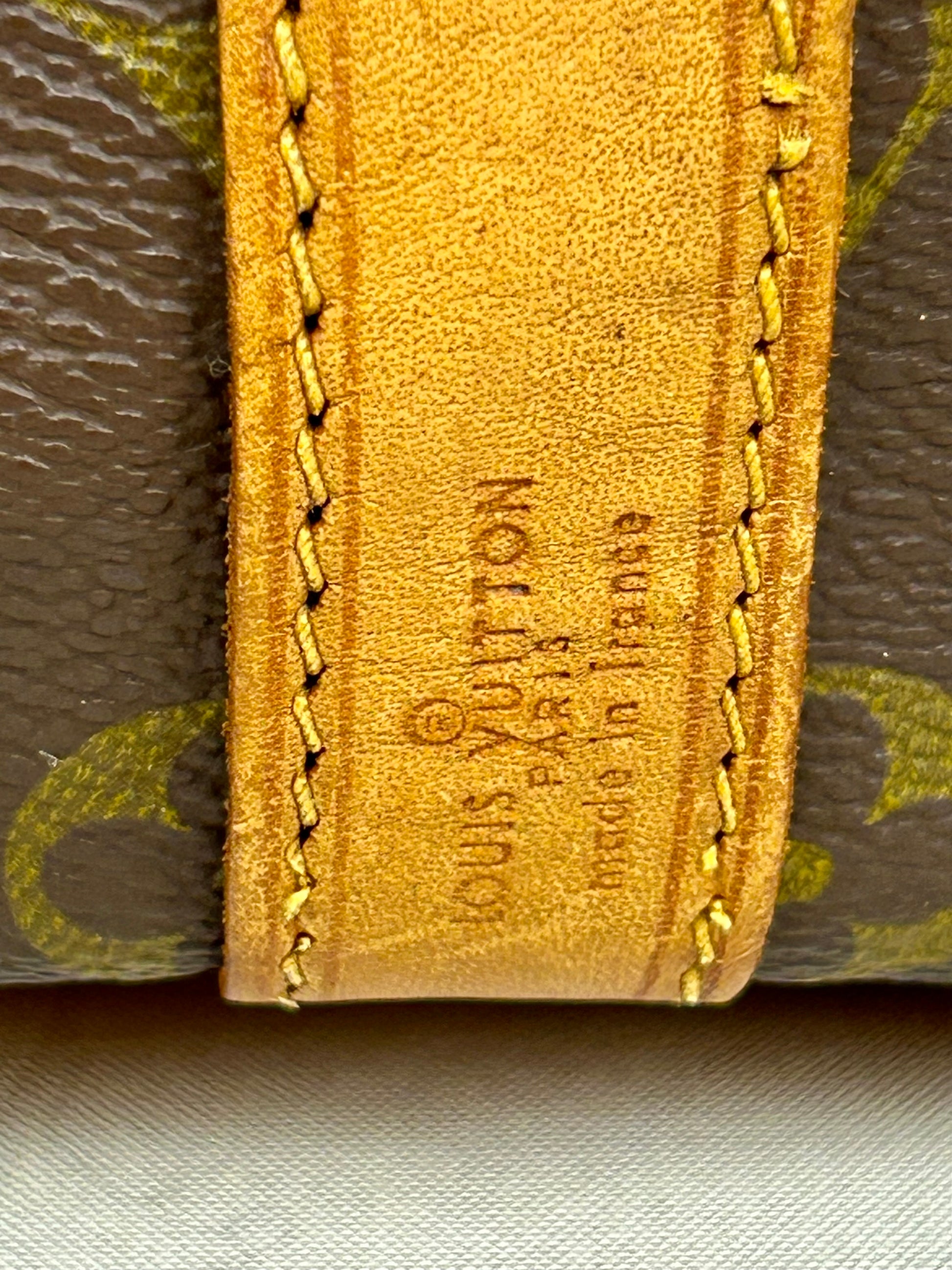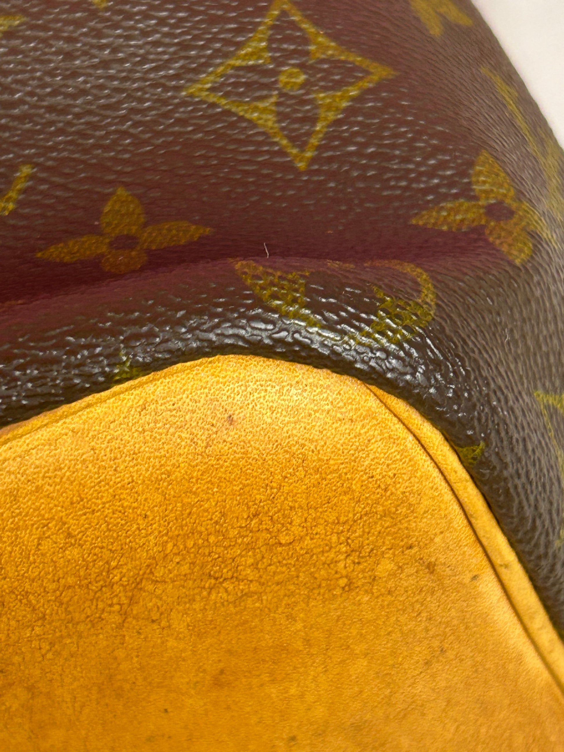 💜 Description: Canvas is in great condition, no cracks or tears. Leather has watermarks throughout, but mostly an even patina. Strap shows normal usage, does have hairline cracks. Chapes are strong. Buckles works properly. Trim has holes and cracks throughout. All rivets are intact. Drawstring is generic. Interior is clean. A classic and versatile piece!