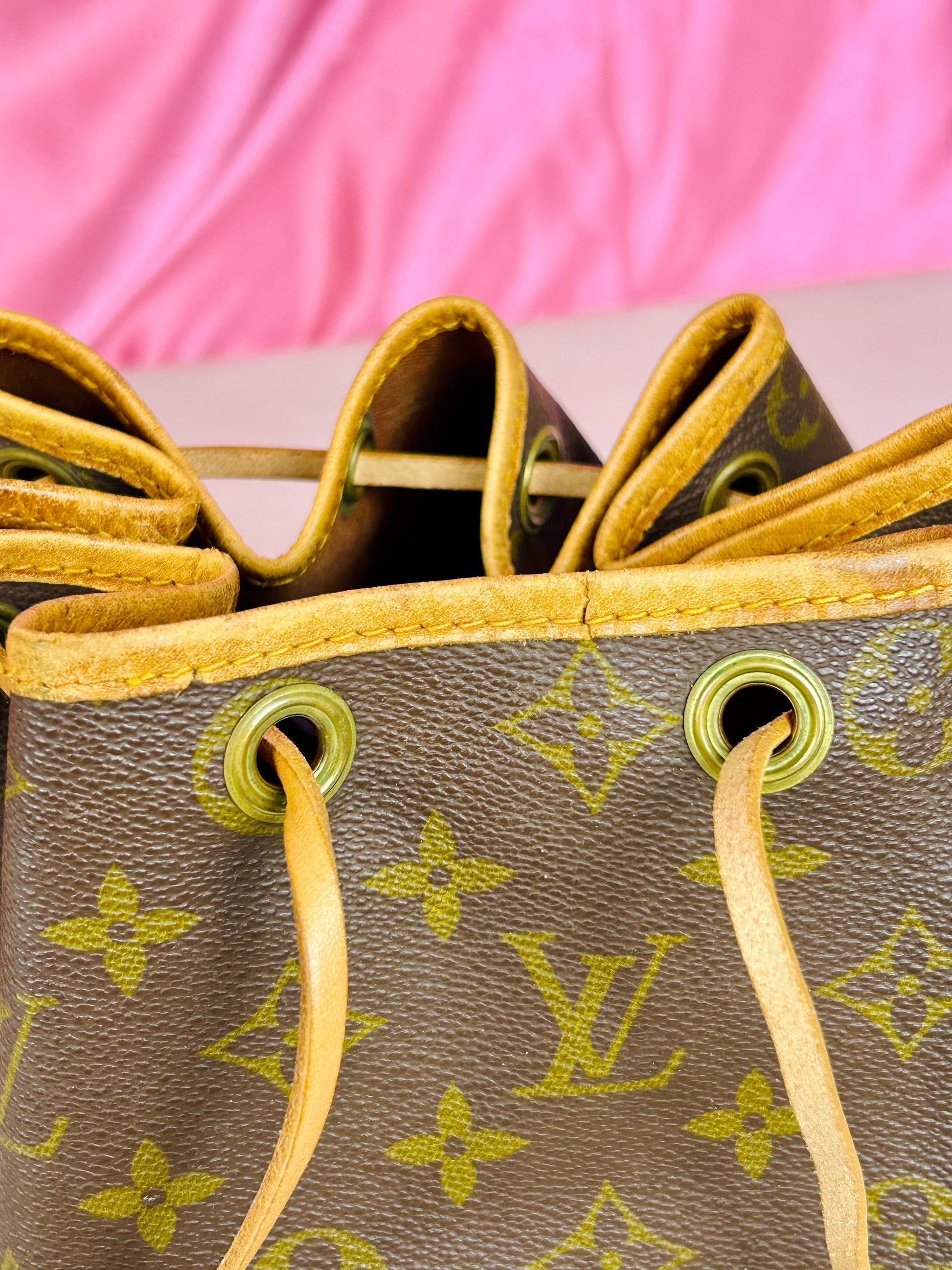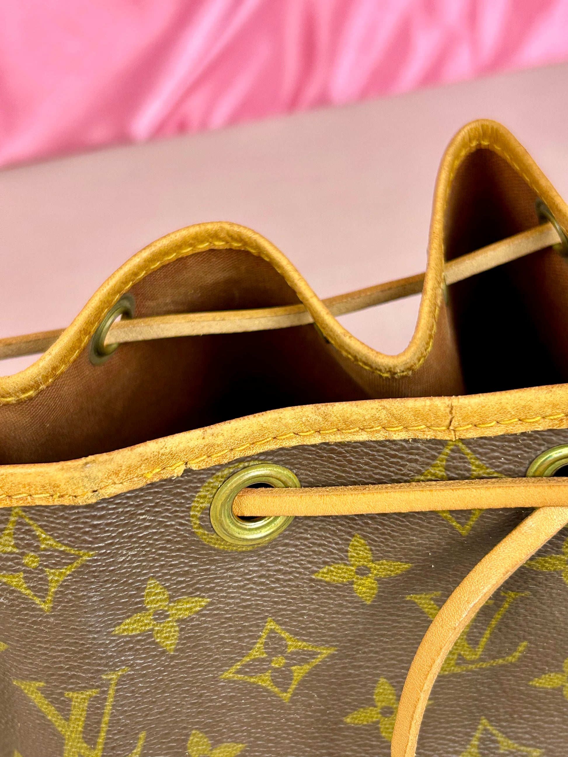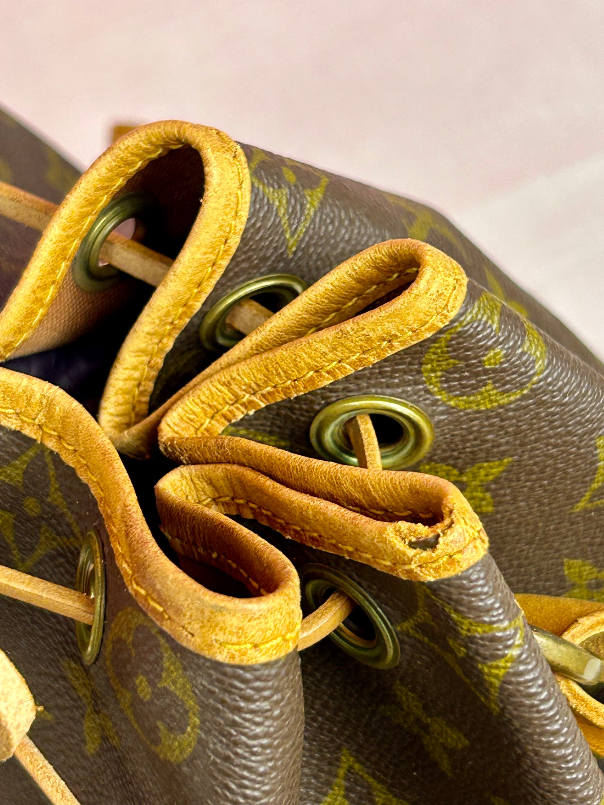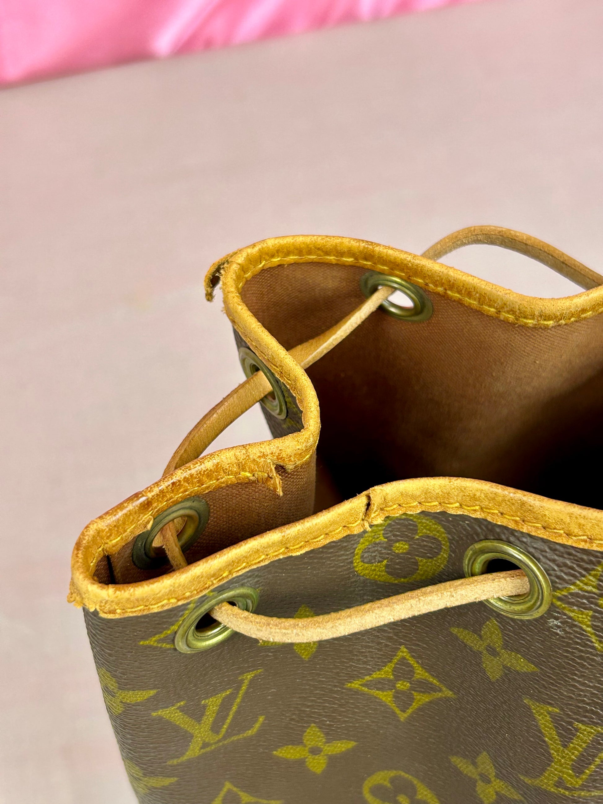 💜 Description: Canvas is in great condition, no cracks or tears. Leather has watermarks throughout, but mostly an even patina. Strap shows normal usage, does have hairline cracks. Chapes are strong. Buckles works properly. Trim has holes and cracks throughout. All rivets are intact. Drawstring is generic. Interior is clean. A classic and versatile piece!